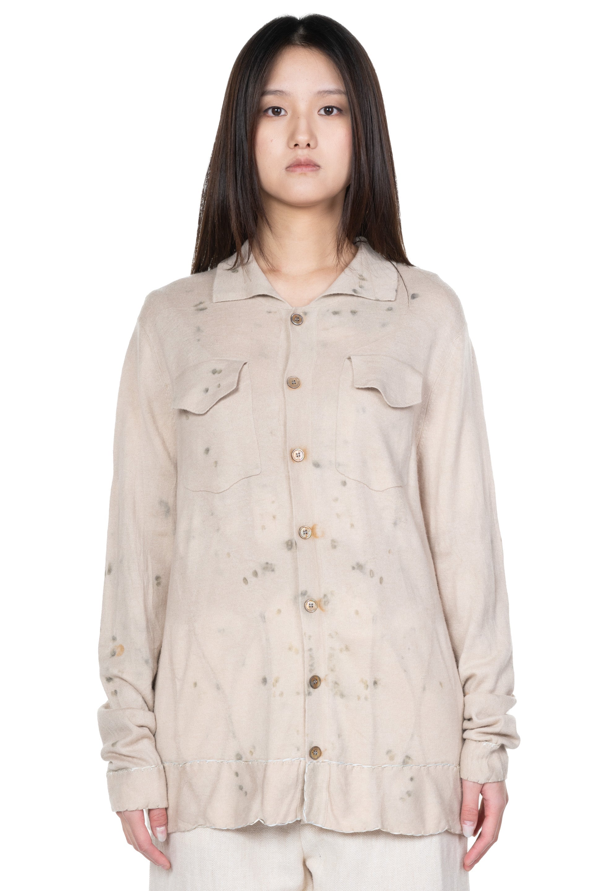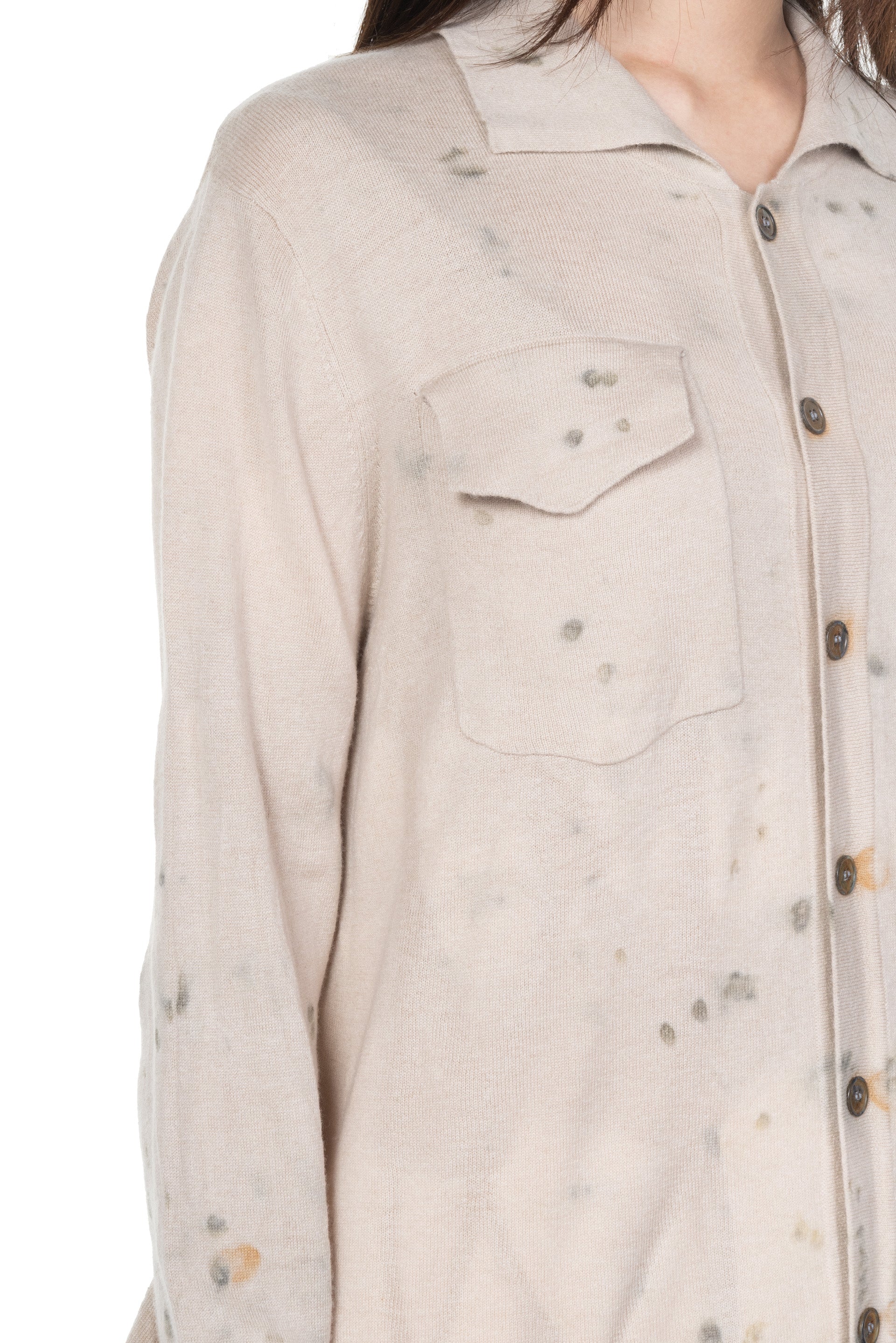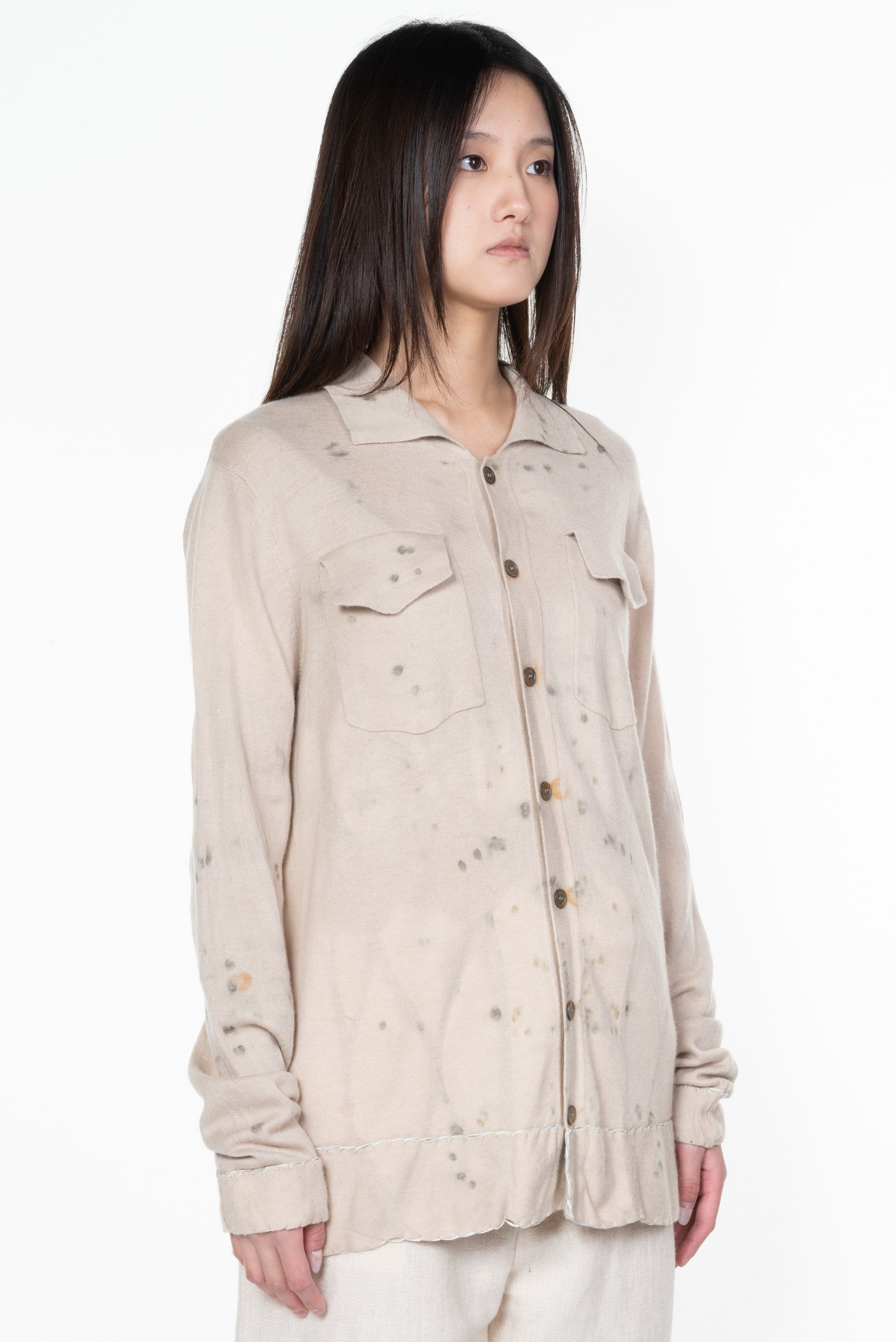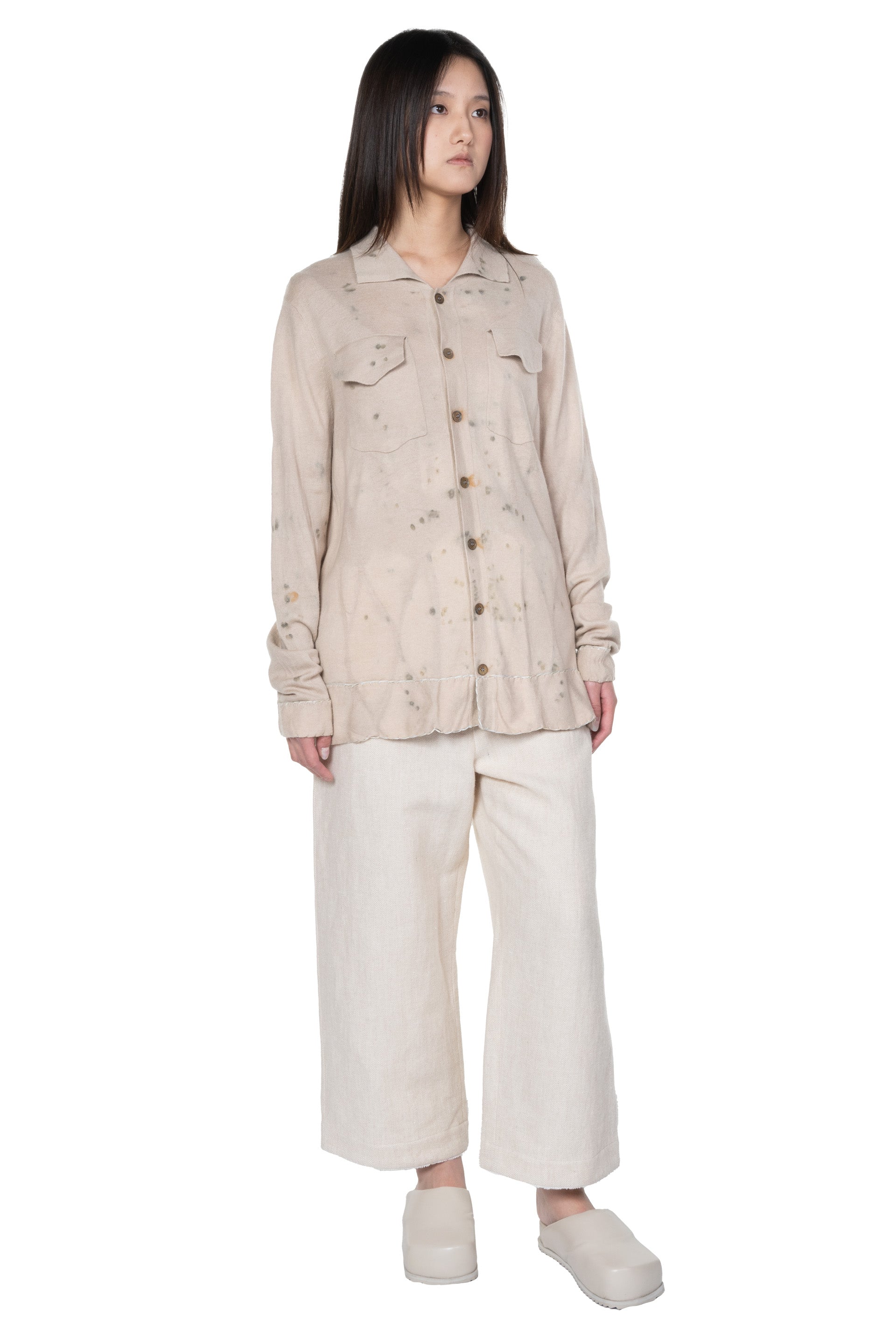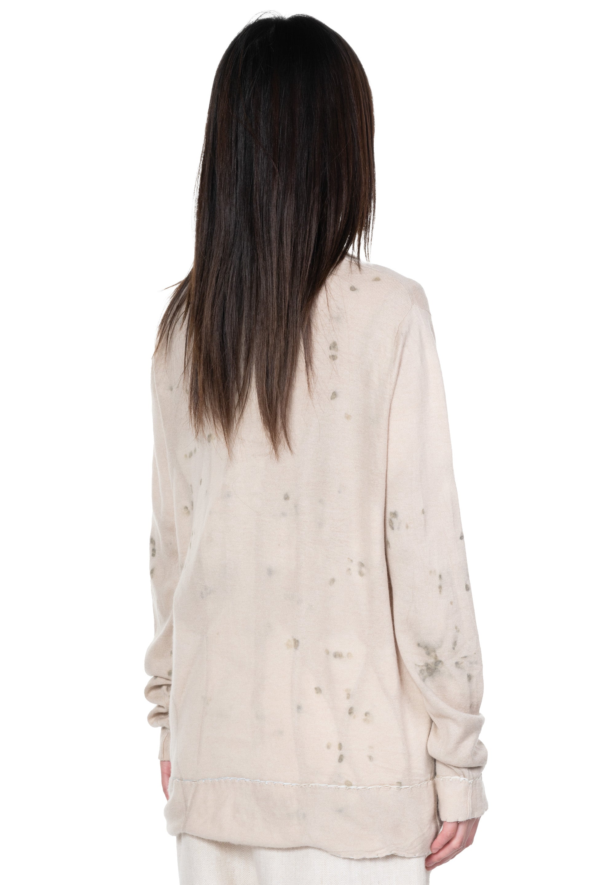 Yu Qun believes that everyone's character is multi-faceted and expressing spiritual independence. Fine hand-stitched threads, old mottled colours and patterns, and unconventional cuts are what Mute Dance has been exploring. The leaves and stems of fresh plants and berries, dried medicinal materials, old metals and so on are combined with the ancient and traditional dyeing technology to dye fabrics and paper as seen with the Dyed Knitted Blouse.
