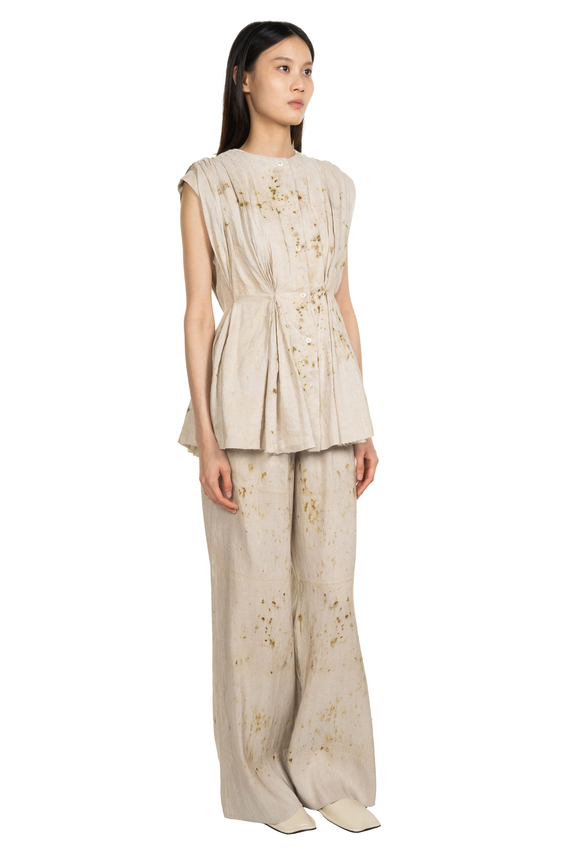 Yu Qun believes that everyone's character is multi-faceted and expressing spiritual independence. Fine hand-stitched threads, old mottled colours and patterns, and unconventional cuts are what Mute Dance has been exploring. The leaves and stems of fresh plants and berries, dried medicinal materials, old metals and so on are combined with the ancient and traditional dyeing technology to dye fabrics and paper as seen with the Dyed Linen and Silk Trousers.