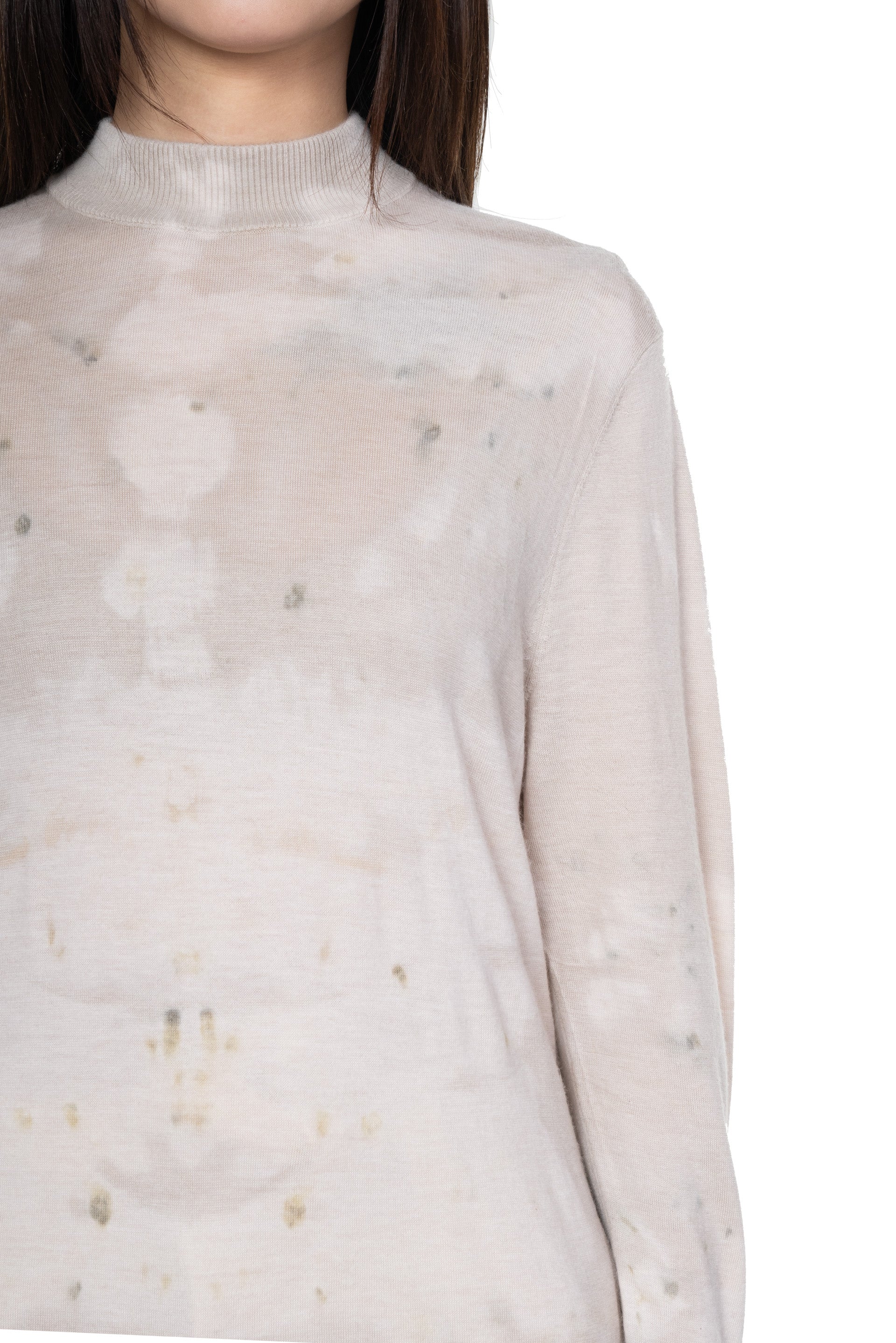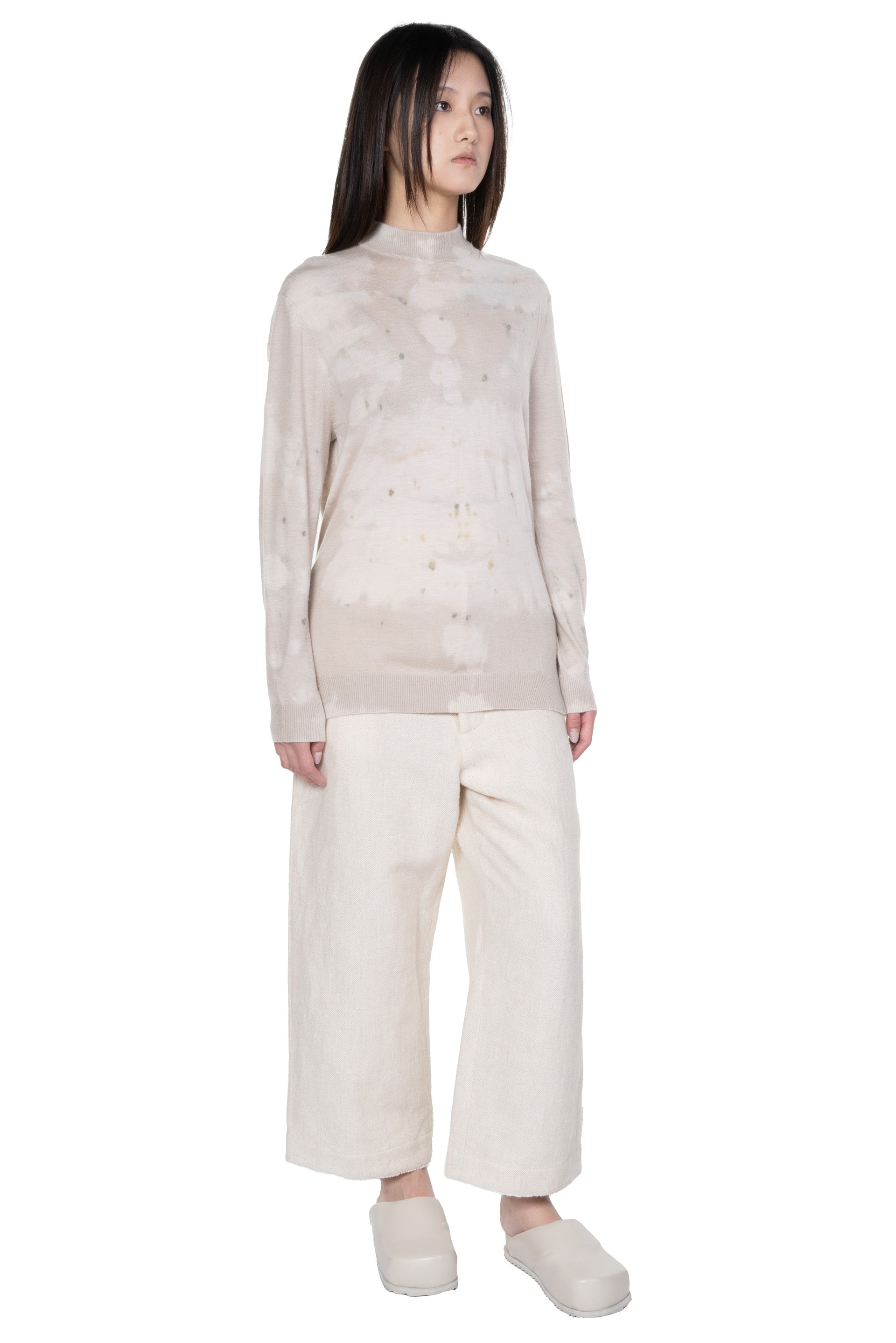 Yu Qun believes that everyone's character is multi-faceted and expressing spiritual independence. Fine hand-stitched threads, old mottled colours and patterns, and unconventional cuts are what Mute Dance has been exploring. The leaves and stems of fresh plants and berries, dried medicinal materials, old metals and so on are combined with the ancient and traditional dyeing technology to dye fabrics and paper as seen with the Dyed Sweater.