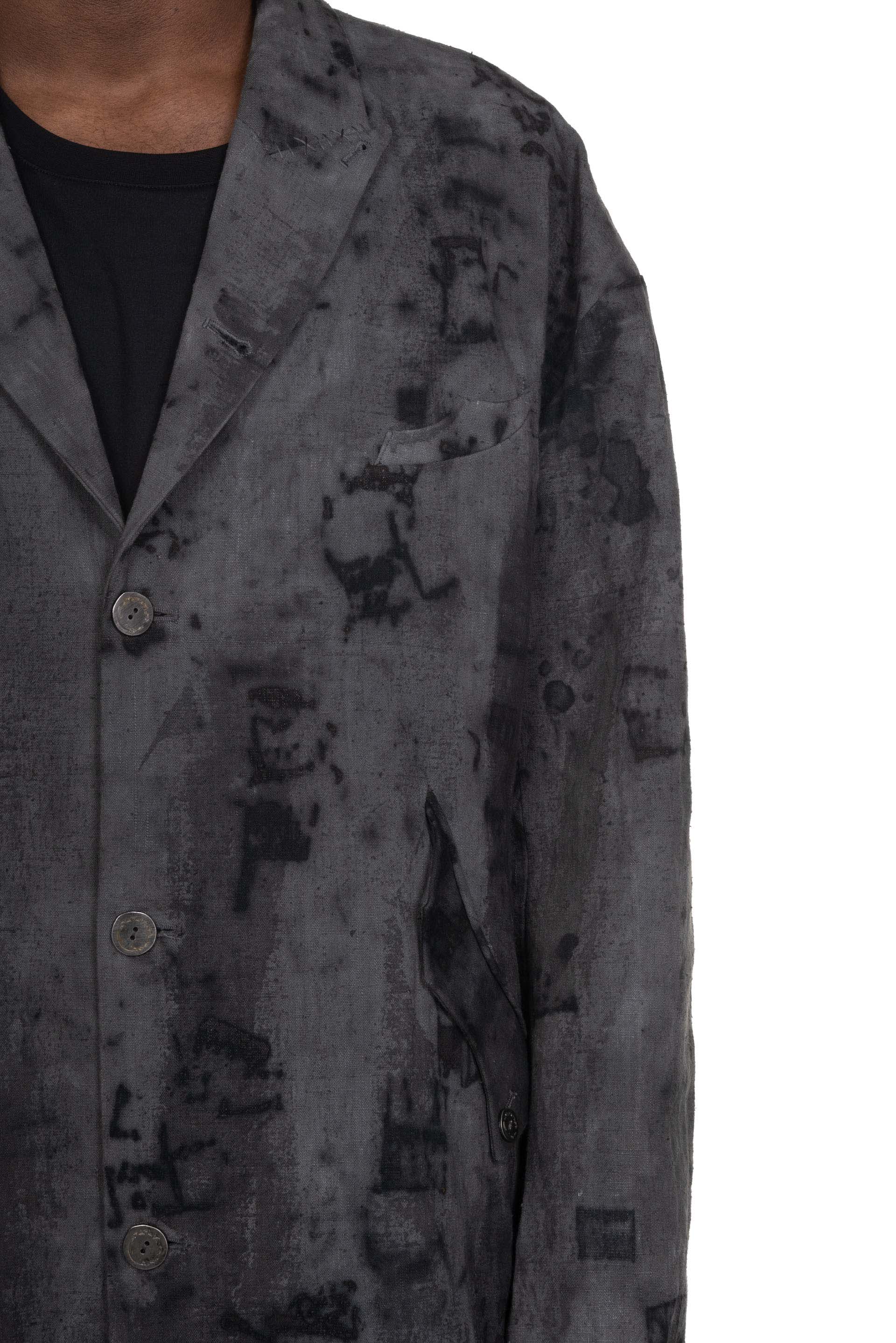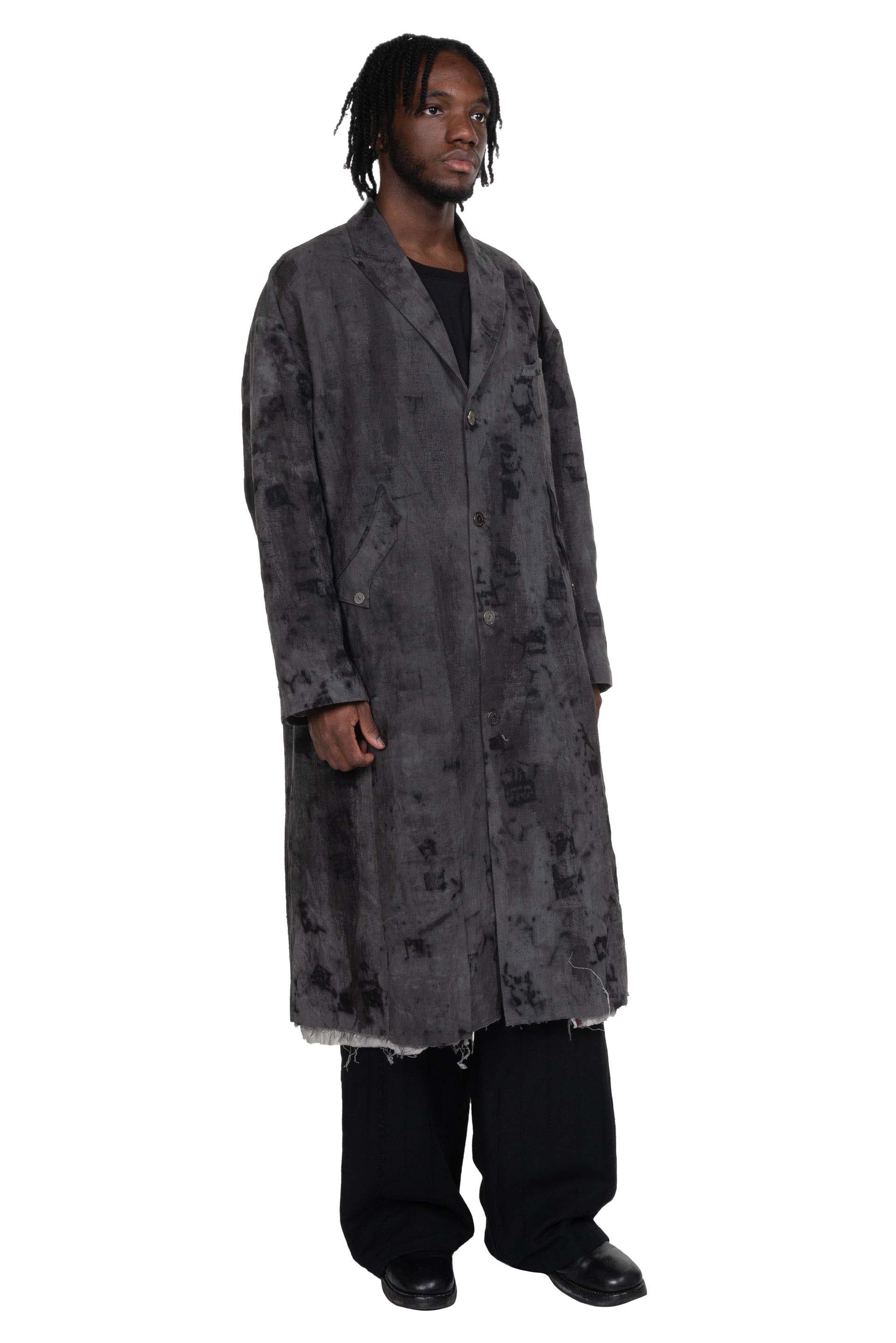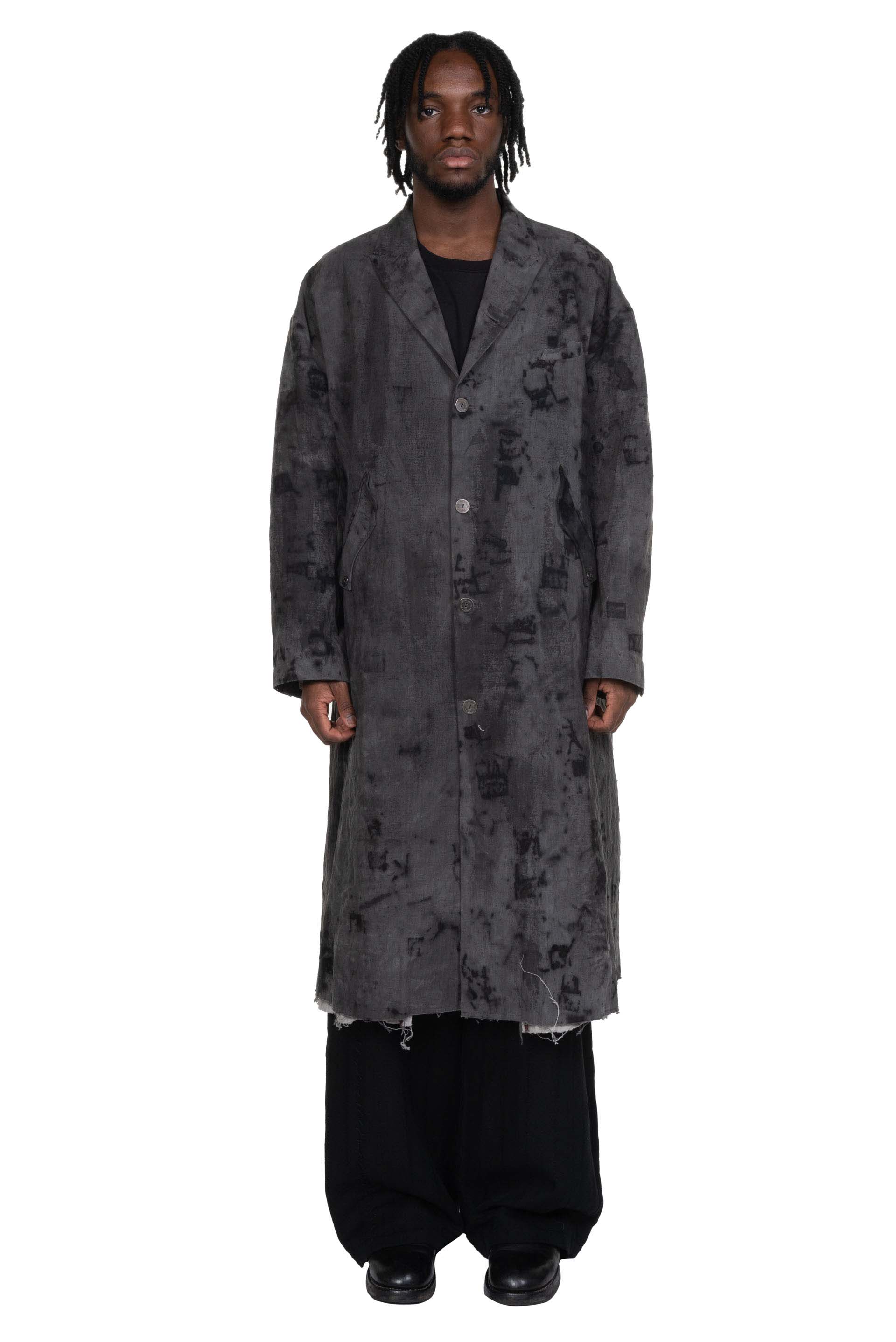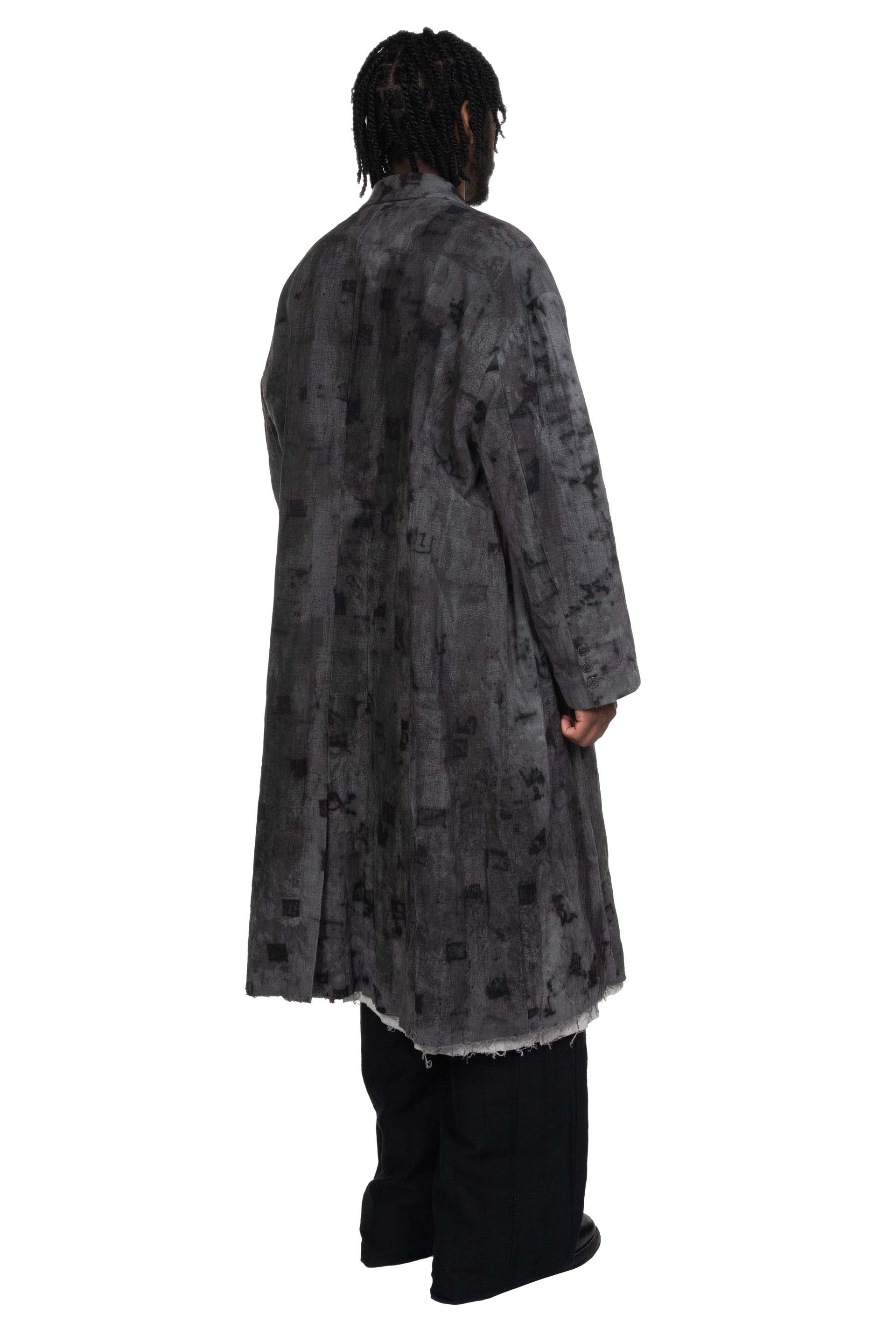 Forgotten Material E Coat Chaos from Professor e. Long sleeves. Two side pockets. Signature metallic button at front and cuffs. Lined with signature printed lining. Button closure at front. Charcoal dye throughout. Distressed throughout. Slightly oversized.