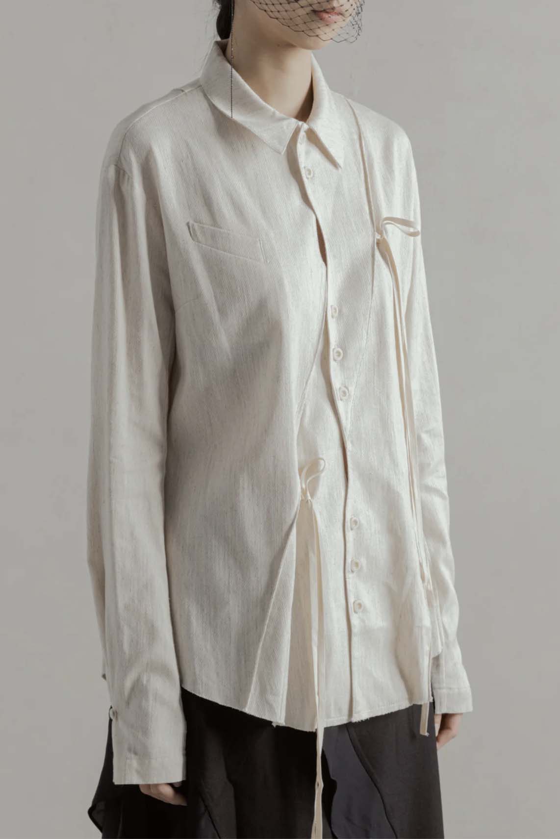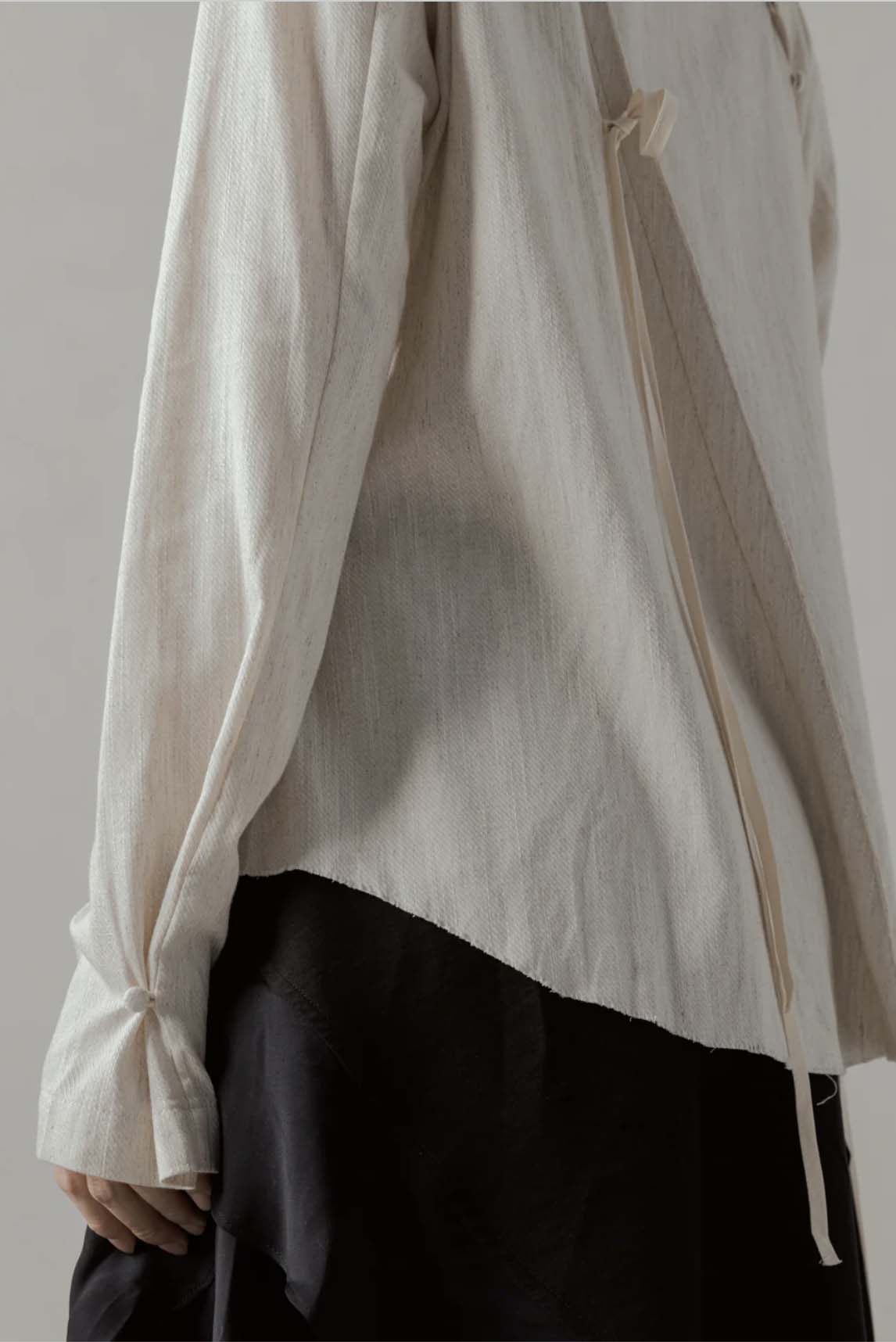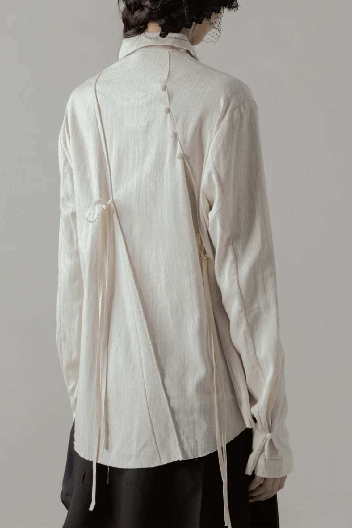 Professor e shirt in natural beige dye. Long sleeves. Button closure at front. Pleated at front and back. Button at cuffs. Panelled construction. String details at back at front.