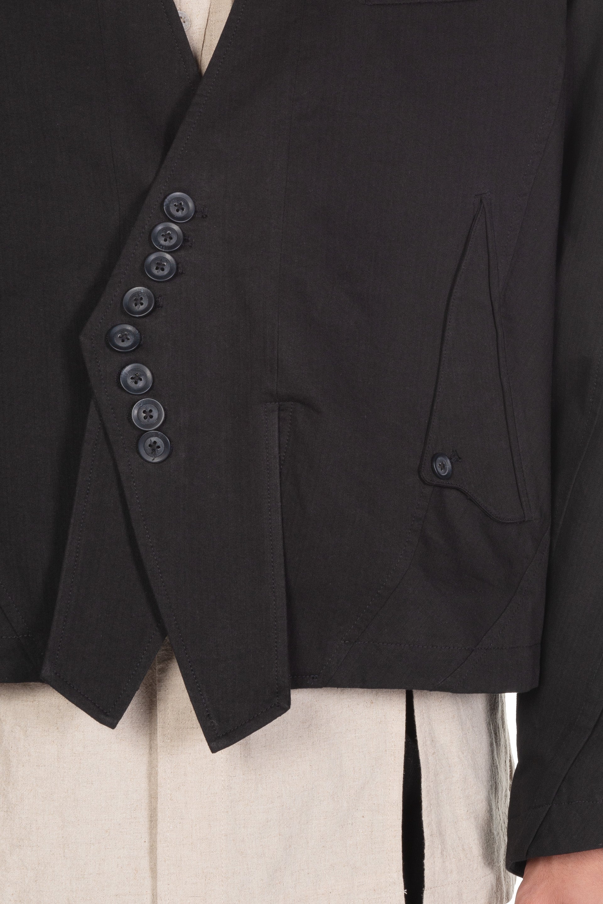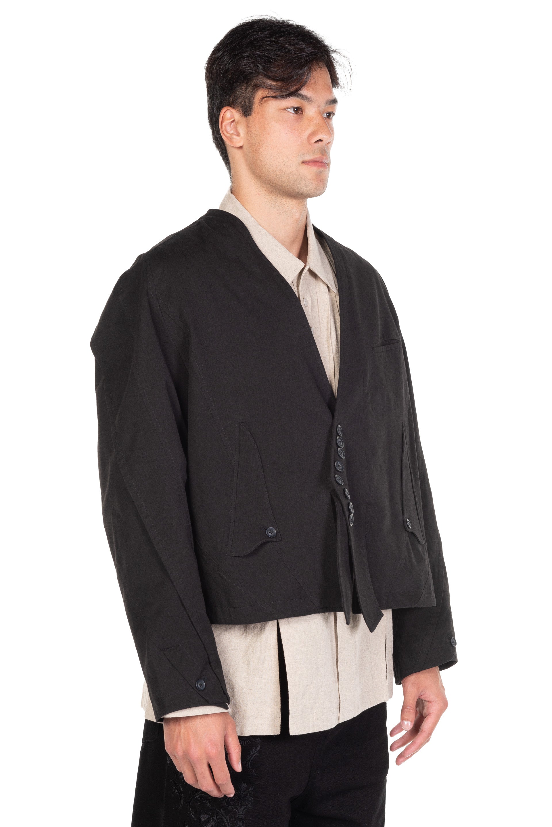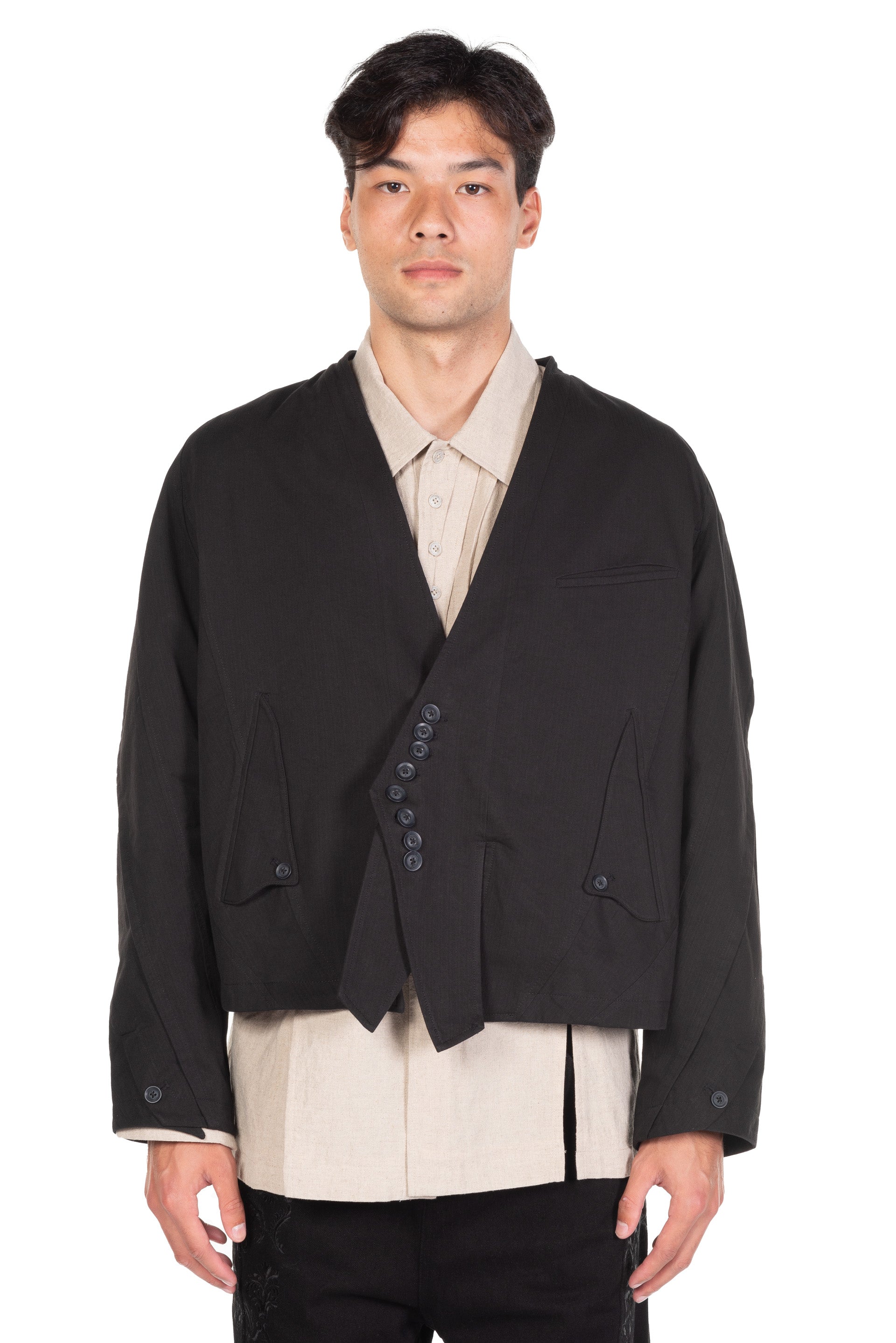 E-Go-Round Jacket. Long sleeves. Dropped shoulder. Button closure at front. Two side pockets. Signature button closure at sleeves. Signature details throughout. Slightly cropped. Boxy fit.