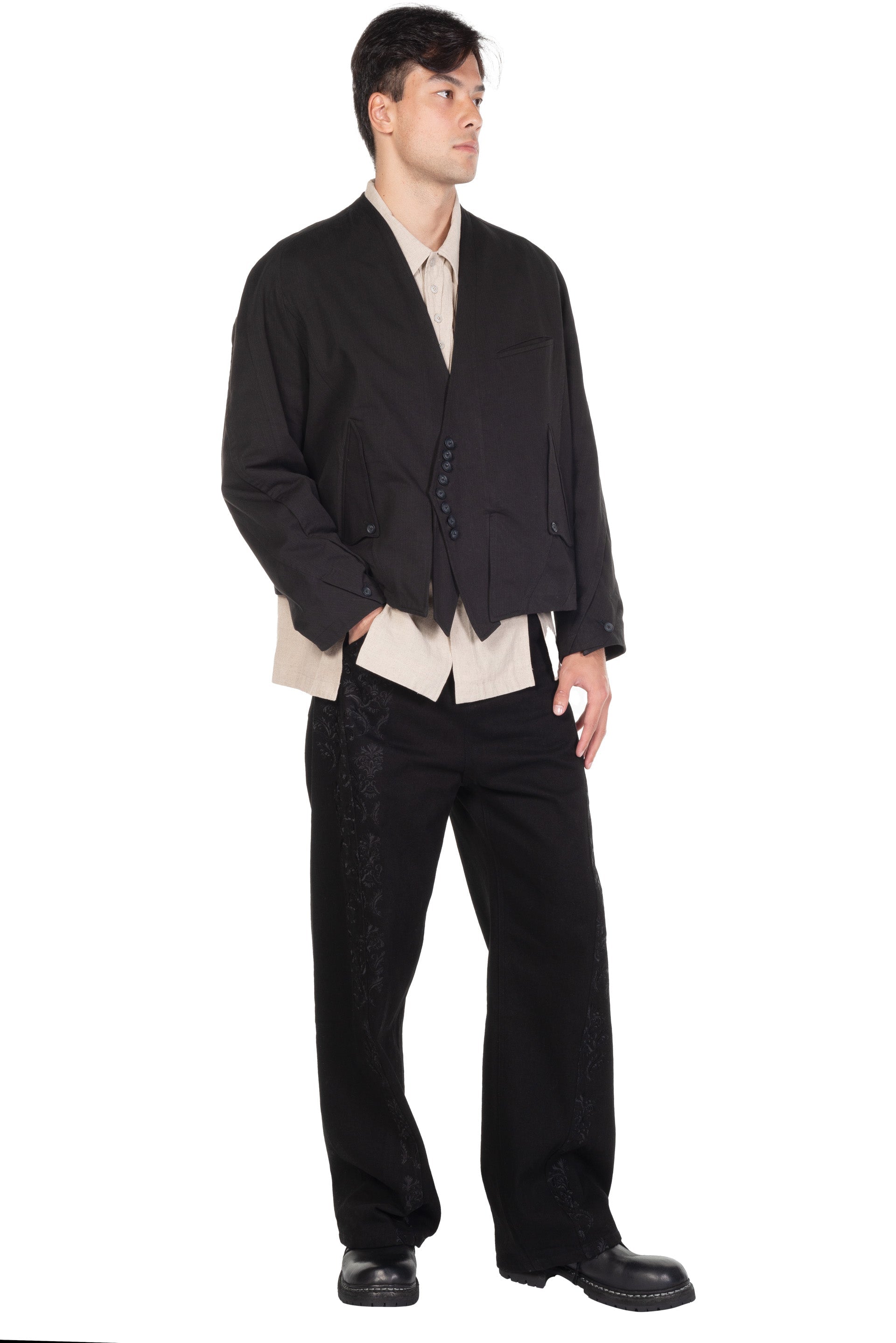 Professor. E understands the time of aesthetics from the use of cotton, hemp and wool. Fabric stitching, patching, designs without edge trimming, deconstruction, and reproduction are all Professor. E's signature elements creating classic immortal designs that can be viewed with the E-Go-Round Jacket.