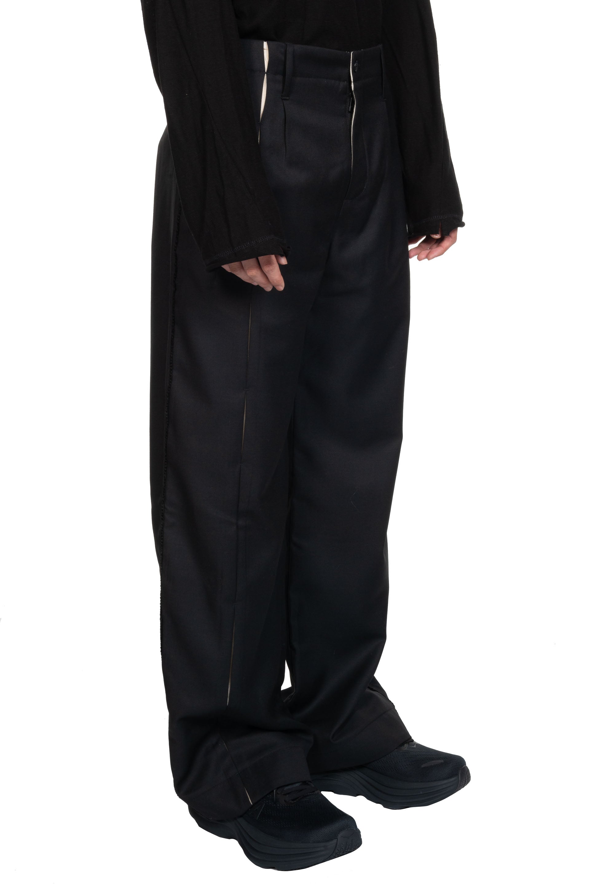 Professor. E E Pants. Button closure at waist. Two side pockets. Open details at front and back at legs.