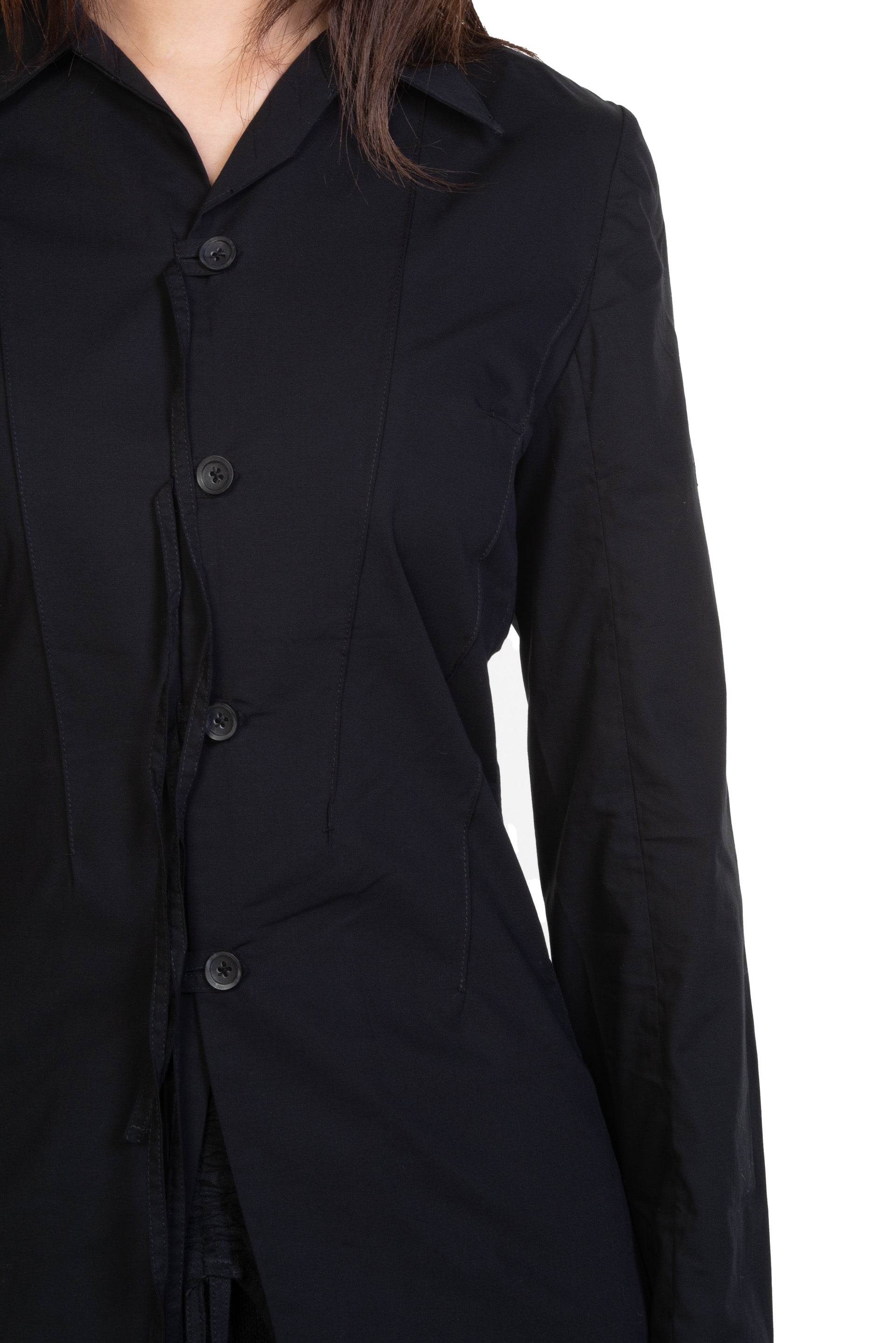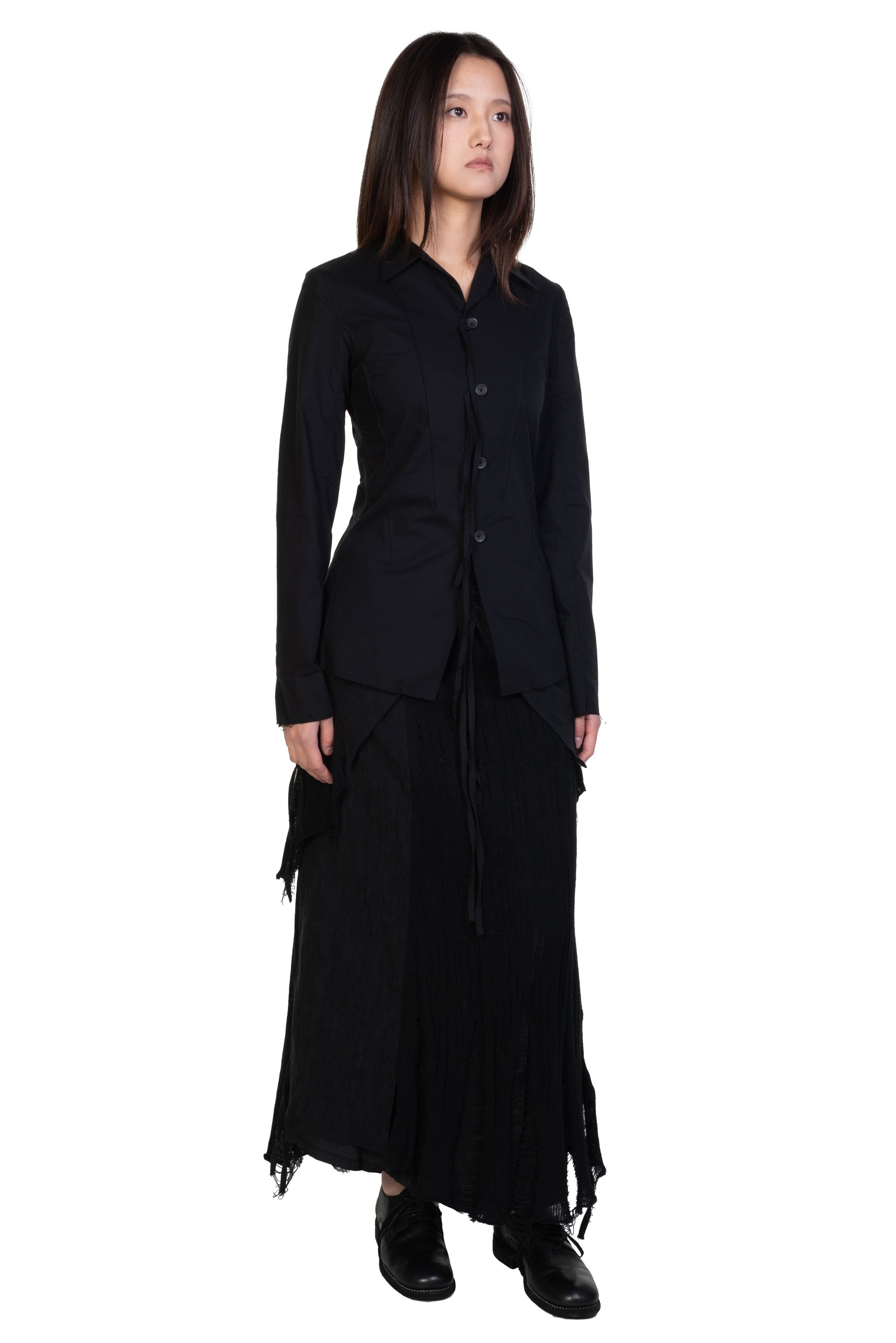 Professor. E E Tie Shirt. Long sleeves. Button closure at front. Button at cuffs. Raw edges. Tie details throughout.