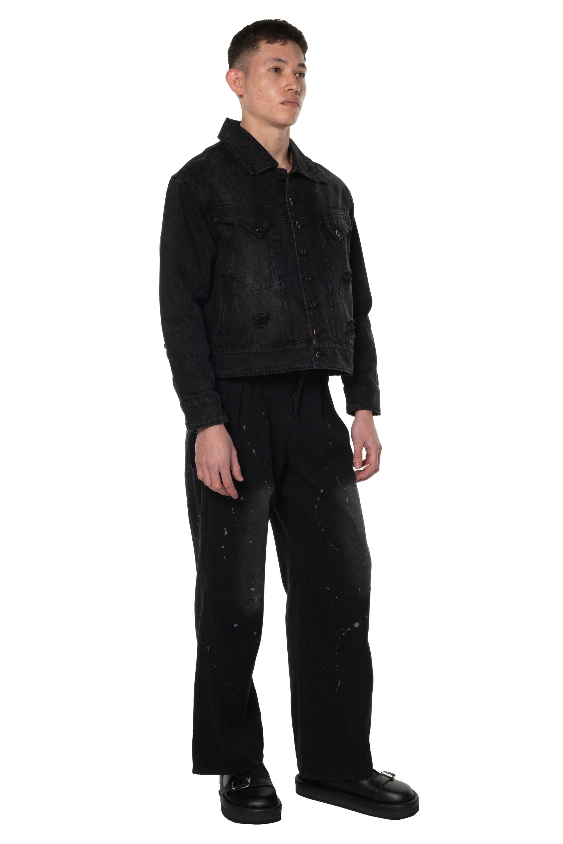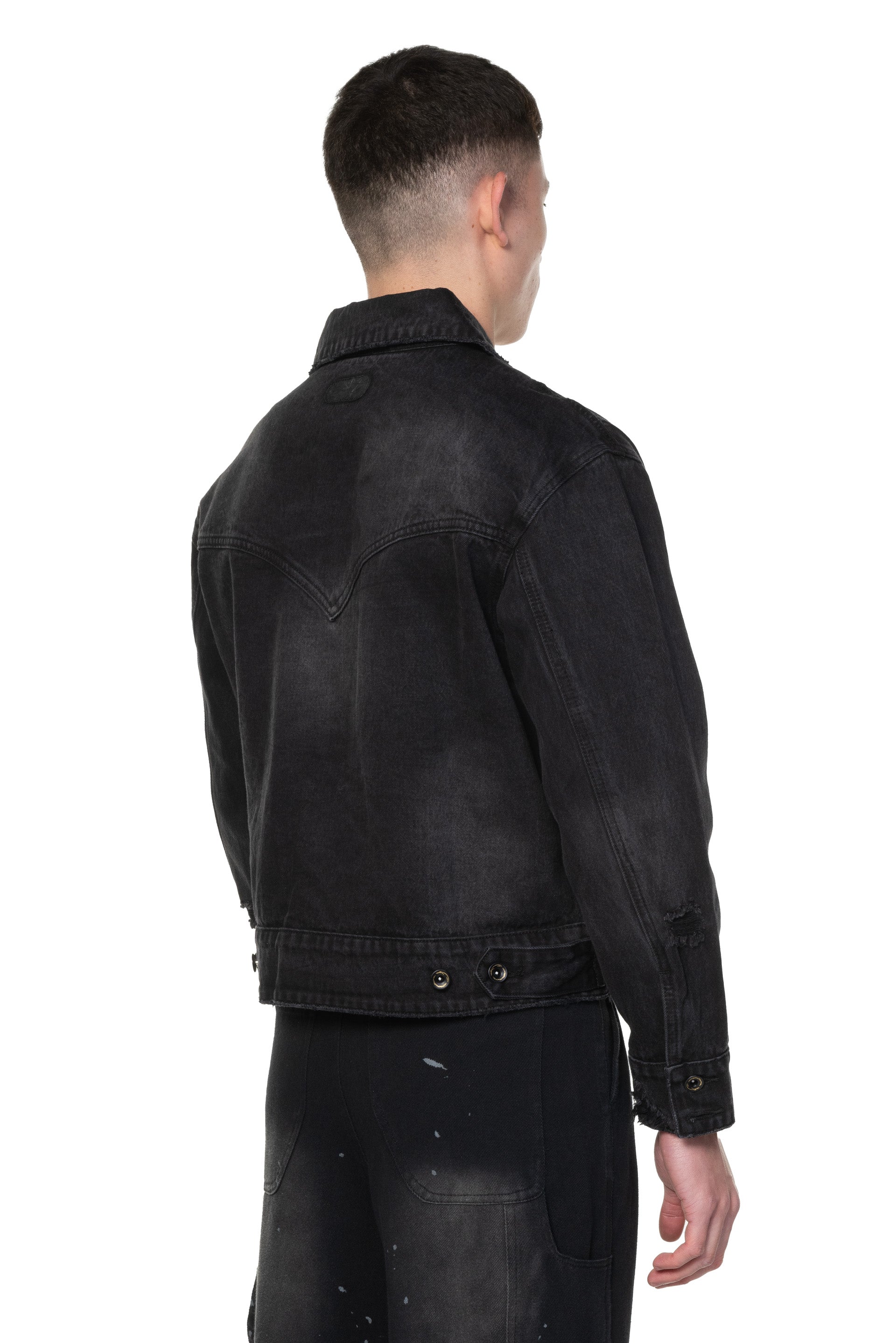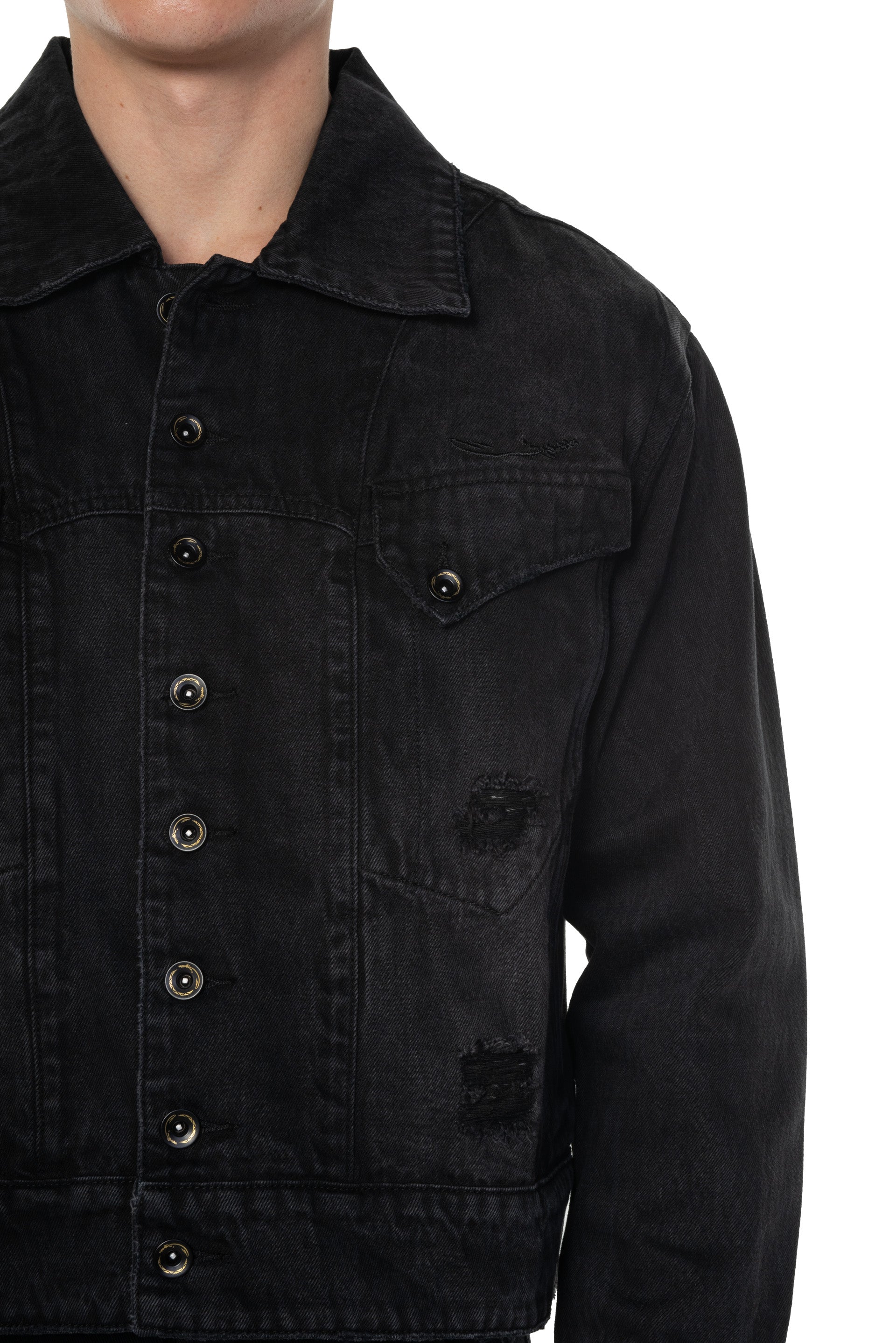 Professor. E E Type 03 Jacket. Boxy cut denim jacket with distressed details throughout. Button closure at front. Long sleeves. Two pockets at chest. Two side pockets. Signature details throughout. Button at cuffs. Buttons at back.