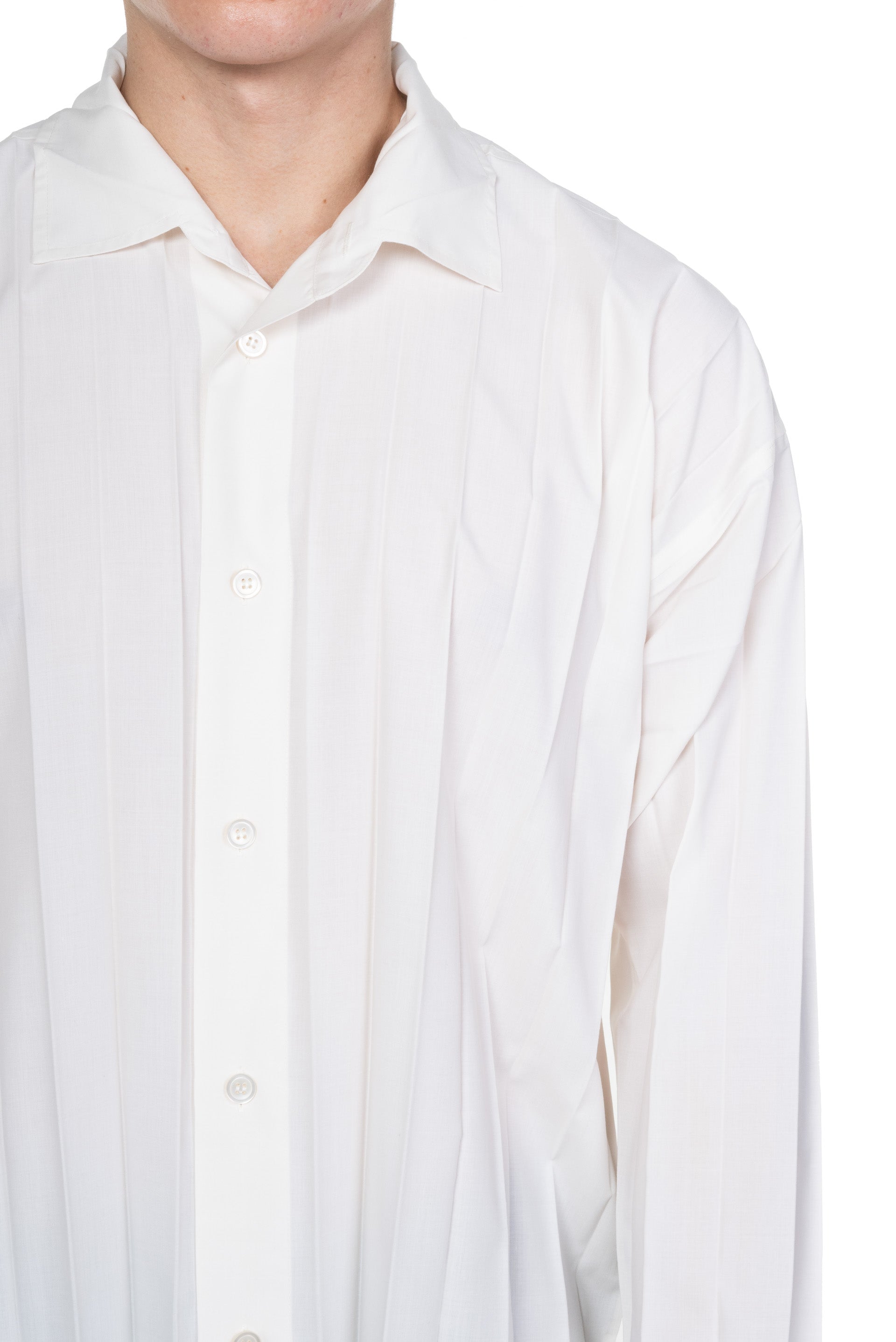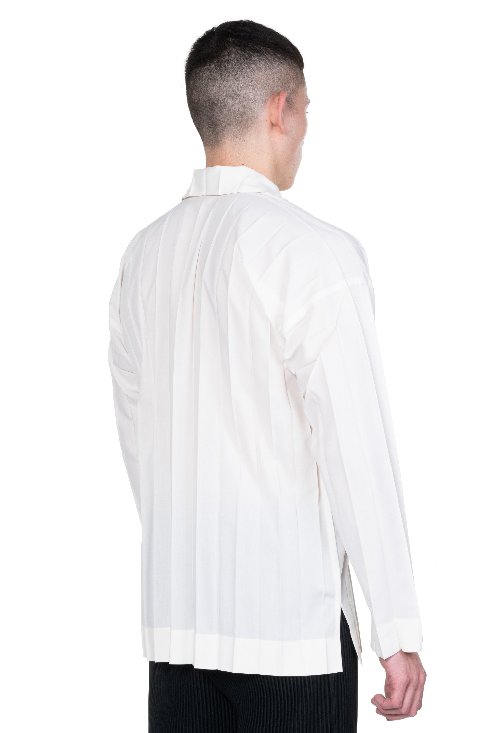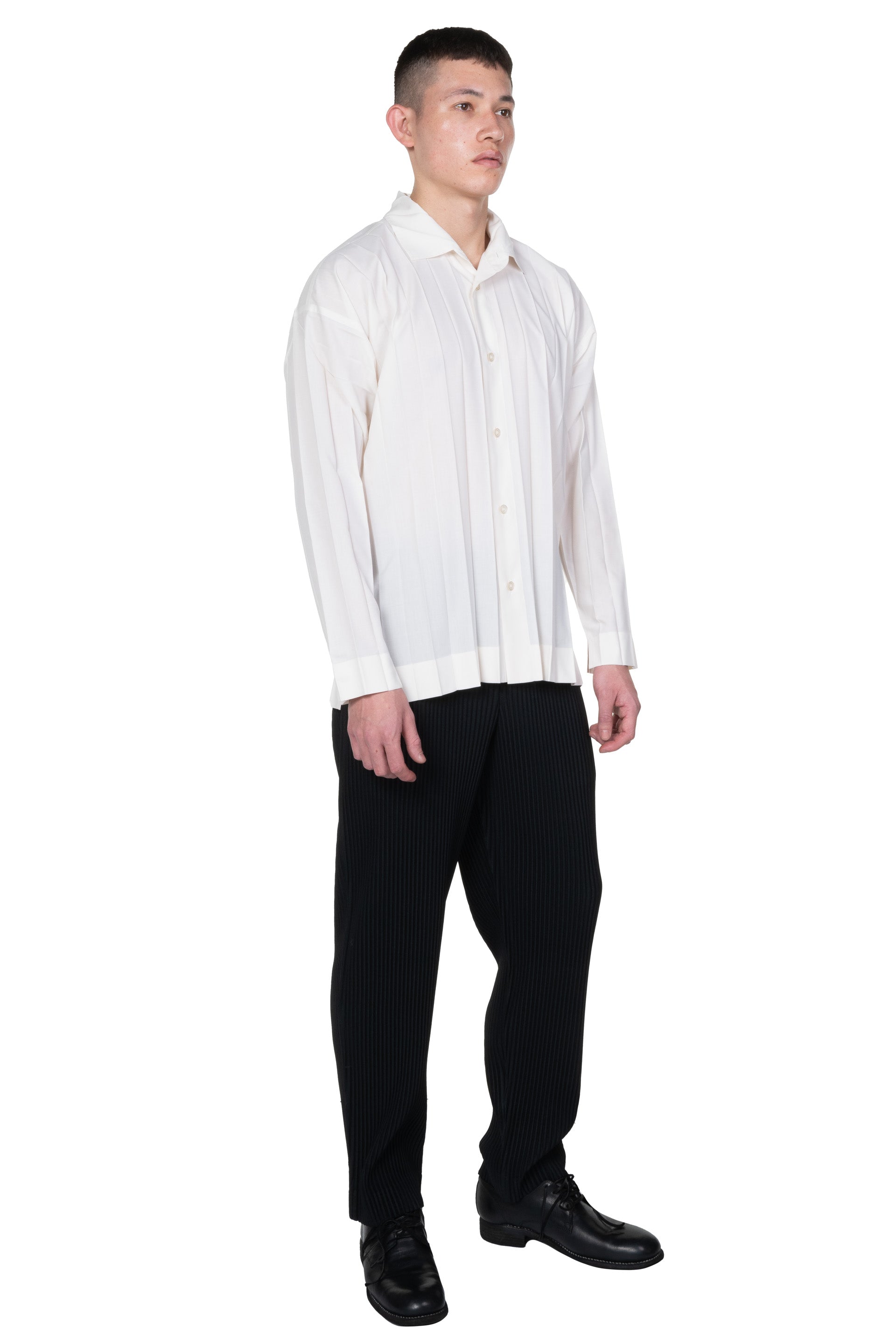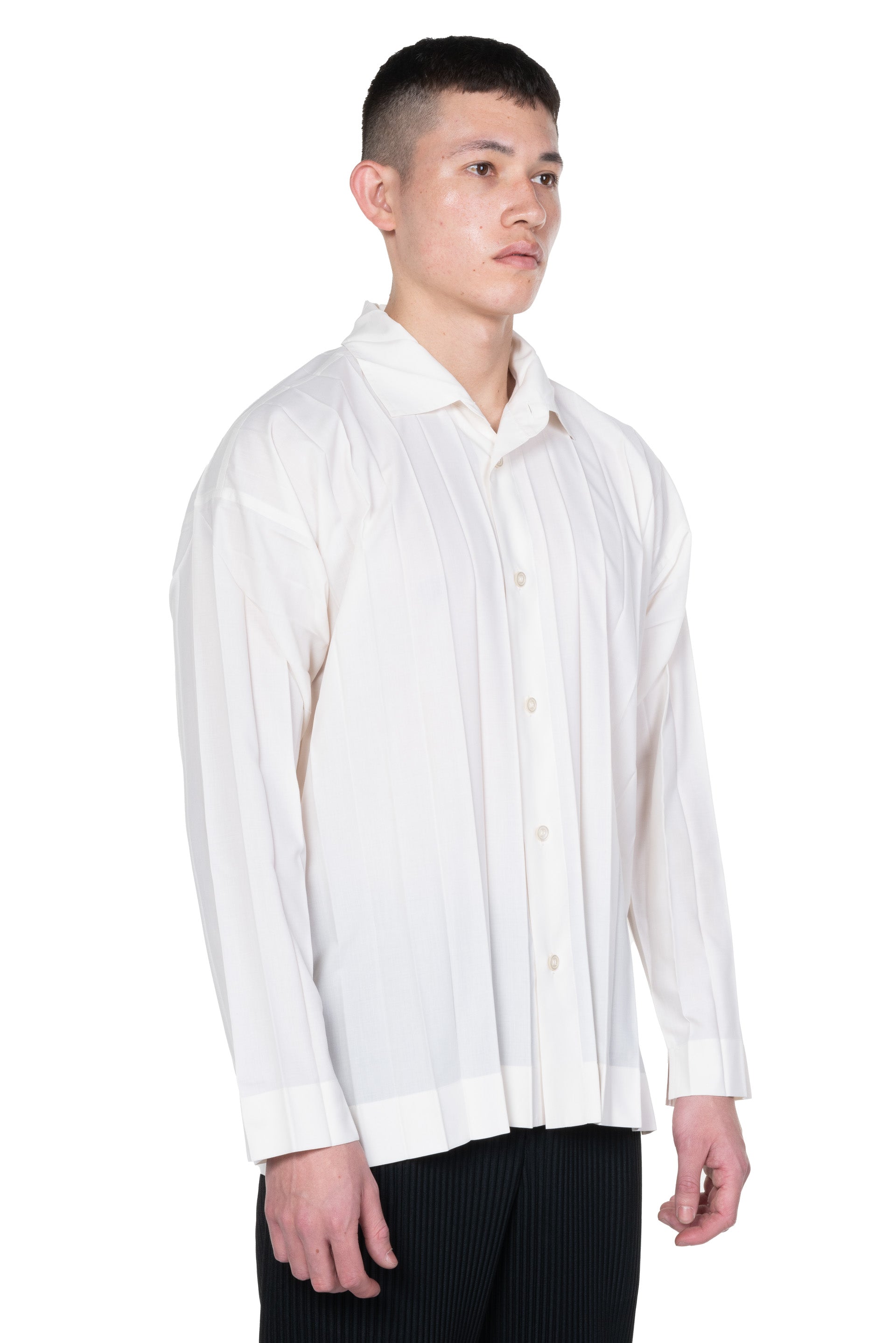 Button closure at front. Long sleeves. Regular collar EDGE SHIRT. Hand pleated and made from a fine polyester fabric.