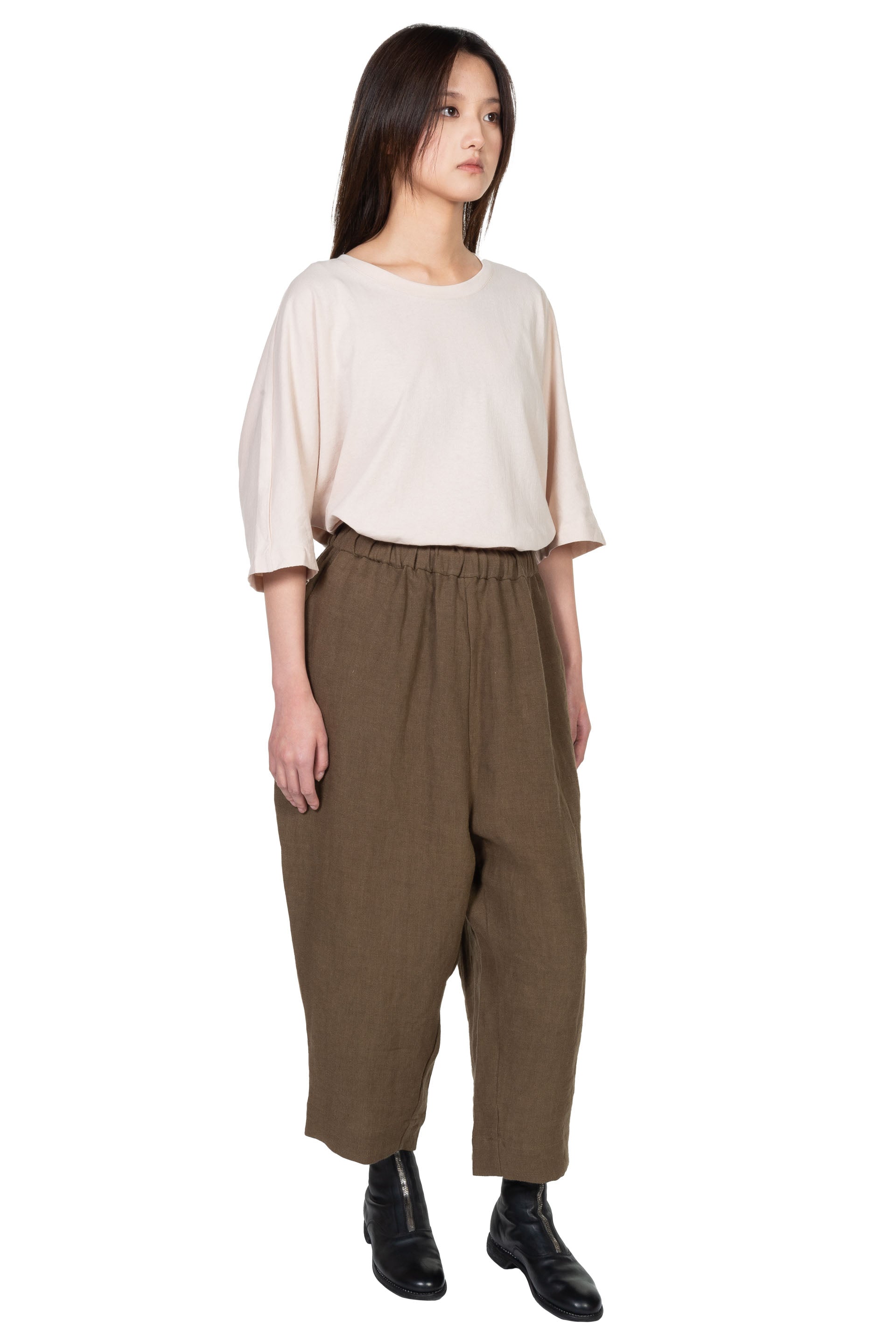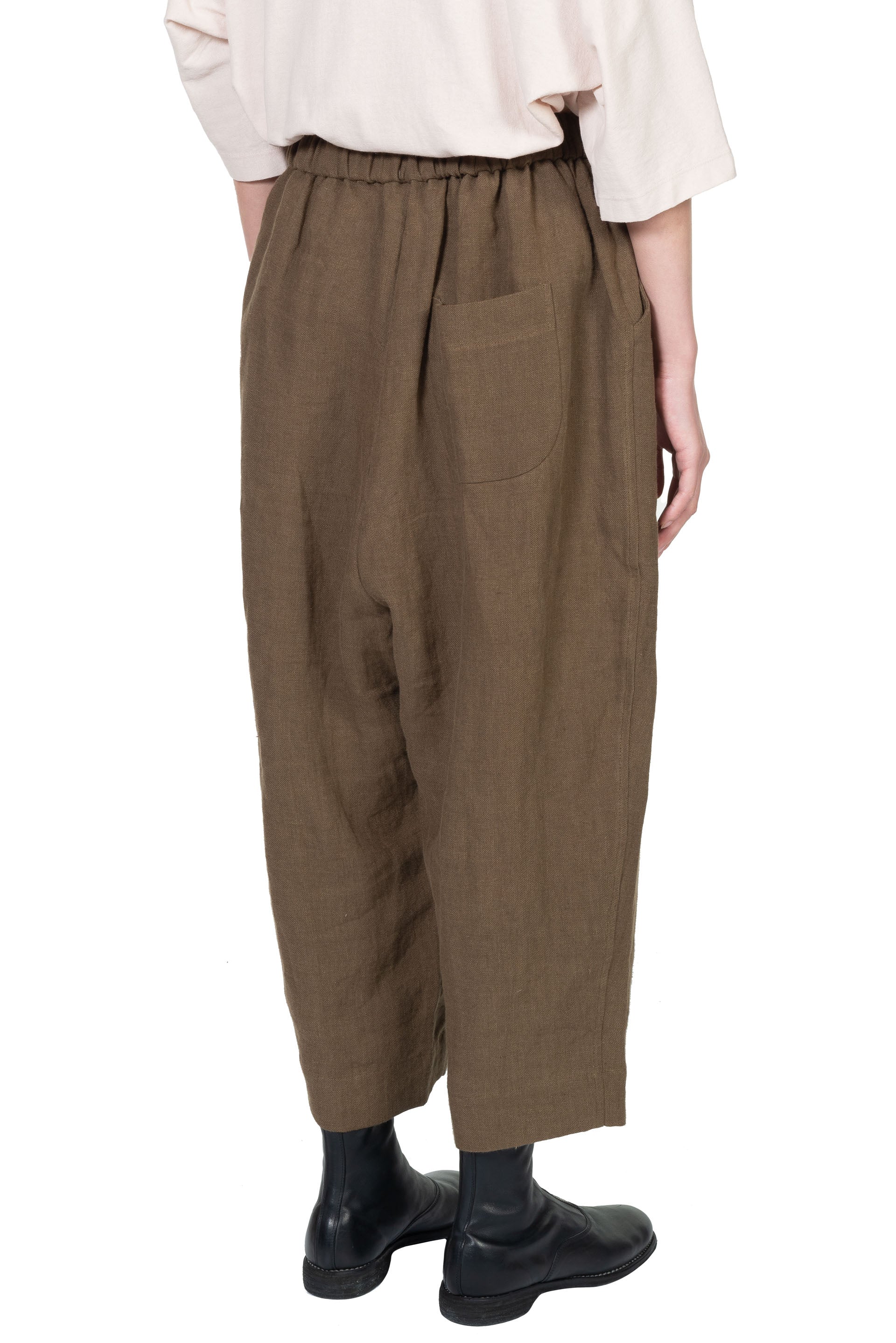Wide cropped trousers. Elastic waist. Two pockets at front and One back pocket. Zip at front. Heavy linen fabric.