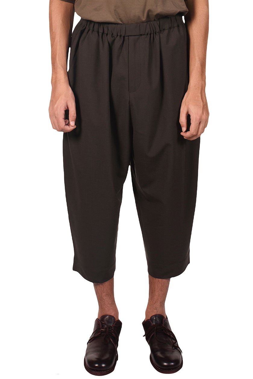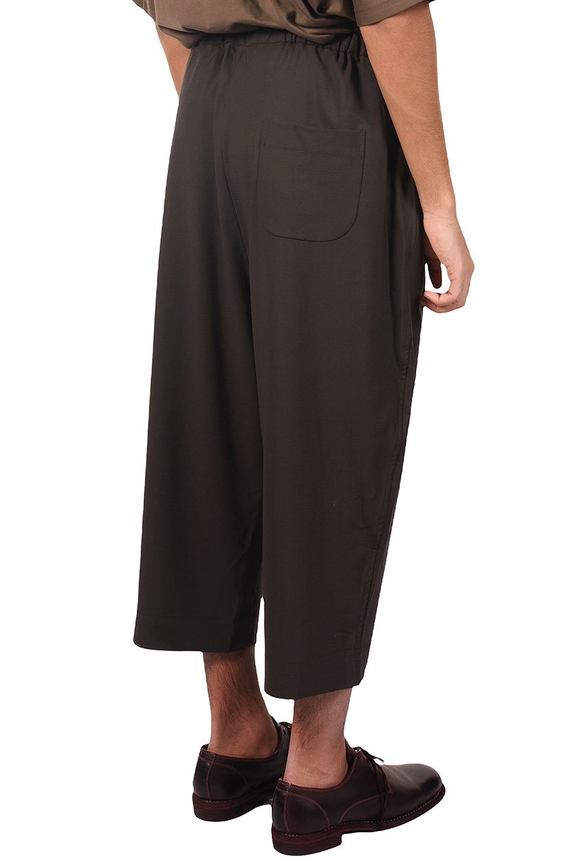 Wide cropped trousers. Elastic waist. Two pockets at front and One back pocket. Zip at front. Stretchy wool fabric.