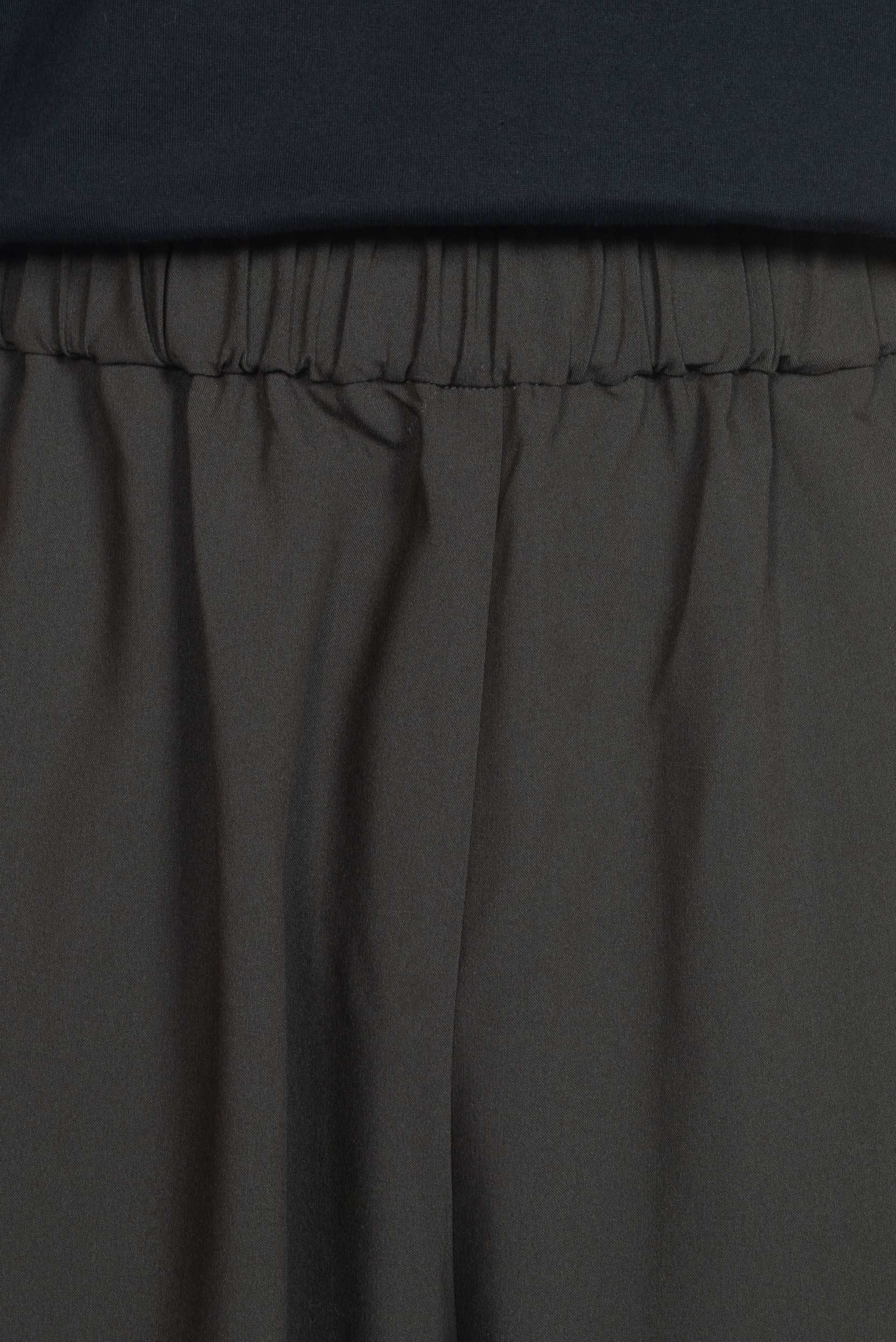 Wide cropped trousers. Elastic waist. Two pockets at front and One back pocket. Zip at front. Stretchy wool fabric.
