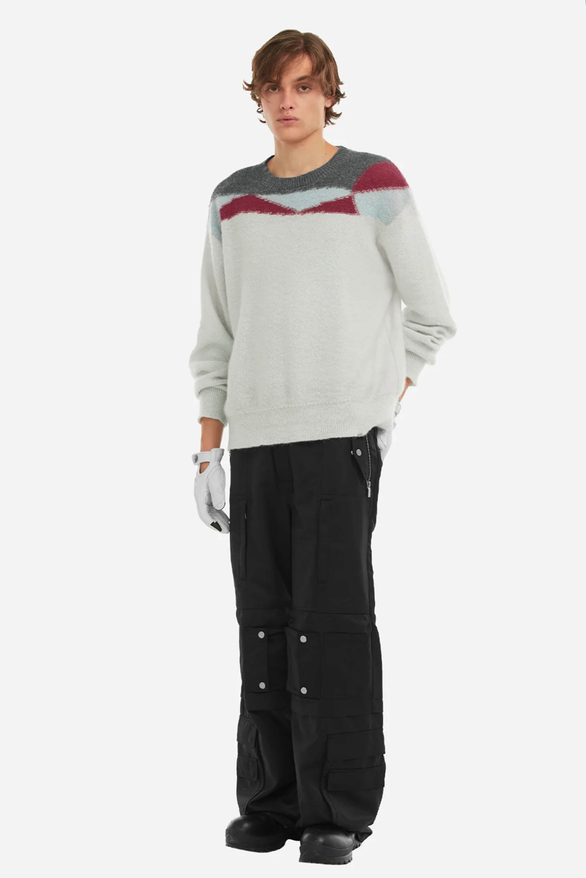 C2H4 concept ranges from hypothetical space scientists producing sport and streetwear-inspired designs creating an intergalactic underground culture. Using her studio as a laboratory, Chen’s meticulously elevates wardrobe cornerstones as seen with the Ellipse Panelled Mohair Sweater Cream.