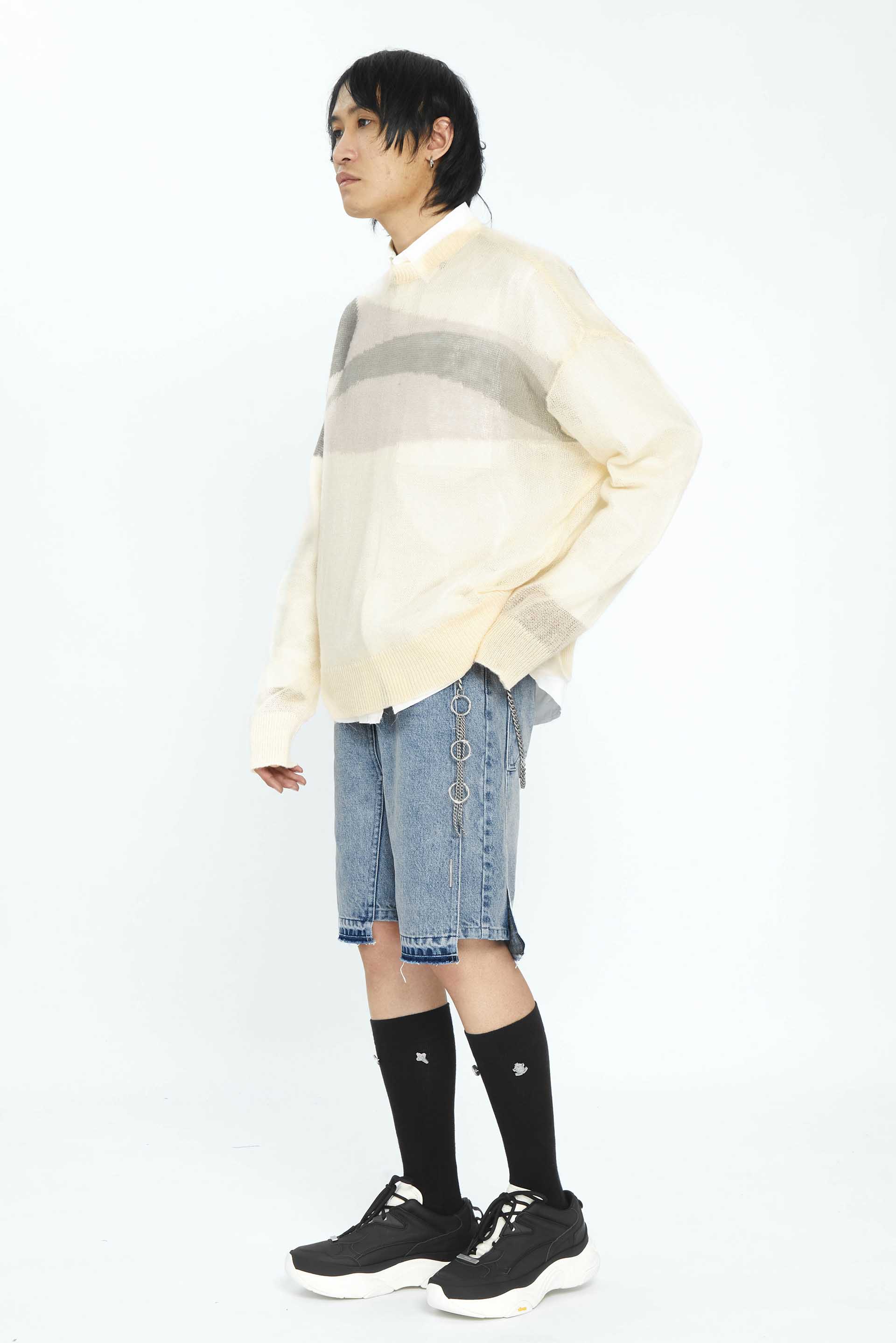 Using her studio as a laboratory, Chen’s meticulously elevates wardrobe cornerstones like sci-fi-inspired graphics as seen with the Ellipse Panelled Mohair Sweater White.