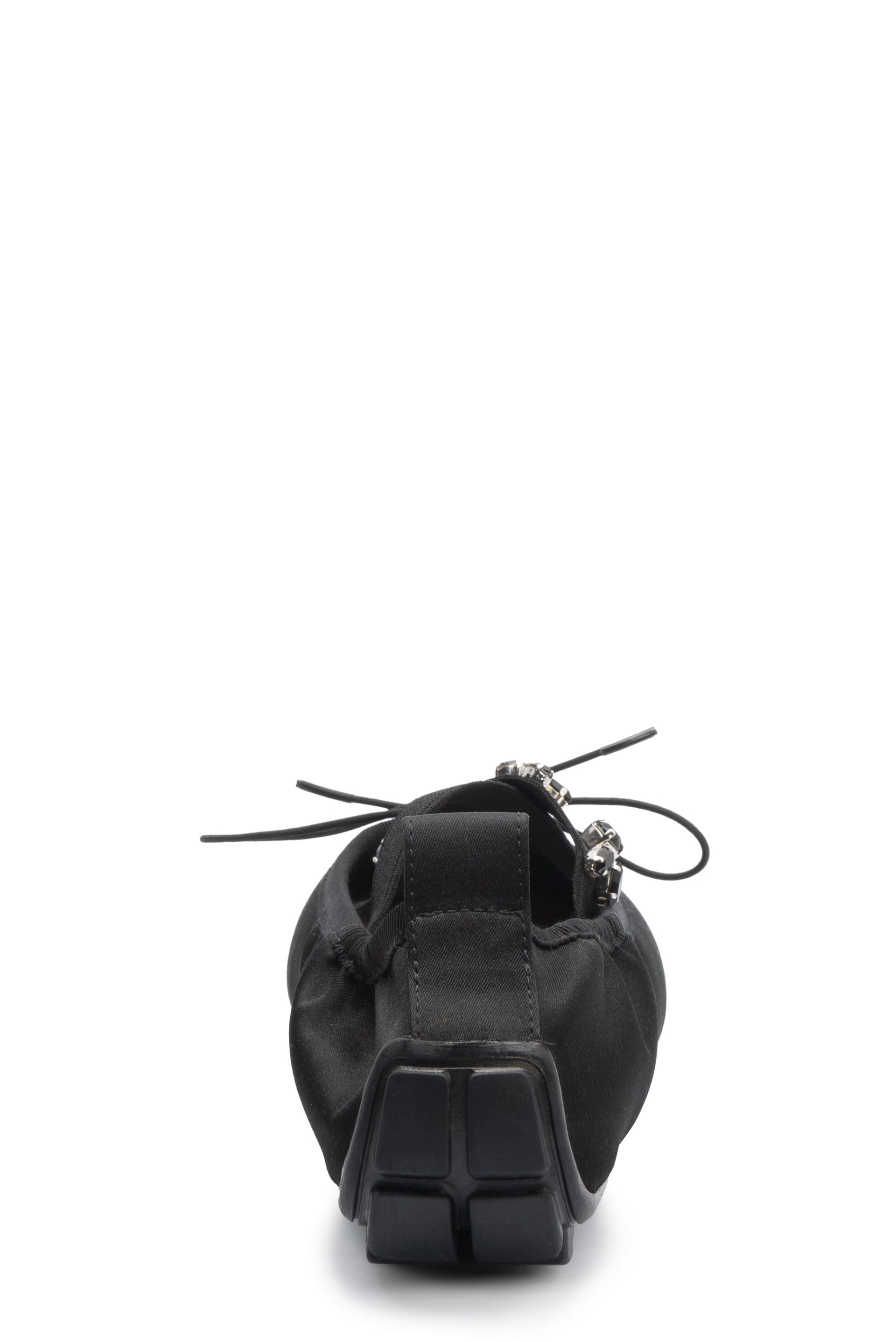 Sporty satin ballerina pump. Seasonal crystal embellishment. Elastic criss-cross strap. Bow ribbon detail. Rubber trek sole
