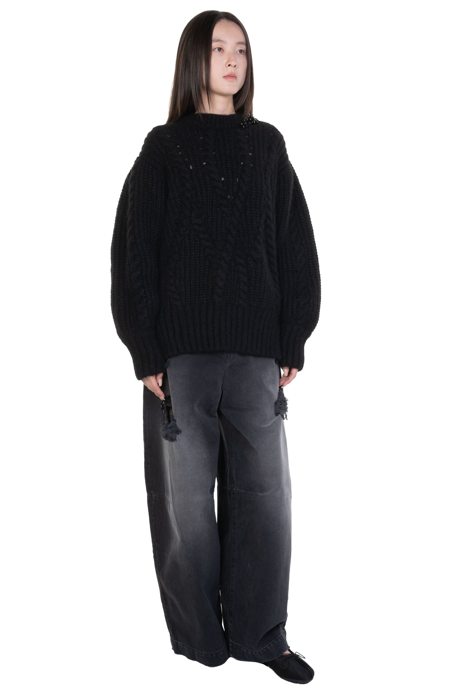 Rocha's designs have an alluring, unsettling romance that is typified by a strong blend of femininity that balances the boundary between the coquettish and the melancholic. Simone Rocha is well known for her fairytale-like style, which includes voluminous silhouettes decorated with beaded embellishments as seen with the Embellished Puff Sleeve Chunky Knit Jumper.