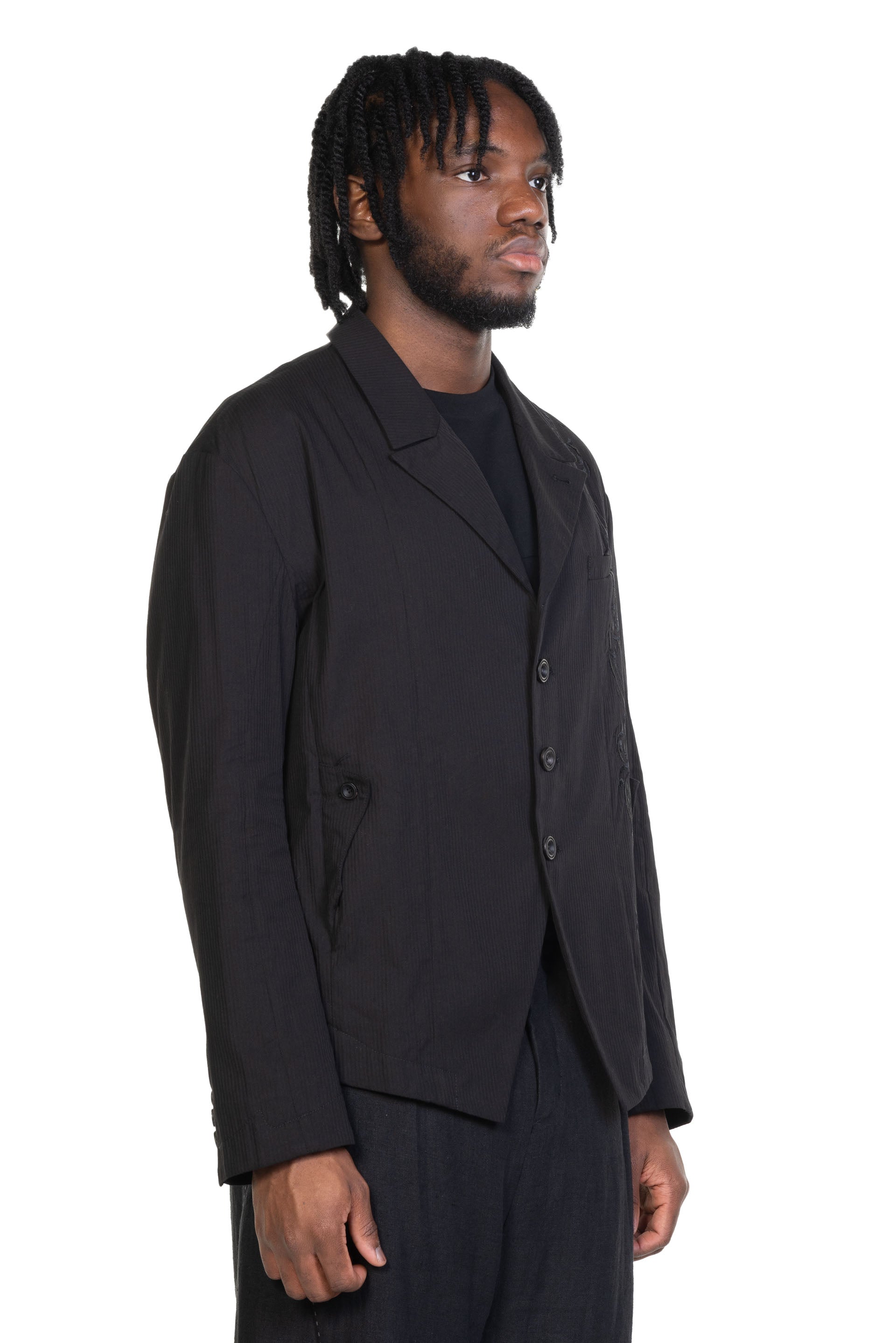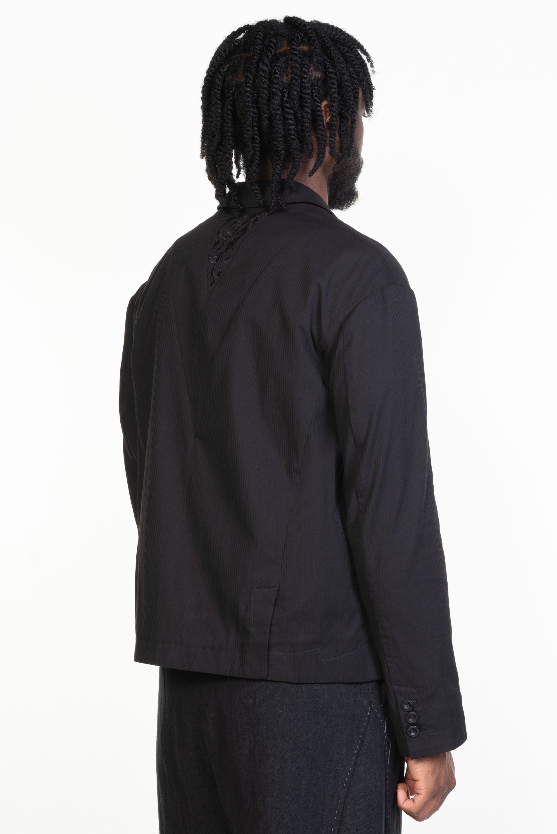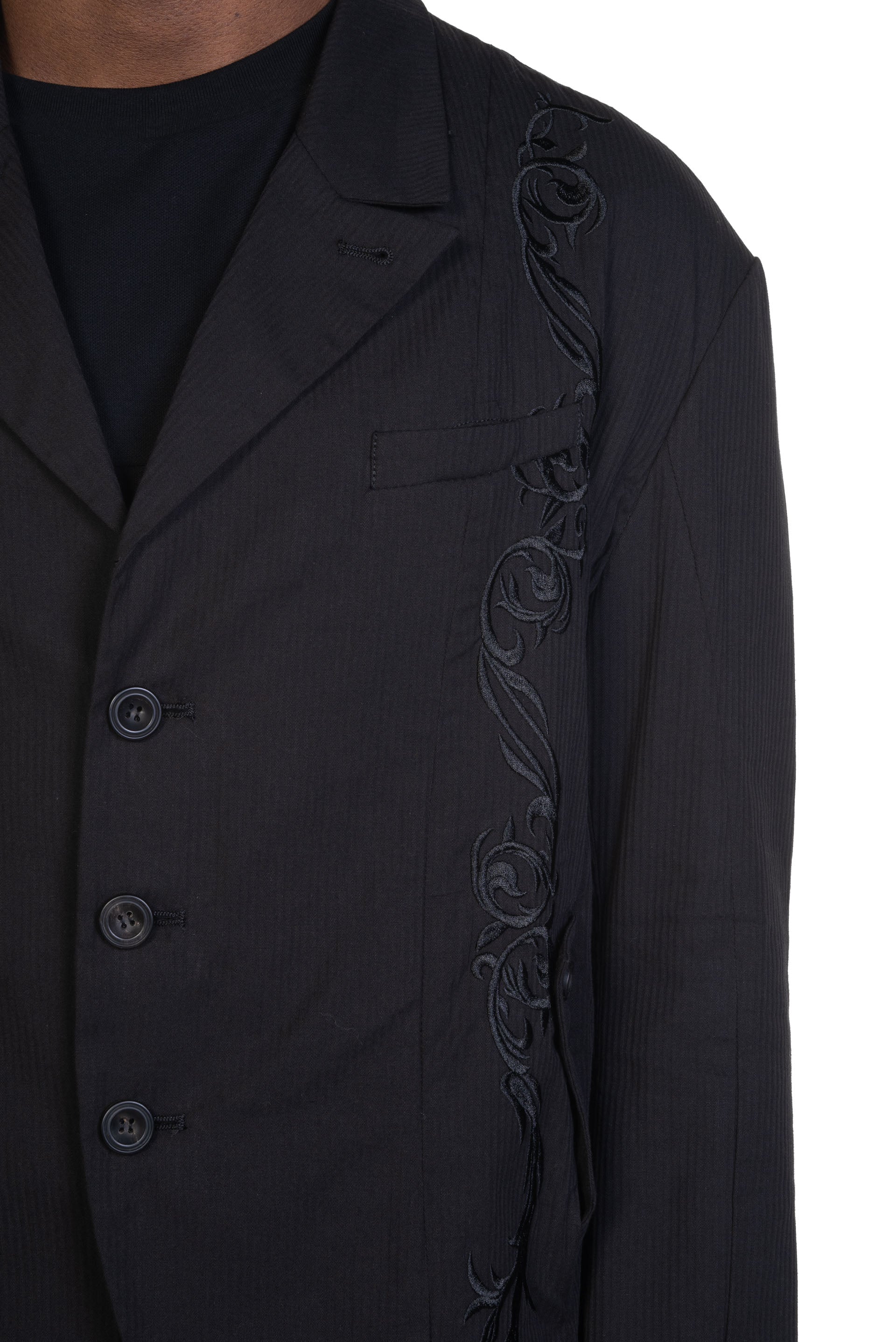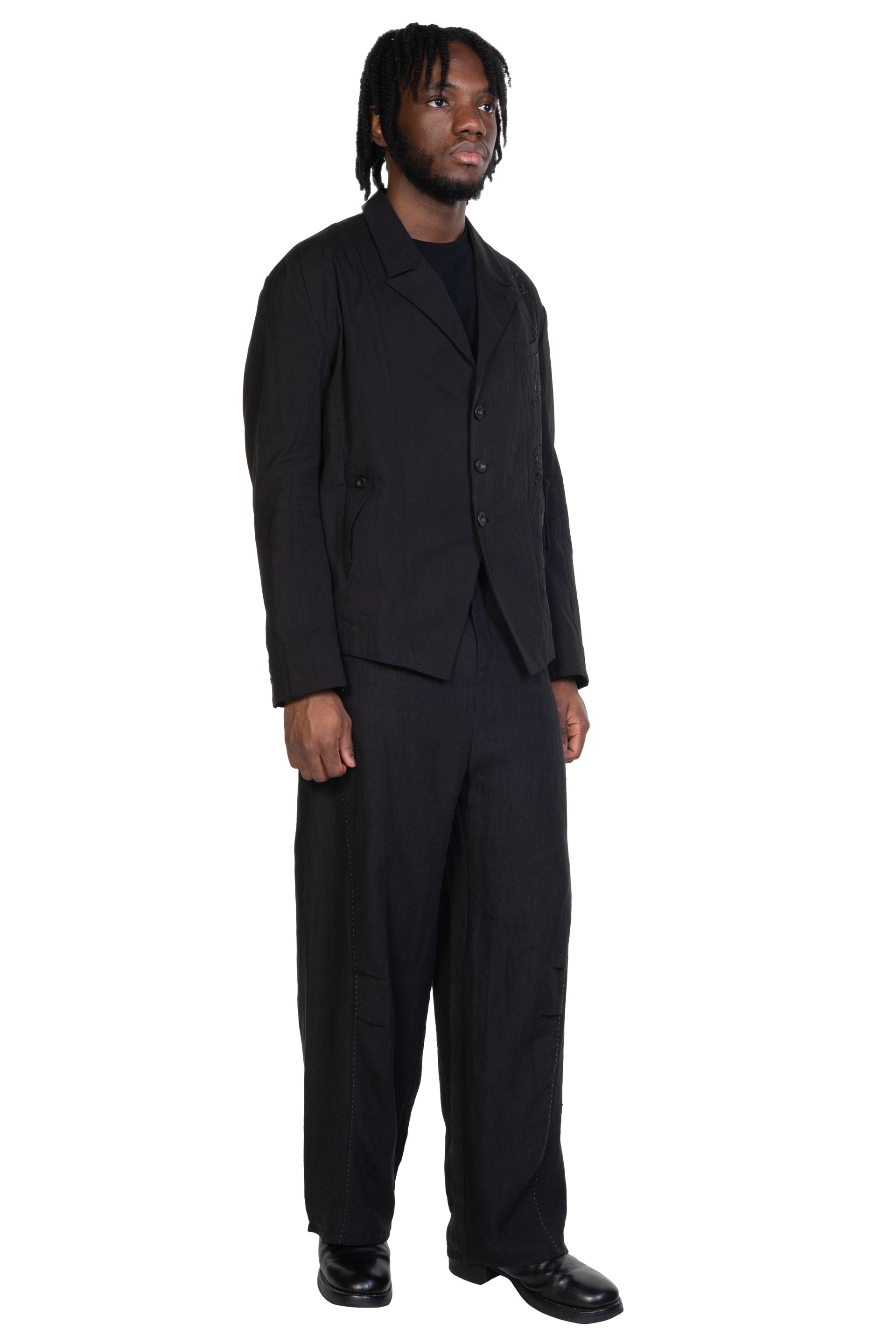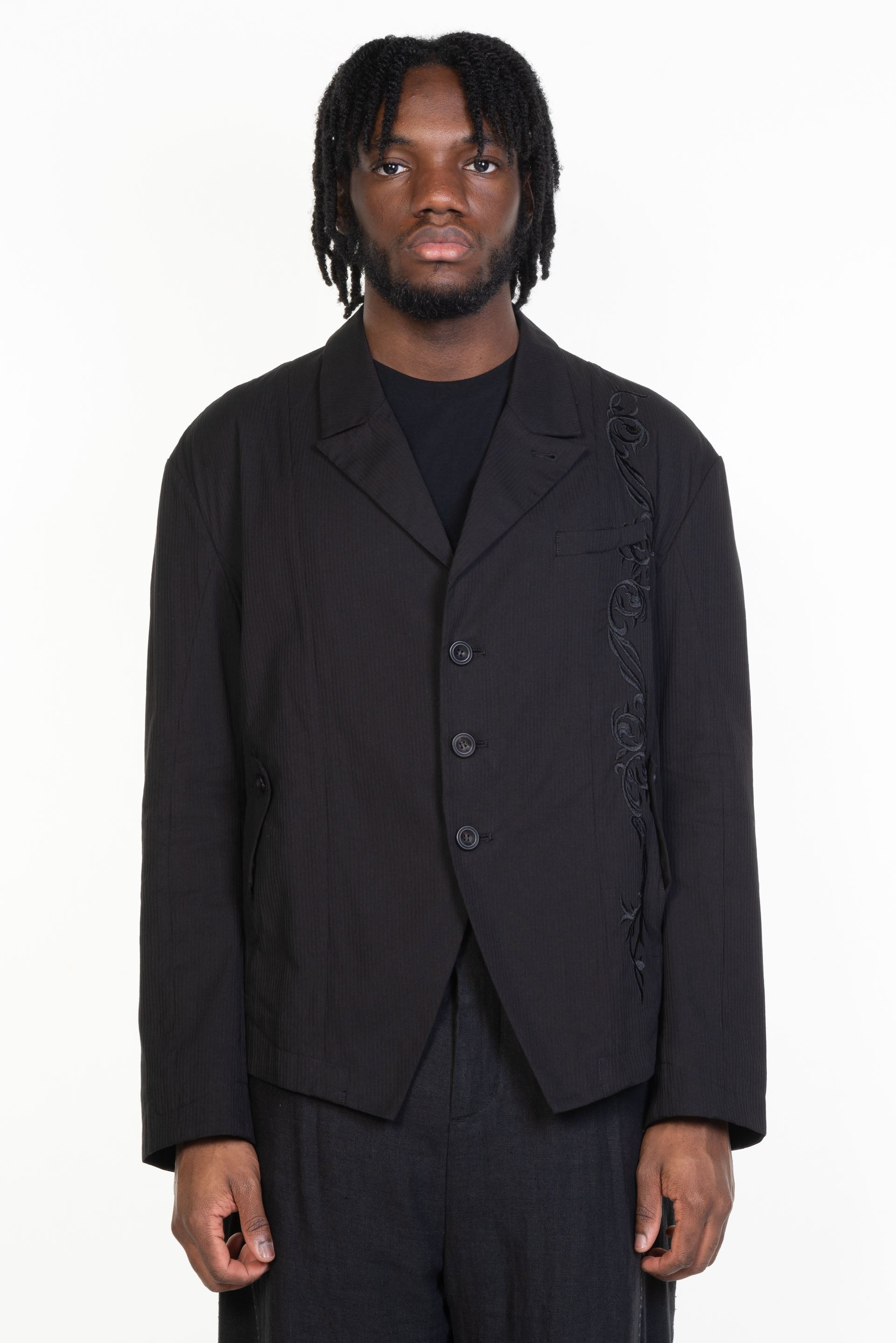 Professor. E understands the time of aesthetics from the use of cotton, hemp and wool. Fabric stitching, patching, designs without edge trimming, deconstruction, and reproduction are all Professor. E's signature elements creating classic immortal designs that can be viewed with the Embroidered Blazer Black.