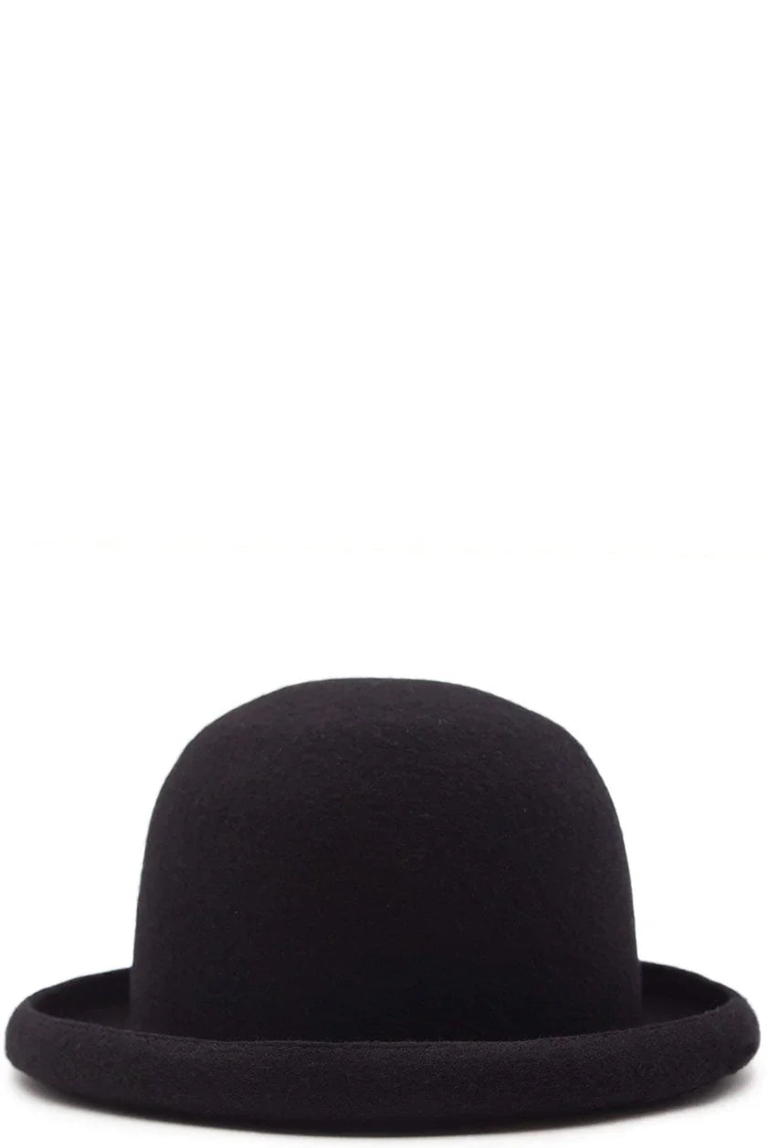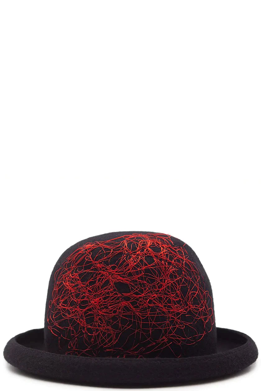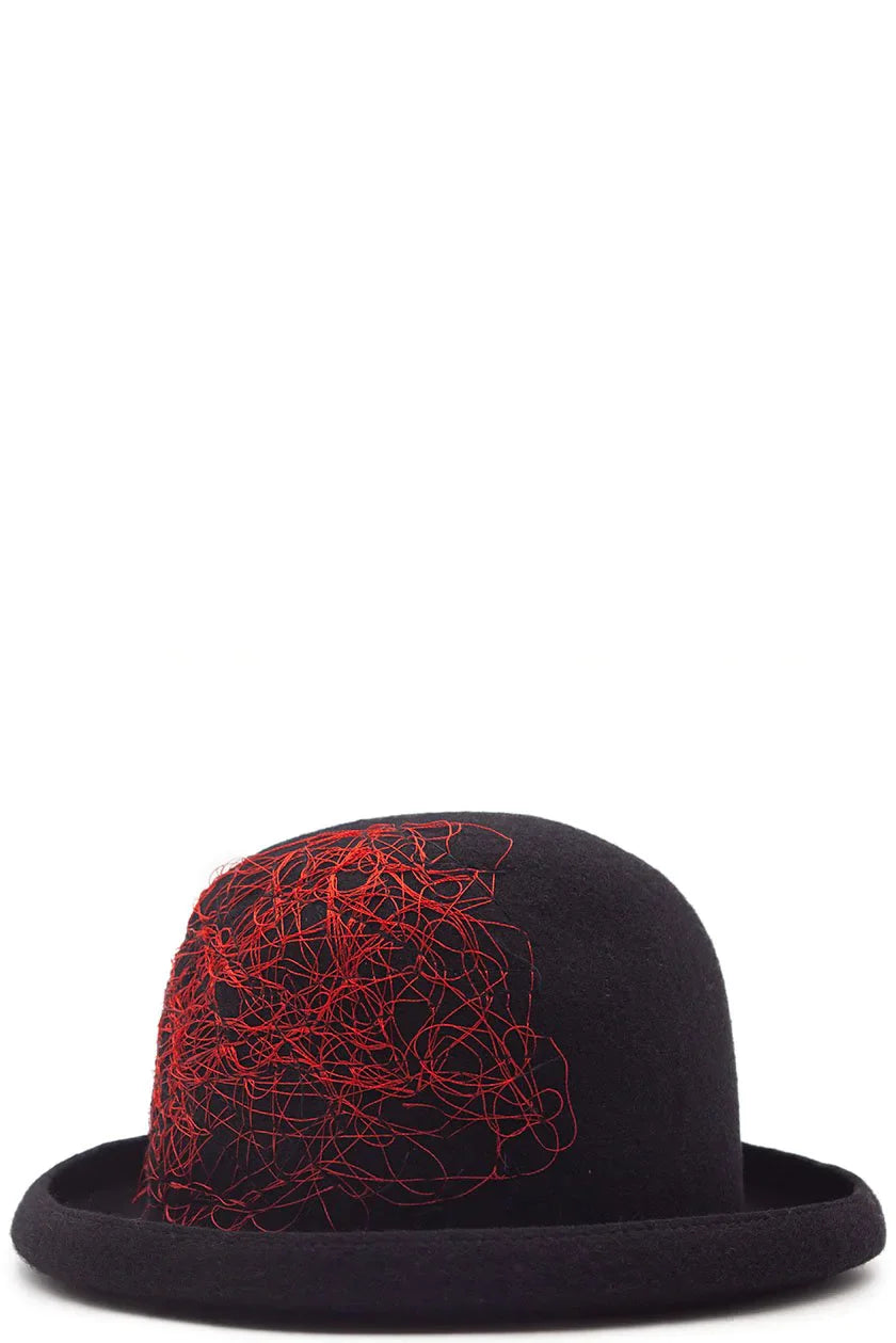 Isabel Benenato Black Felt Hat. Burgundy embroideries. Round shape. Curved edges.