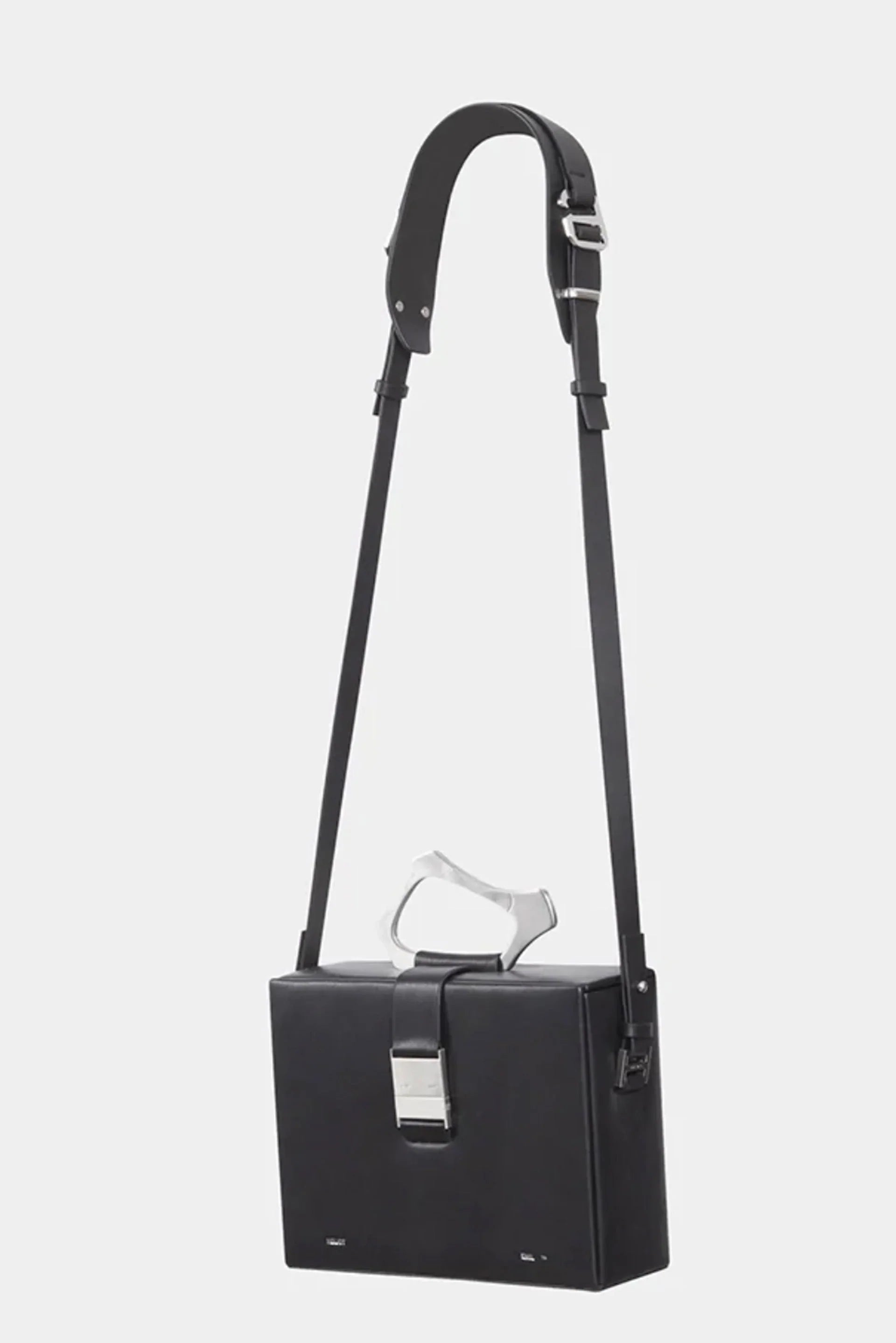 Custom hardware trimmings. Silver HELIOT EMIL TM logo on the front. Metal carabiner top handle and metal snap buckle closure. Rigid box structure with a single compartments.