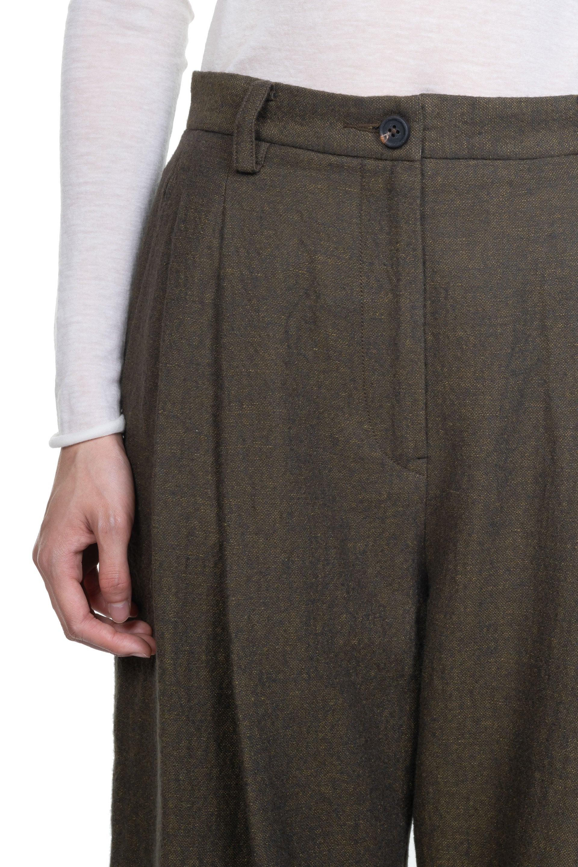 Extra Long Straight Trousers Black in Green. Button closure at waist. Two side pockets. Two back pockets with button closure. Soft and lightweight cotton linen Jacquard fabric. Fully lined. Extra long straight fit.