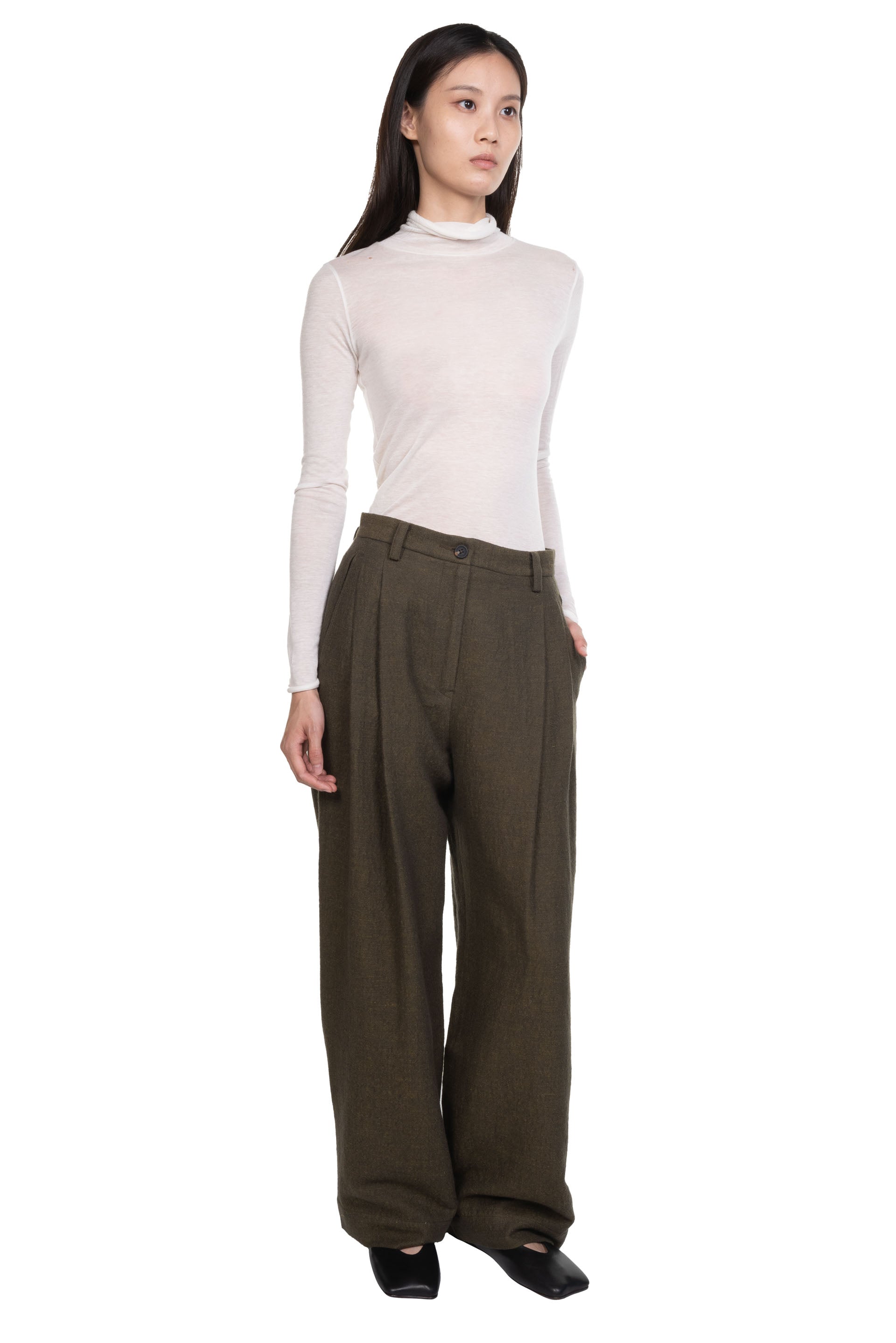 Referencing both century old Chinese and European silhouettes Ziggy Chen is a brand that is carving its own path within the industry as seen with the Extra Long Straight Trousers Green.