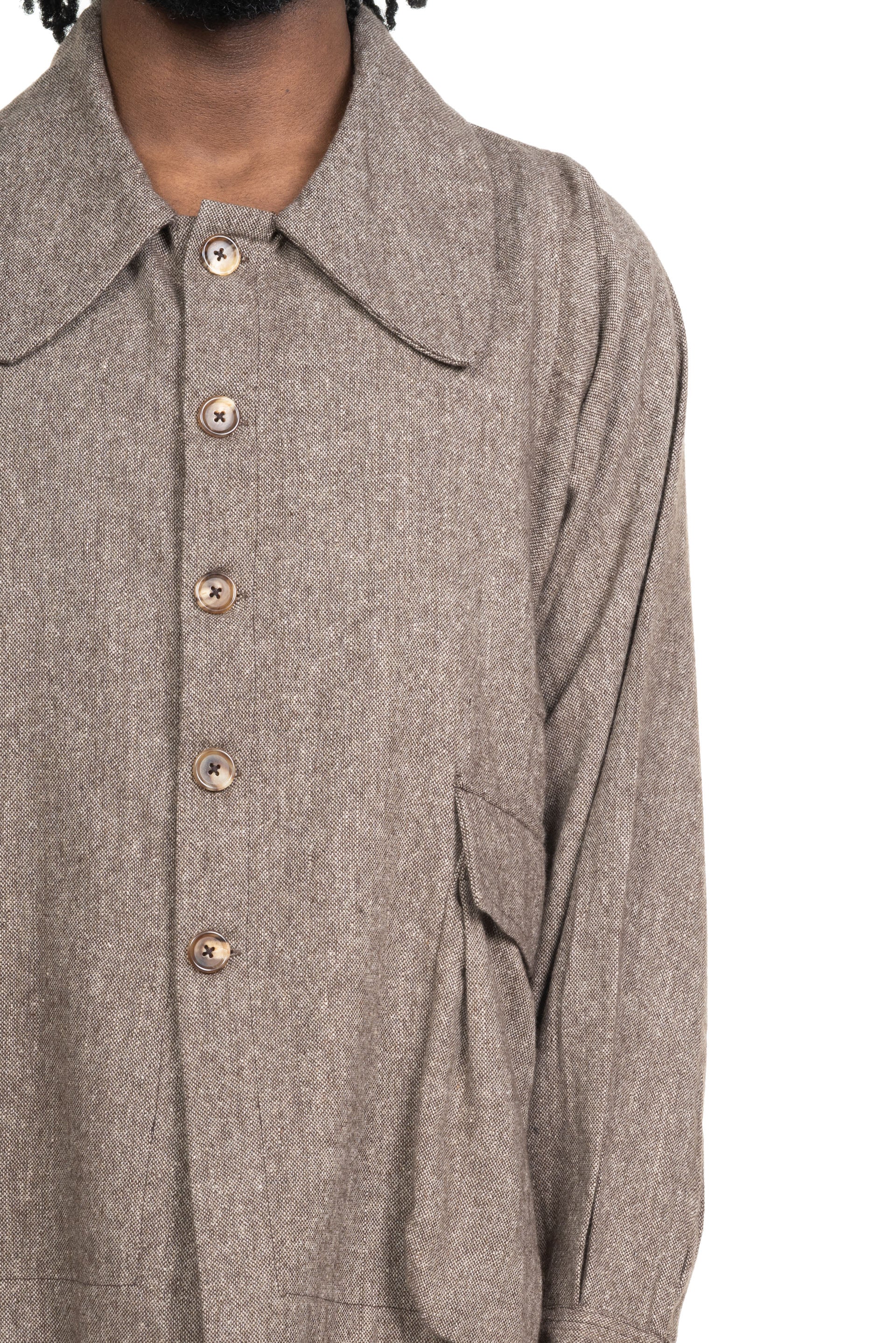 Gathering Jacket in Antique Herringbone Wool. The Farmer Jacket is based on a well-loved traditional Indian dress and takes inspirations from African djellaba. A historic elegant construction made to compliment the wearer. Signature Gathering oversized collar. Two button cuffs. Baggy pockets. Antique Japanese wool. Two baggy pockets with flaps. Boxy fit.