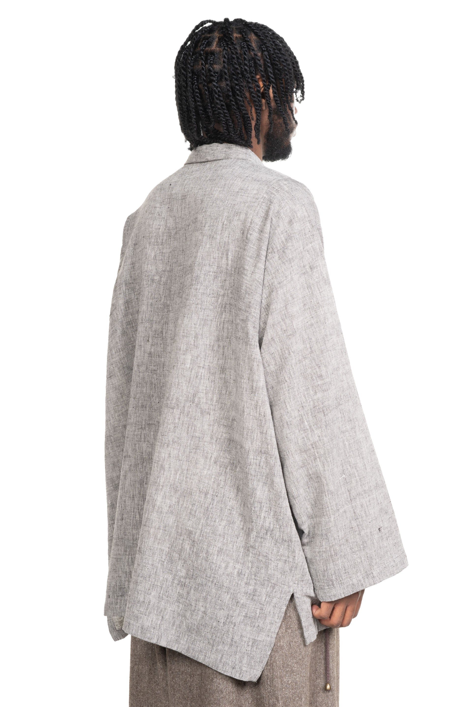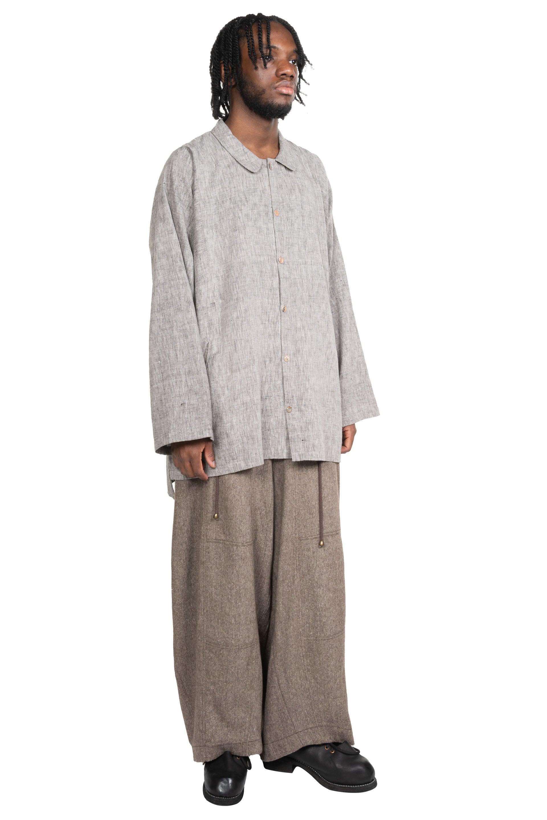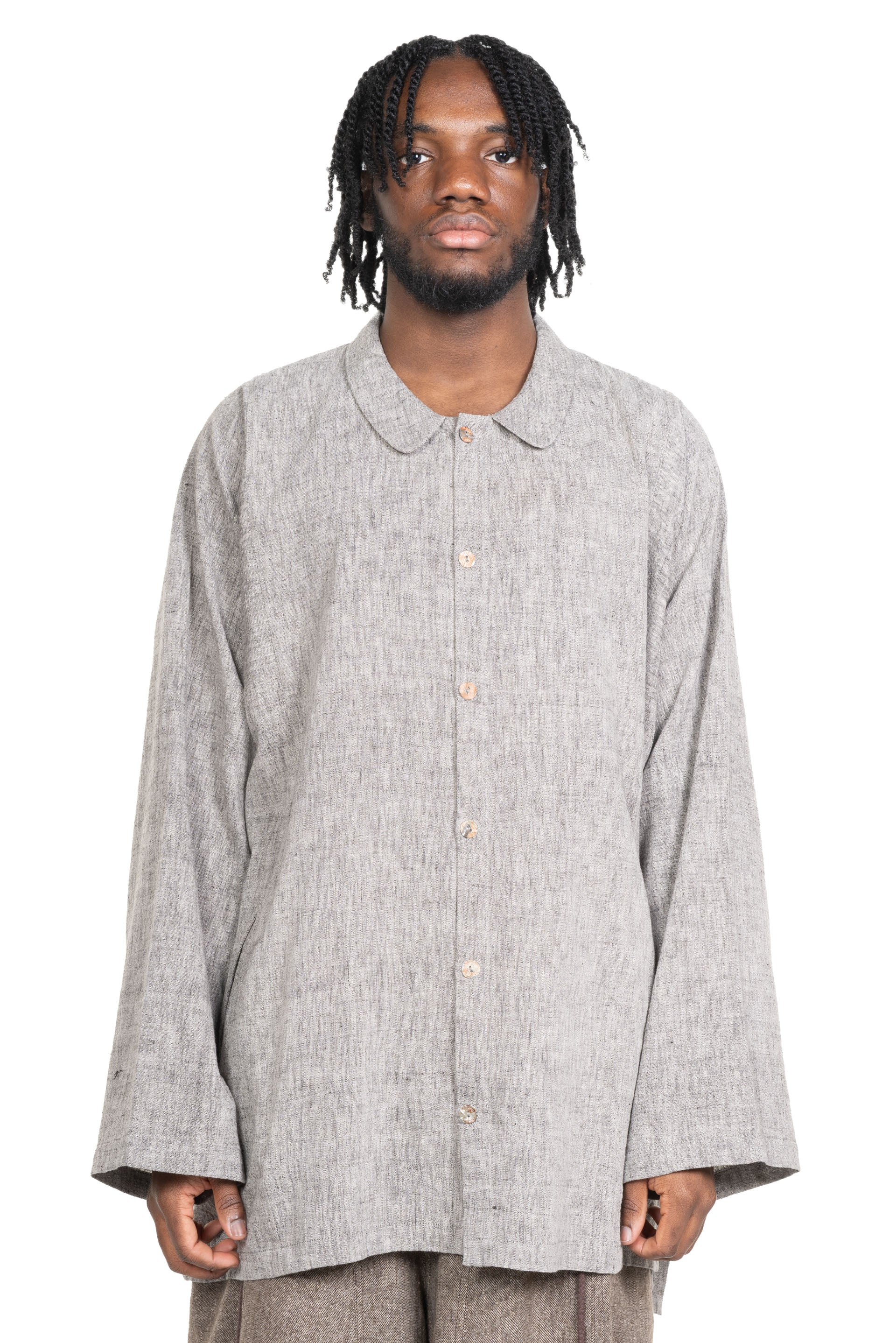 This garment is constructed in a way to compliment all body shapes. The Farmer Shirt is a buttoned-down inspired by traditional Indian shirt. Oversized Gathering collar. Mother of pearl shell buttons. Made from Japanese linen which is a light and soft. Boxy Fit.