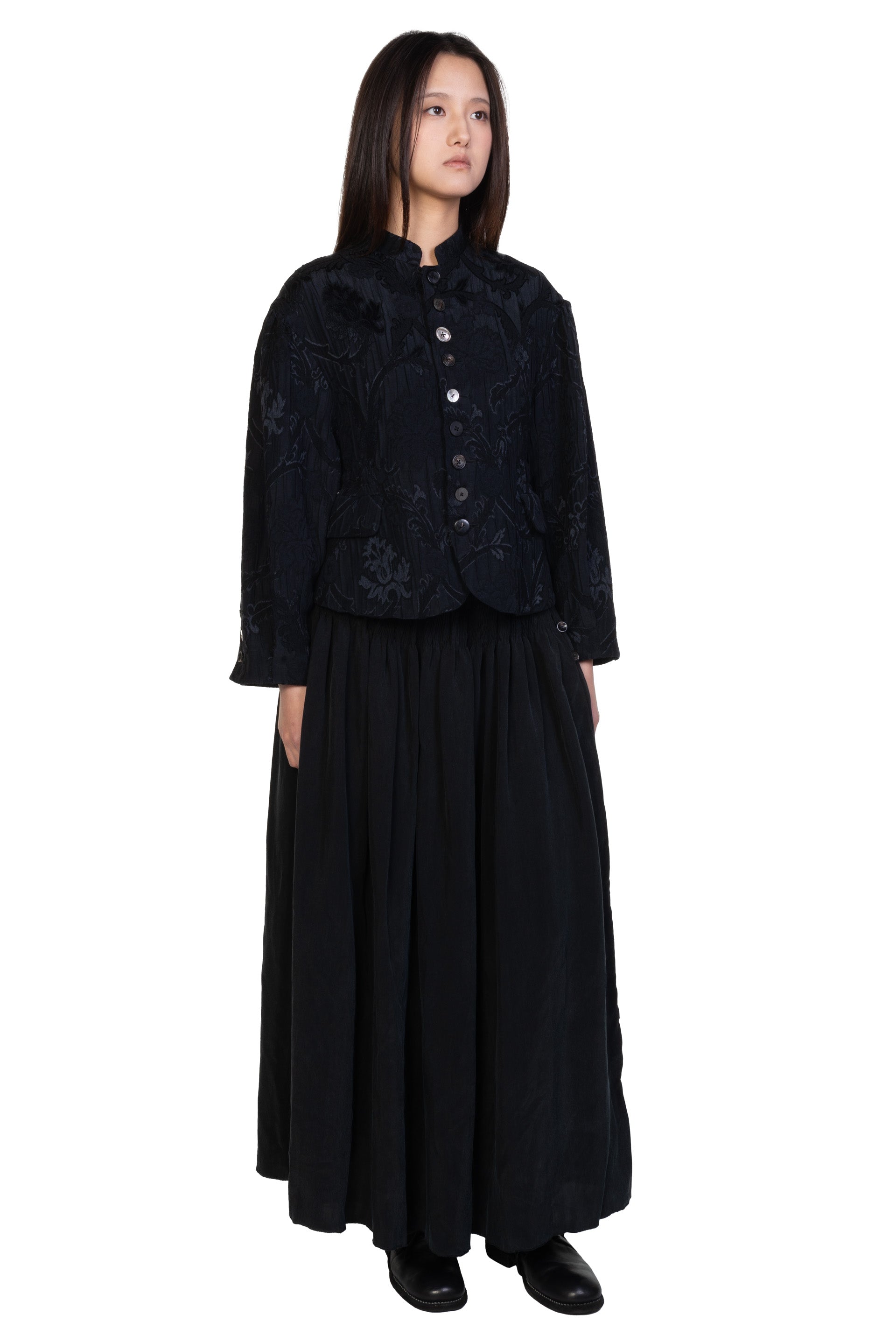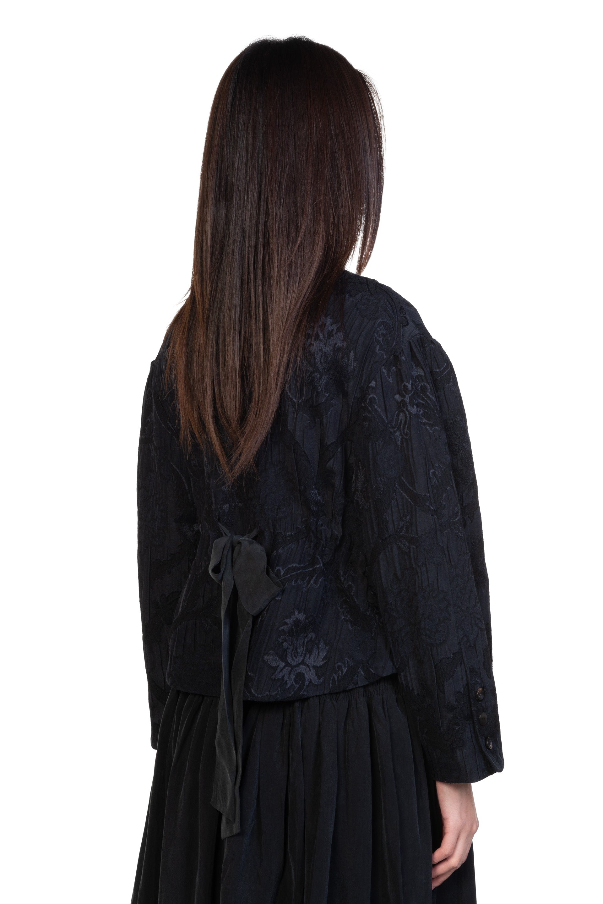 A Tentative Atelier aims to explore artistic handicraft elements and innovative forms and silhouettes on garments combining with neo-vintage effect. The label does not only focus on fashion, it is a platform to encourage and sustain the spirit and tradition in craftsmanship to create new form as seen with the Floral Jacquard Ribbon Jacket.
