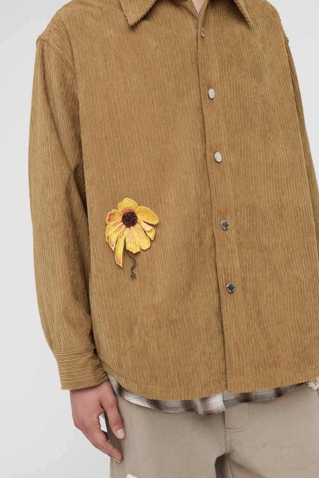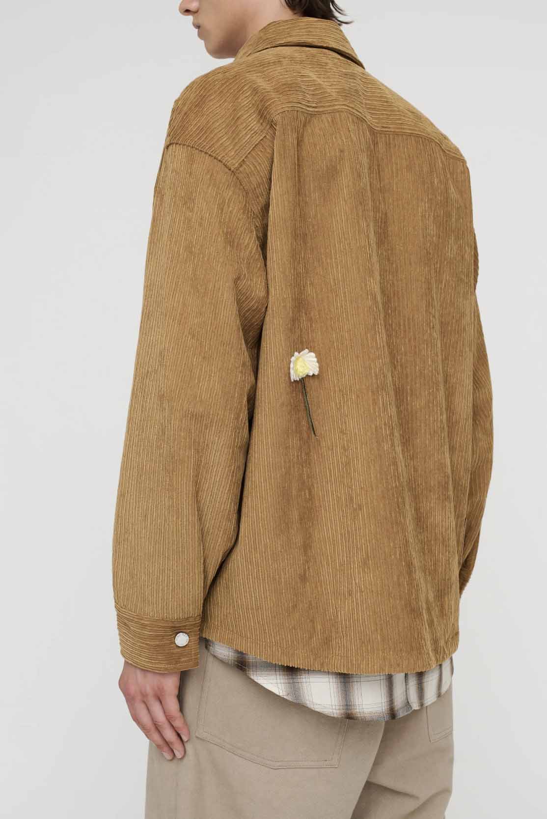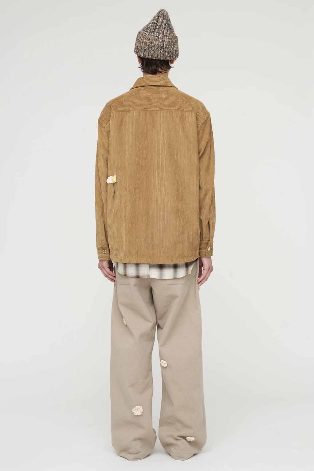 First introduced in 23.1 ‘1999’, this jacket exists in the space between a heavyweight oversized shirt and a lightweight outer layer, offering versatility in wear. This season’s iteration is cut from Japanese corduroy, with two embroidered and beaded sunflower embellishments adorning the front and back, introducing a sense of softness against a structured, utilitarian base.