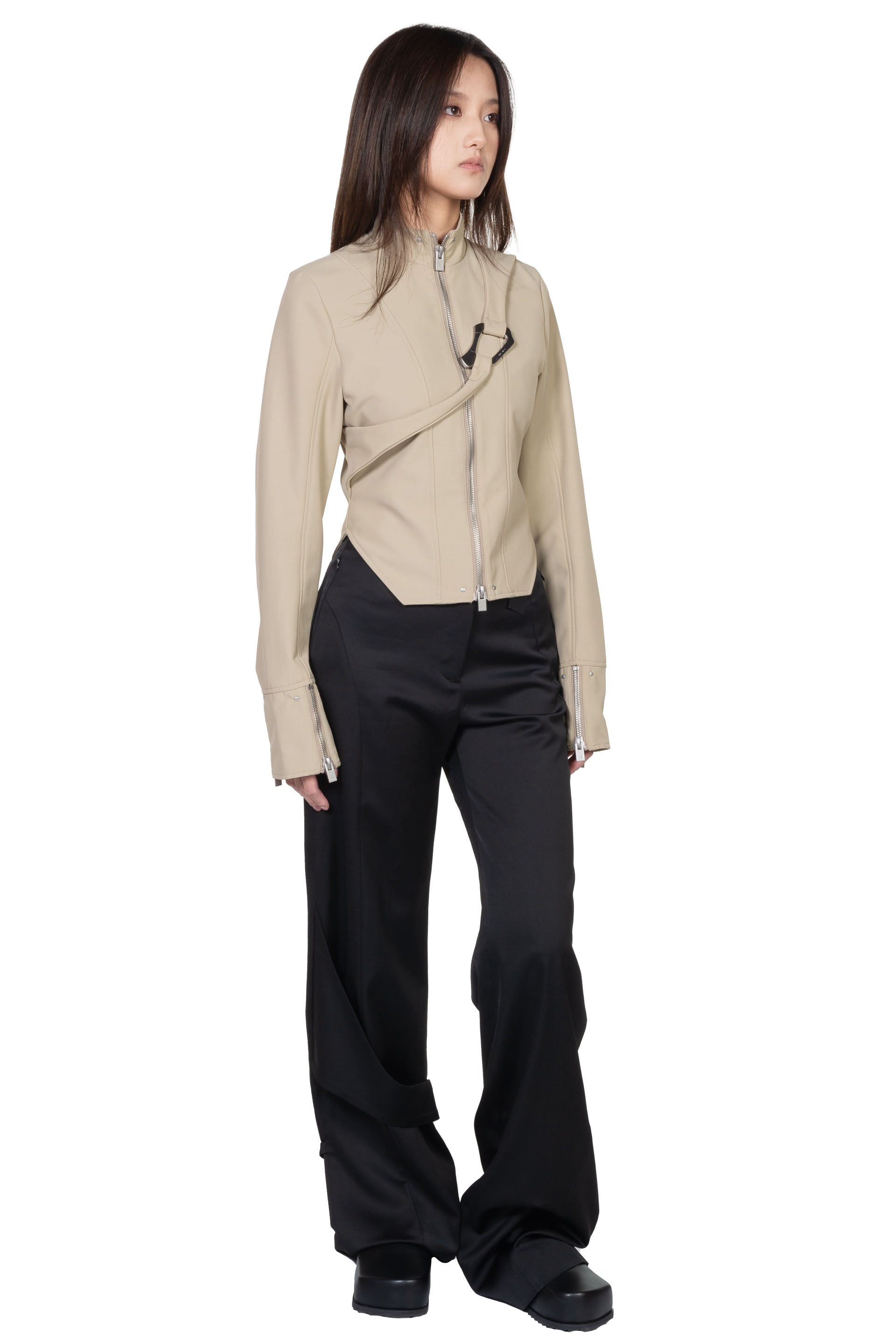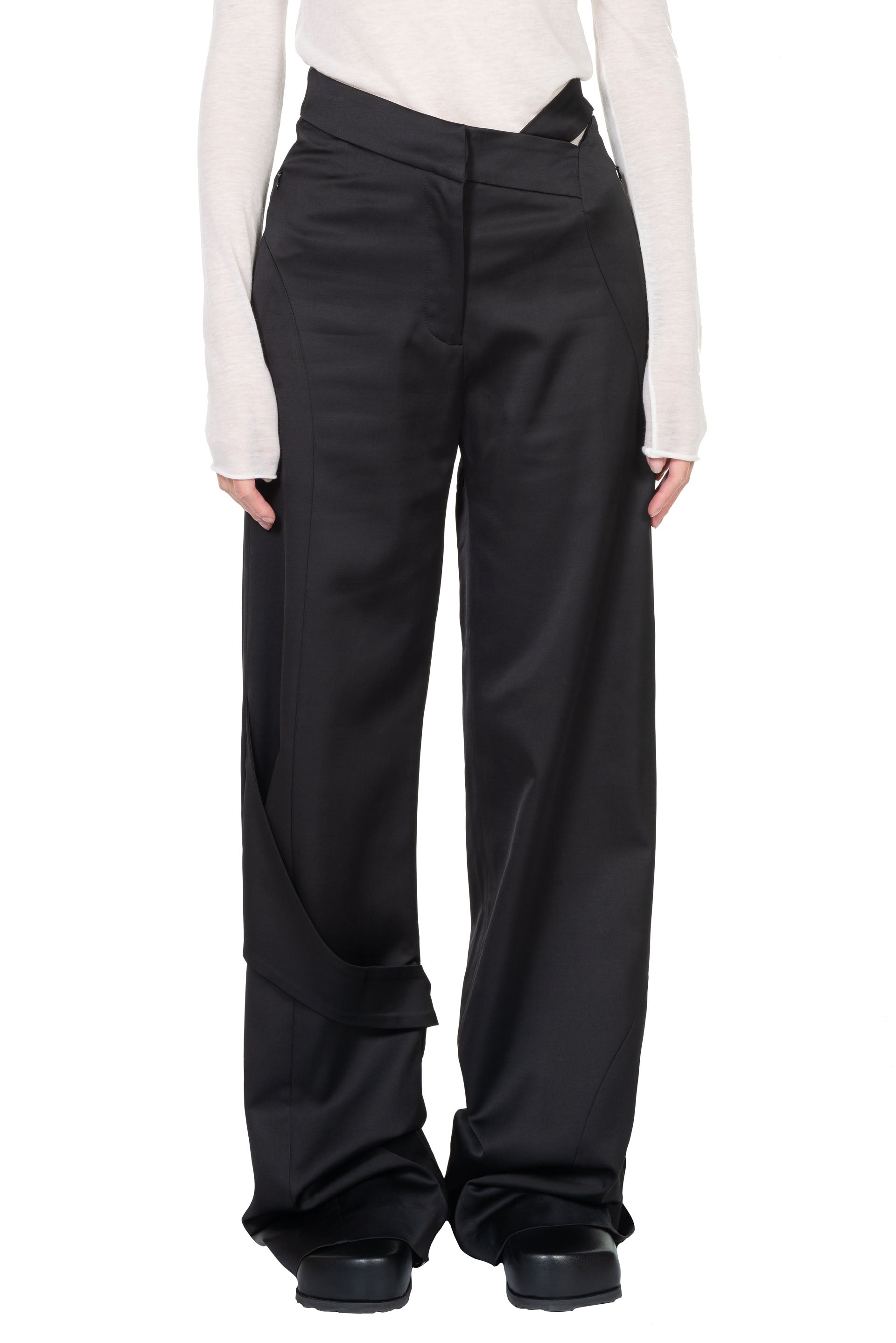 Fluid Viscose fabric. Fabric made in Italy. Wide legs with shaped seams details. Shaped waistband with cut out at front hip. Blind zips at inner leg seam. Layered panel with front slit at right leg. Layered panel with G-hook closure at left leg.