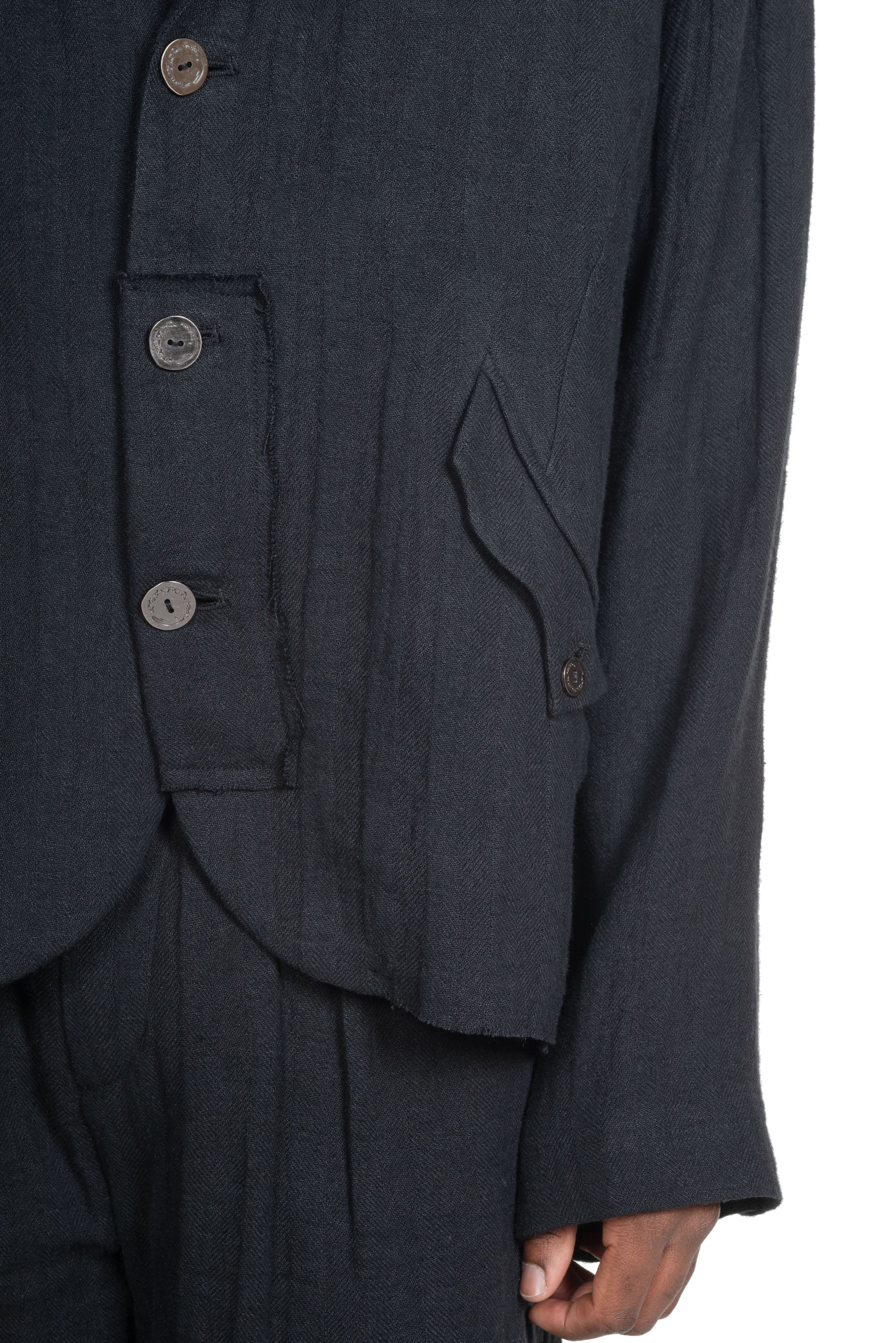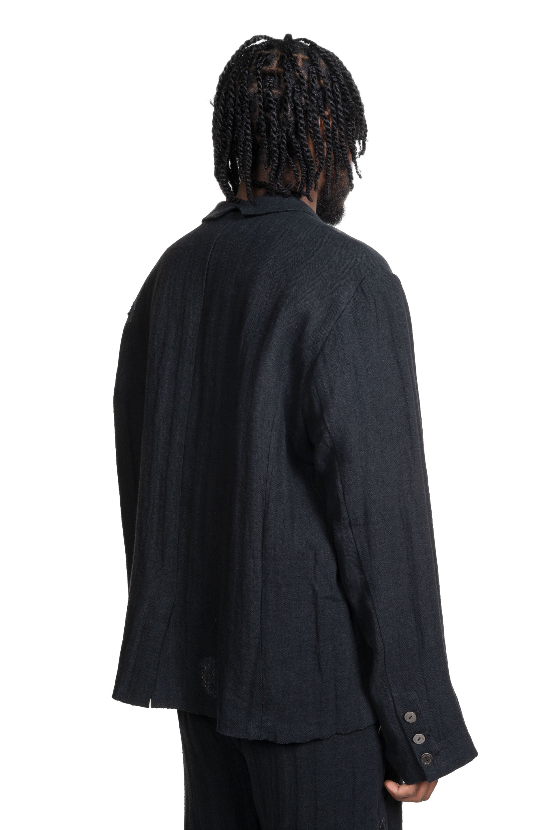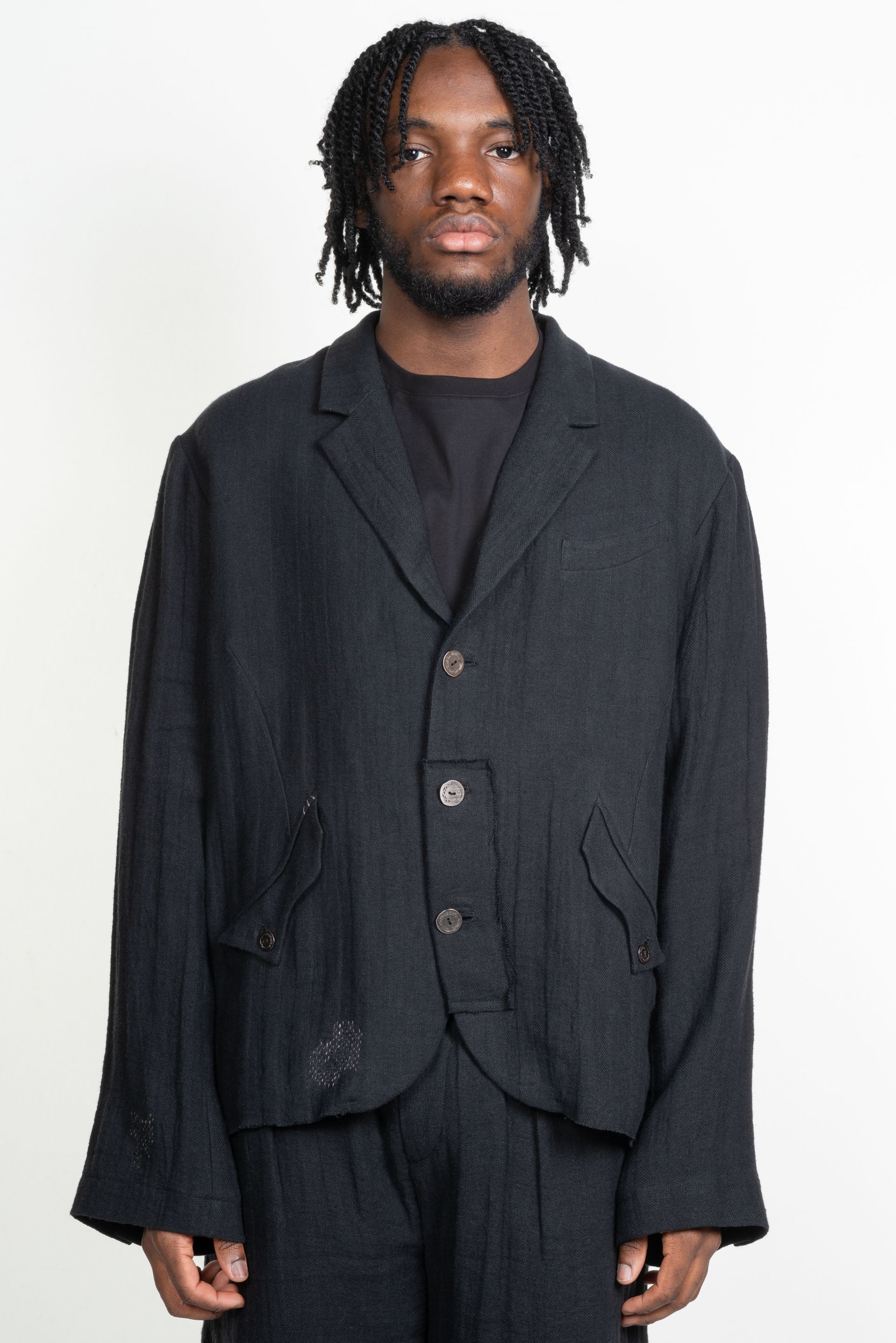 Professor. E understands the time of aesthetics from the use of cotton, hemp and wool. Fabric stitching, patching, designs without edge trimming, deconstruction, and reproduction are all Professor. E's signature elements creating classic immortal designs that can be viewed with the FM 0222 Blazer Frayed Black.