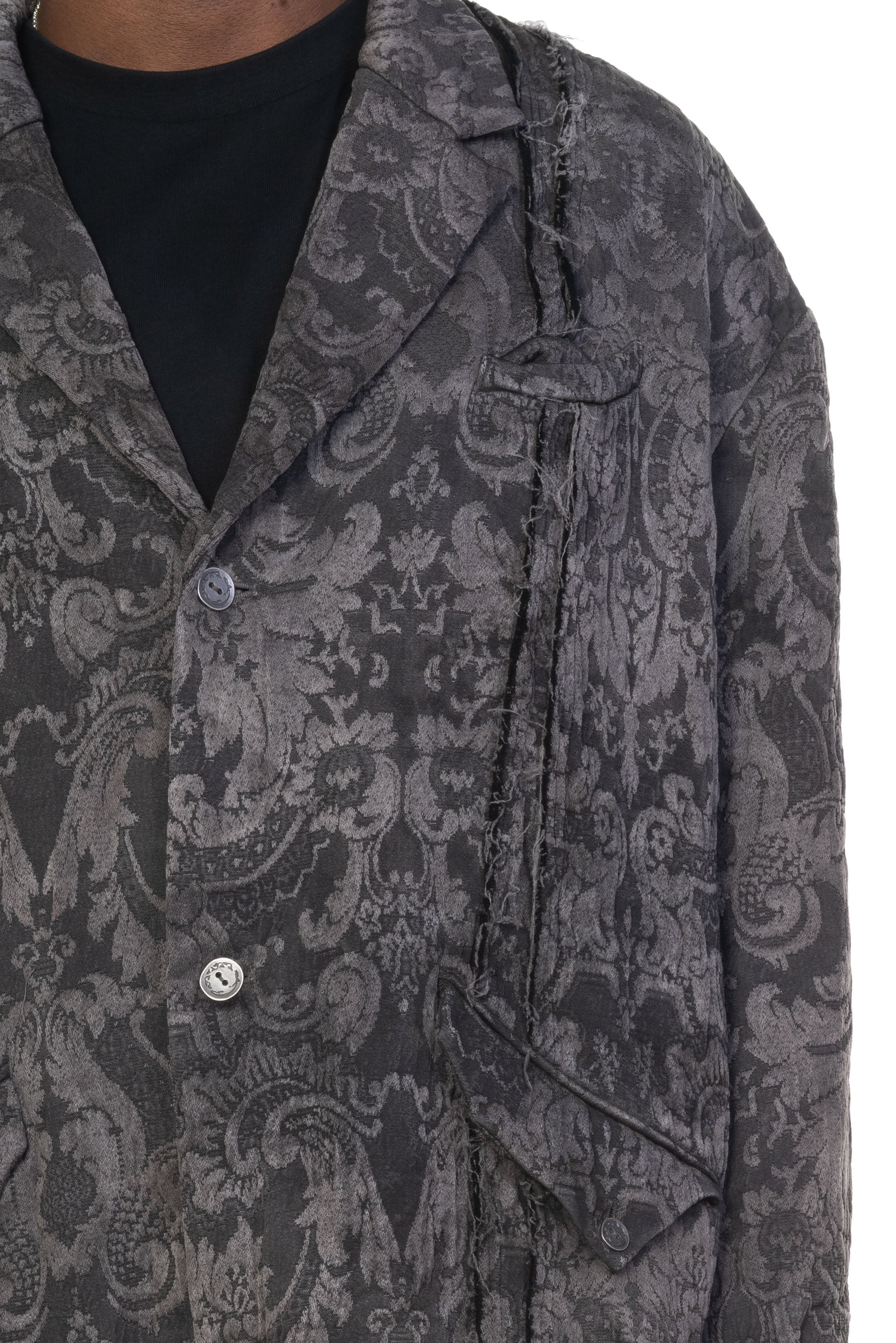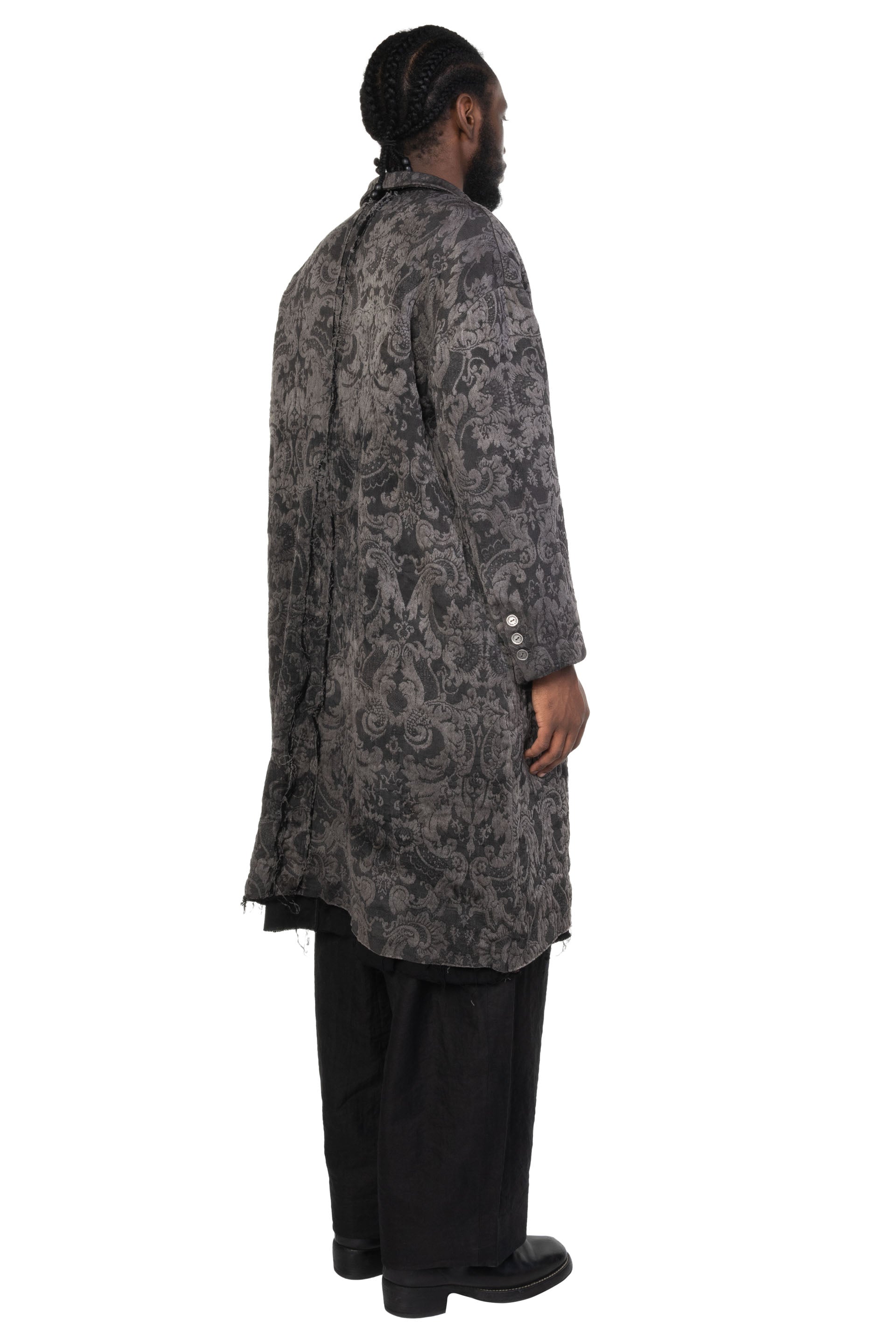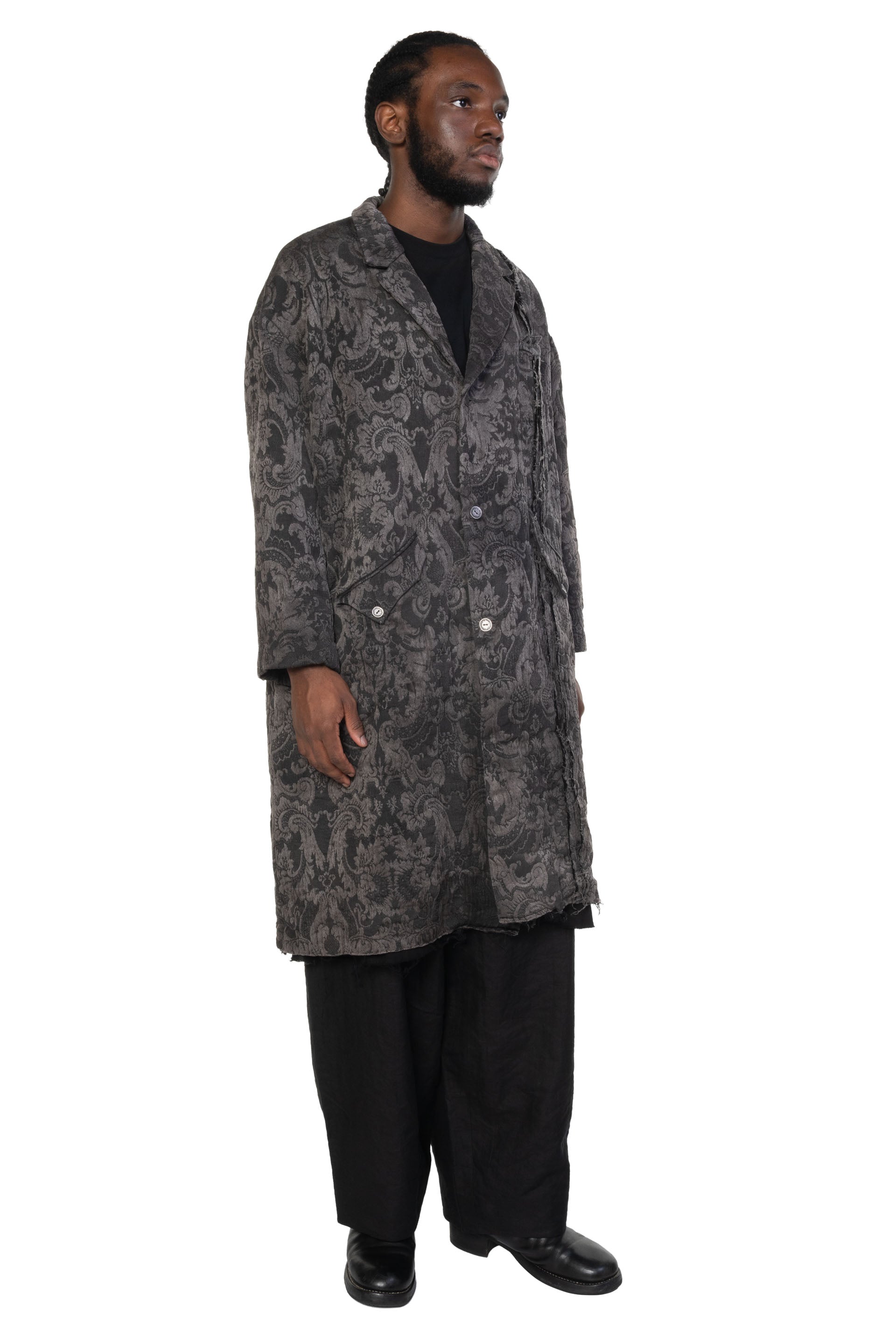 Professor. E understands the time of aesthetics from the use of cotton, hemp and wool. Fabric stitching, patching, designs without edge trimming, deconstruction, and reproduction are all Professor. E's signature elements creating classic immortal designs that can be viewed with the FM Dyed Floral Coat Exclusive