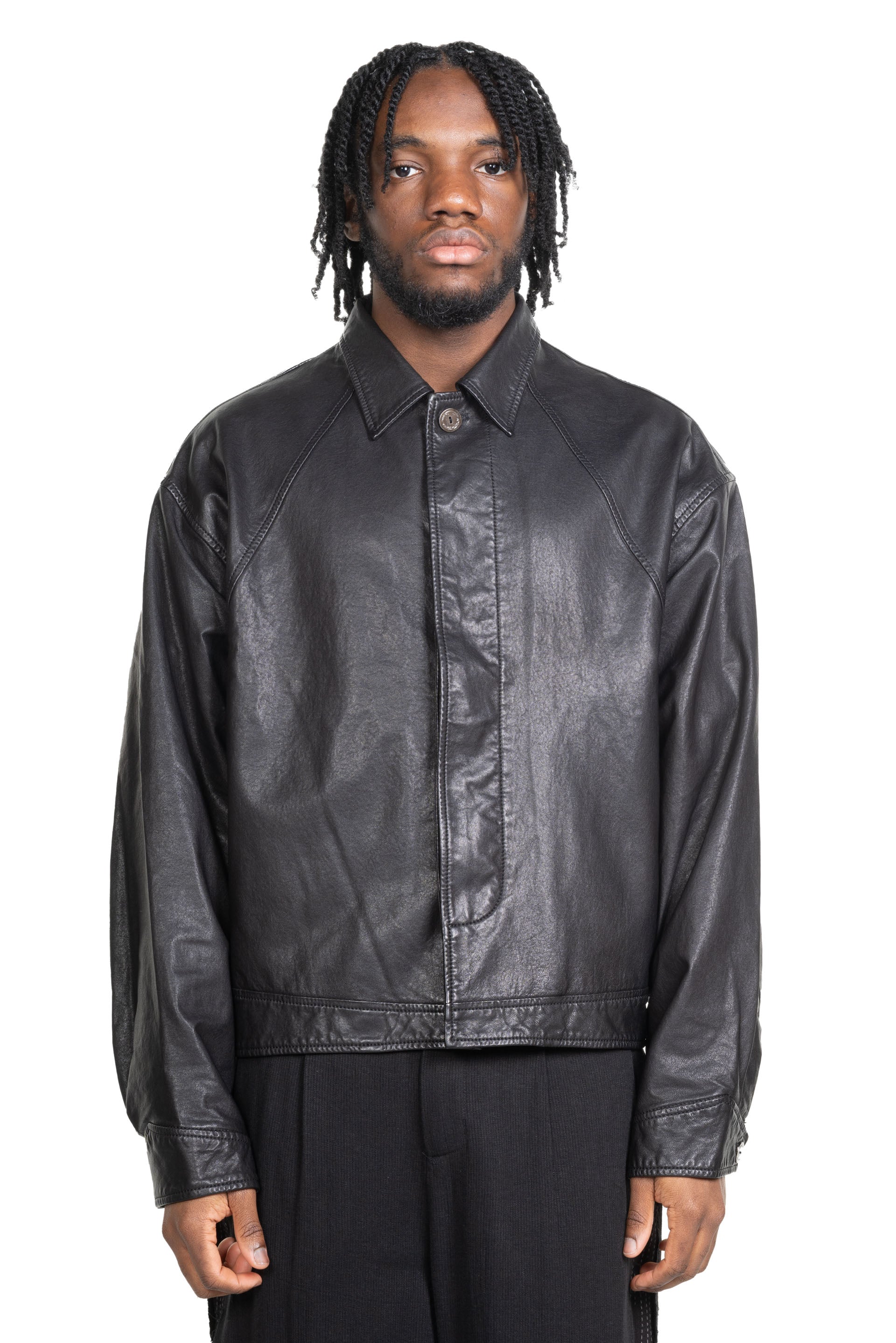 Professor E Forgotten Material leather Jacket. Button closure at front. Long sleeves. Raglan sleeves. Cropped and boxy fit. Two side pockets. Signature slit details at back. Lined with signature linen lining. Forgotten material metal button.