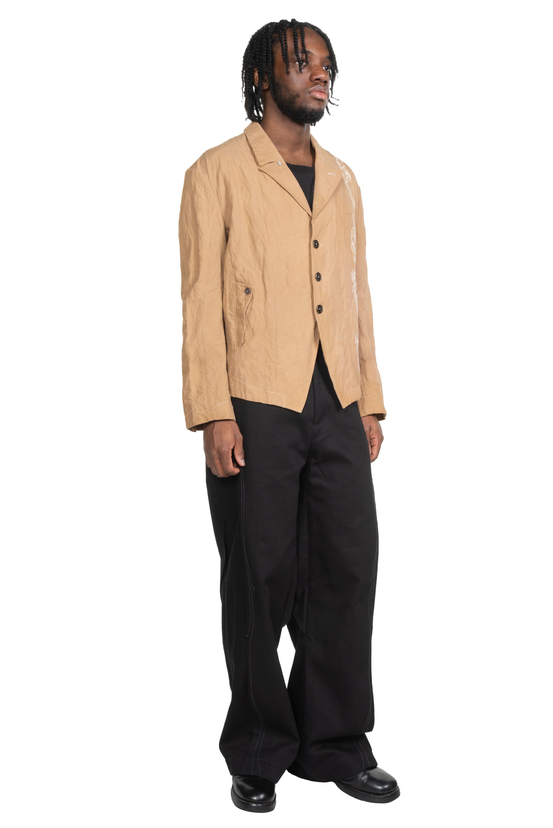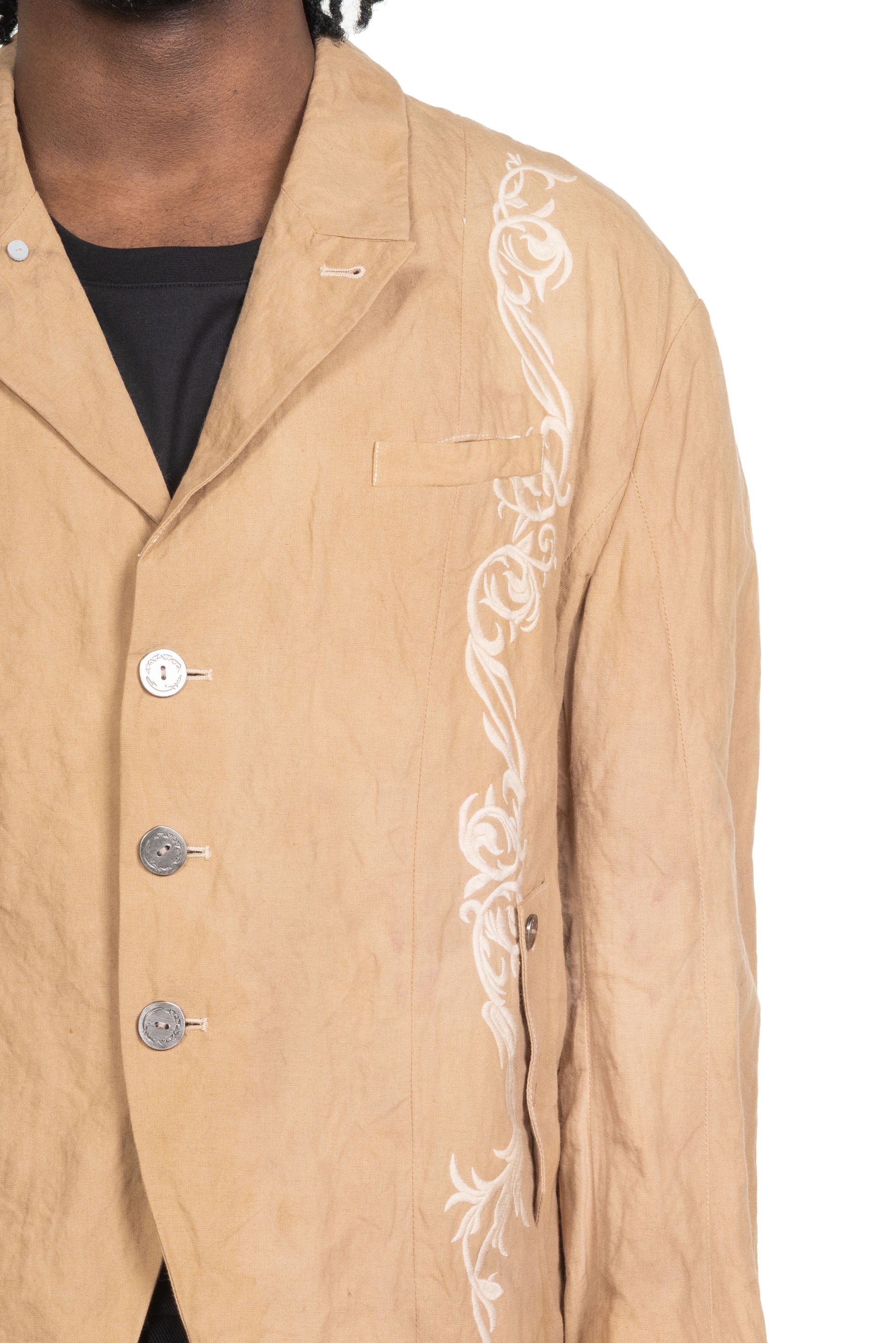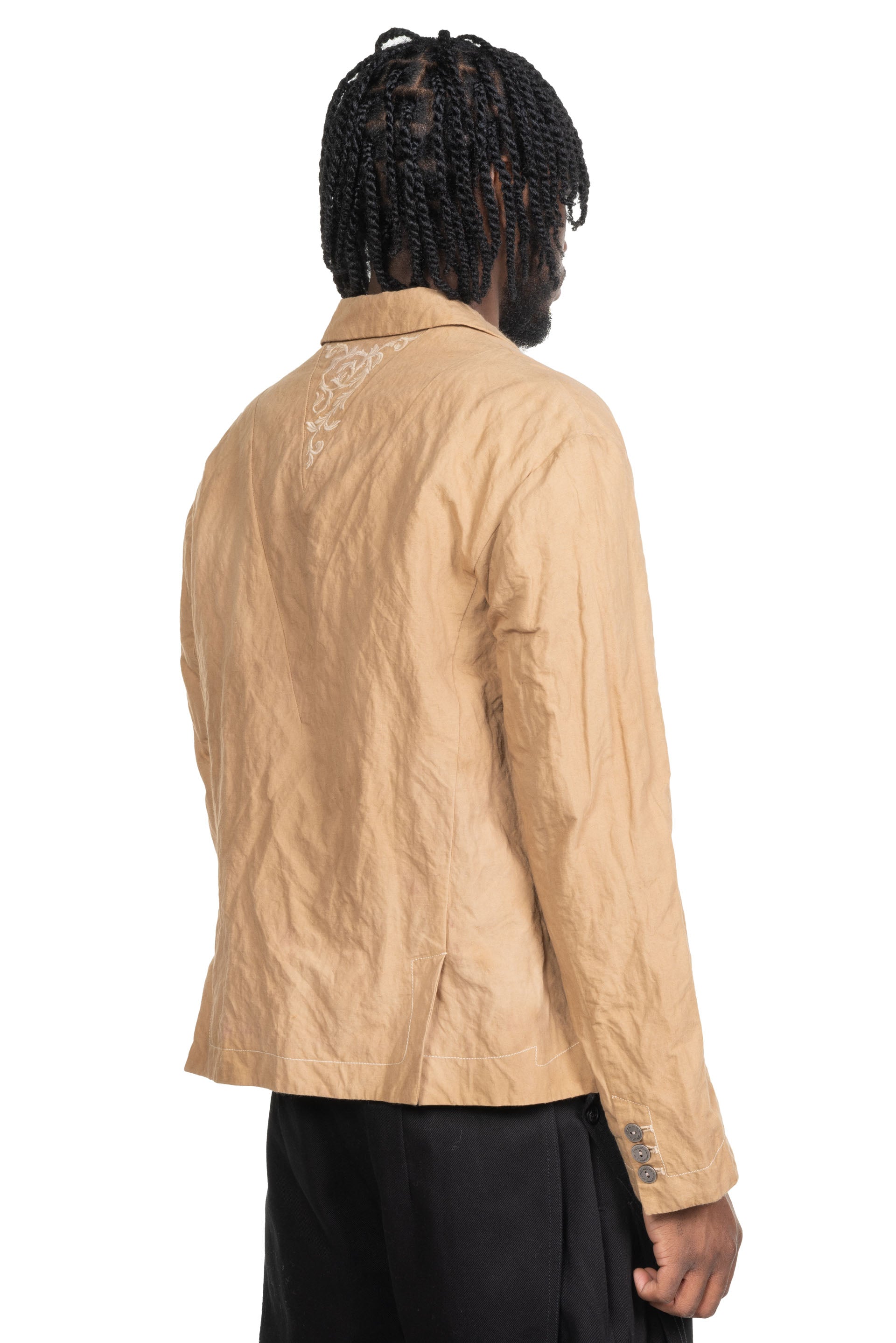 Professor E Forgotten Material Embroidered Blazer Crinkle Dyed Beige. Long sleeves. 3 Button closure at front. Two side pockets with button closure. Embroideries at front and back. Crinkled effect. Soft Cotton Linen dyed fabric.