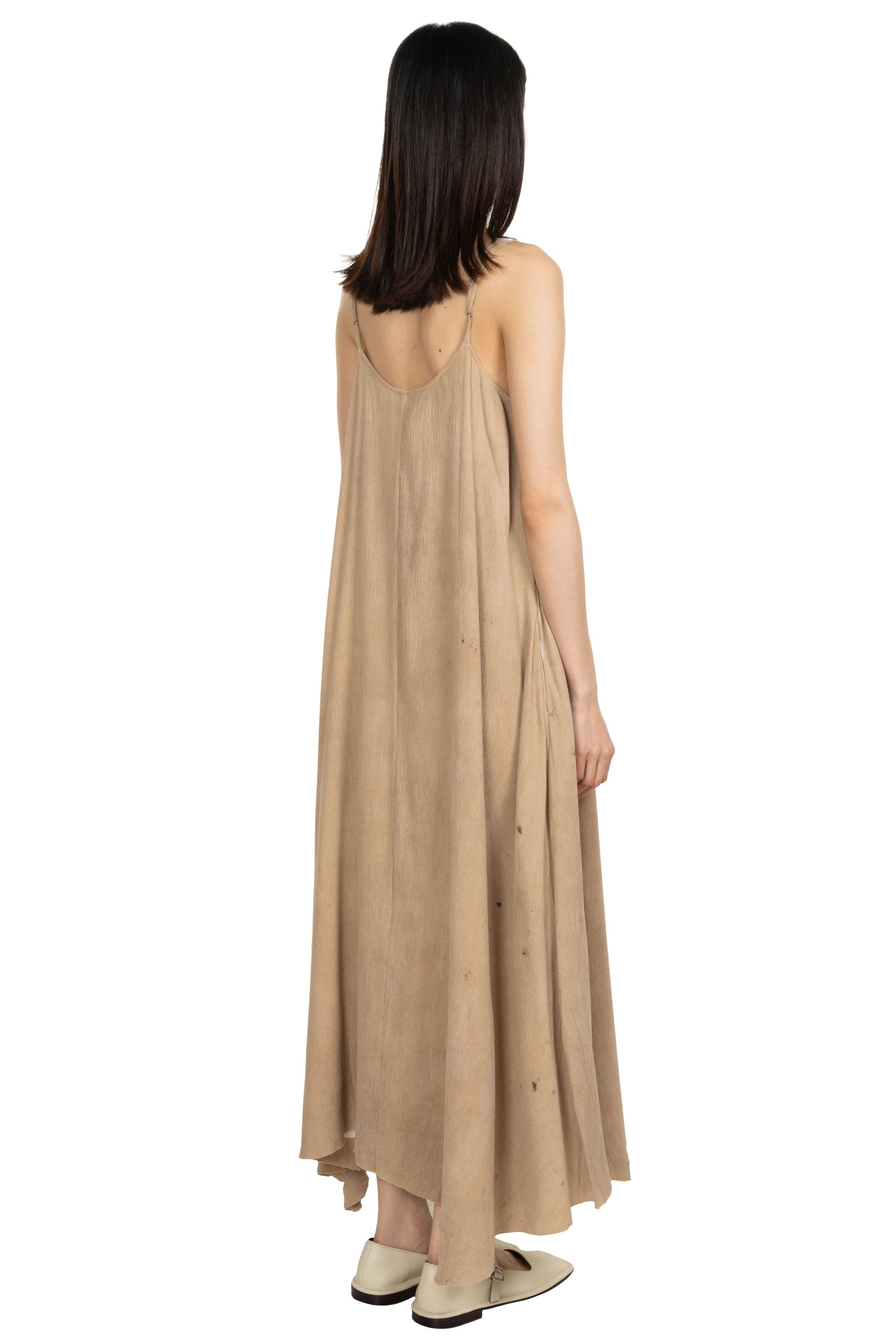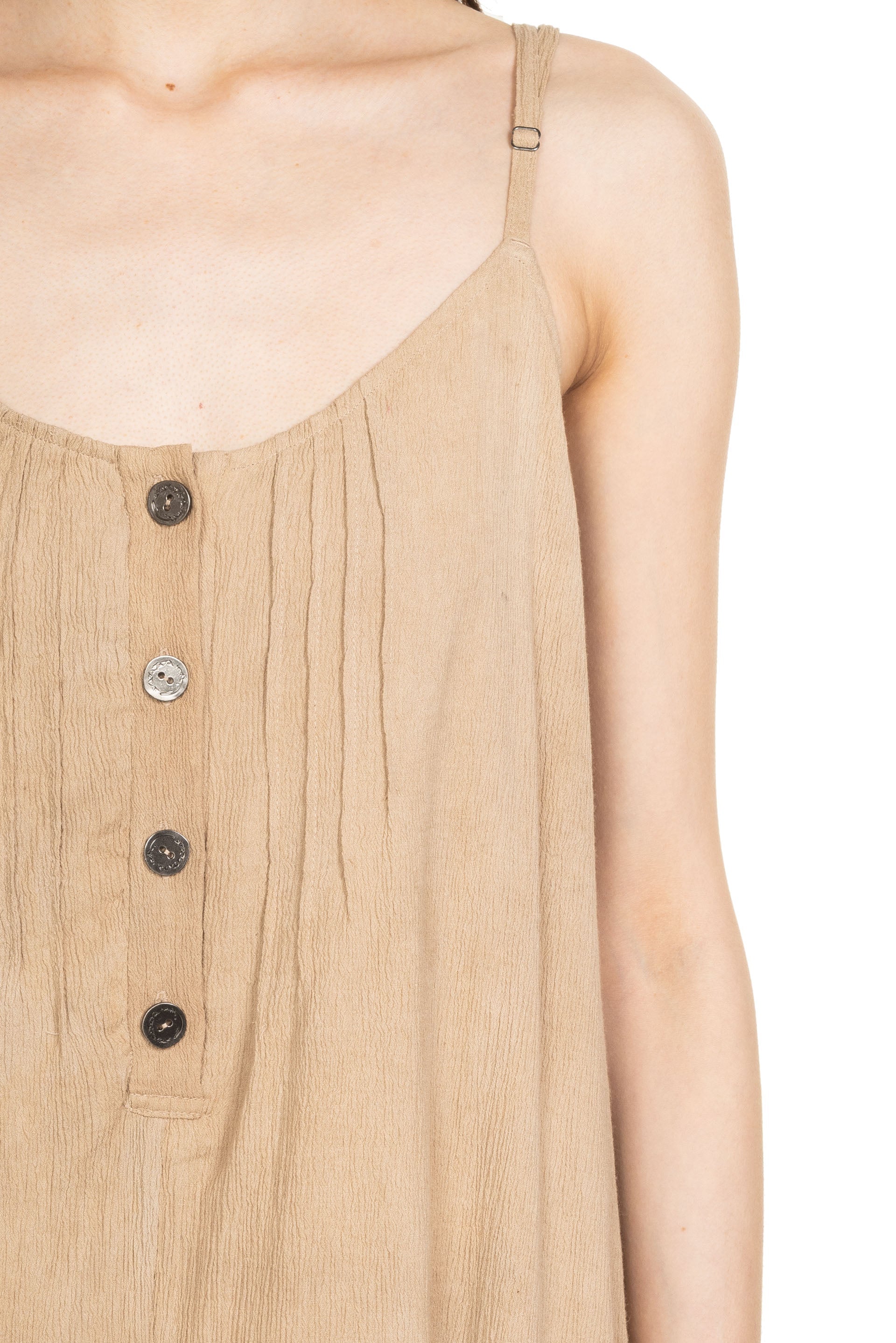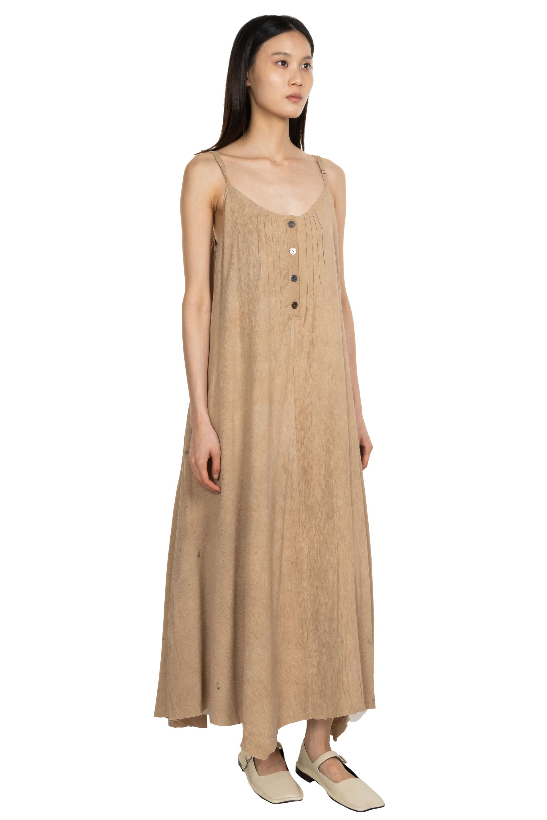 Professor e Forgotten Material FM Eson Dress Hand Dyed in Beige. Sleeveless. Spagetti shoulder strap. Button details at front. Metallic buttons. Soft textural fabric.