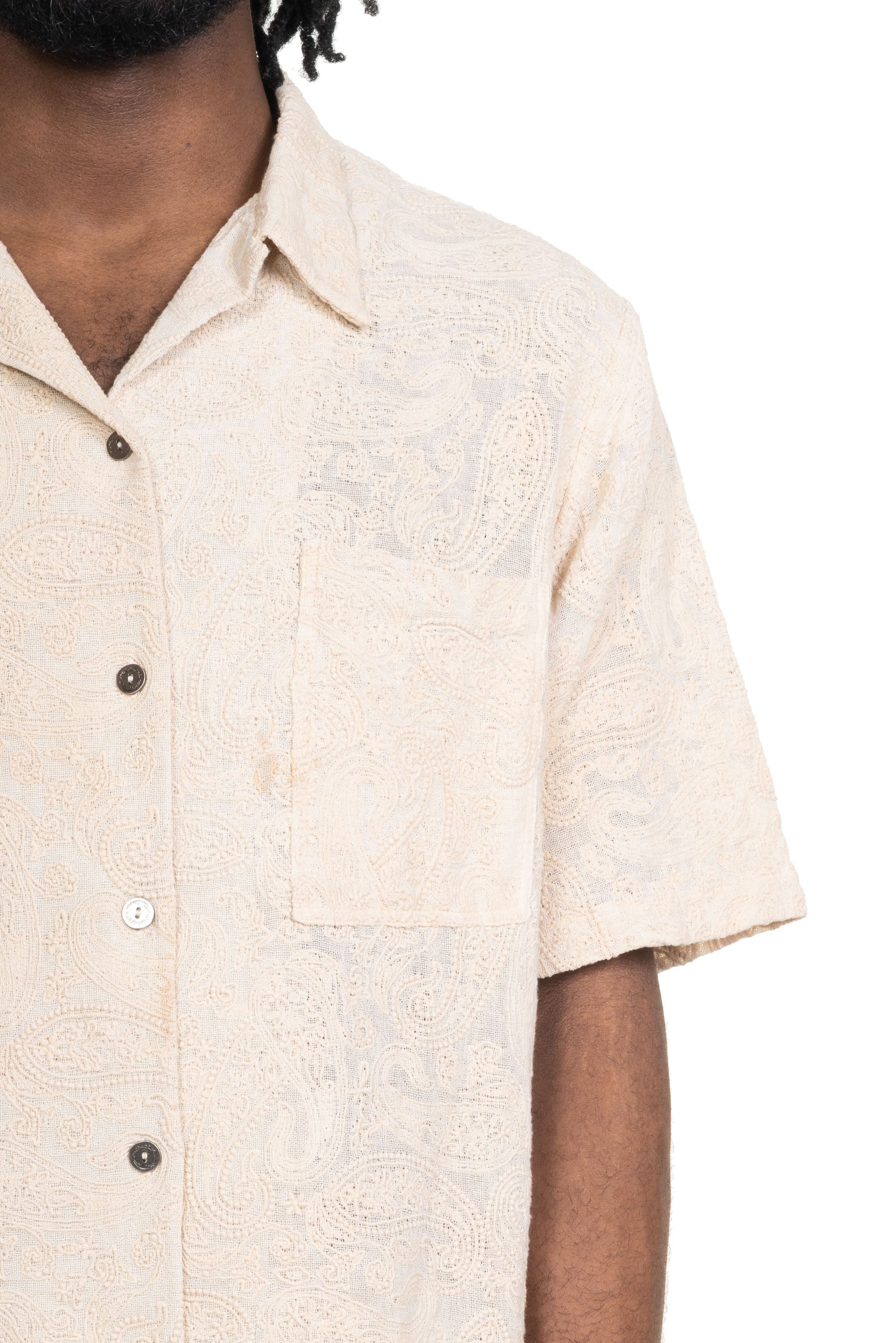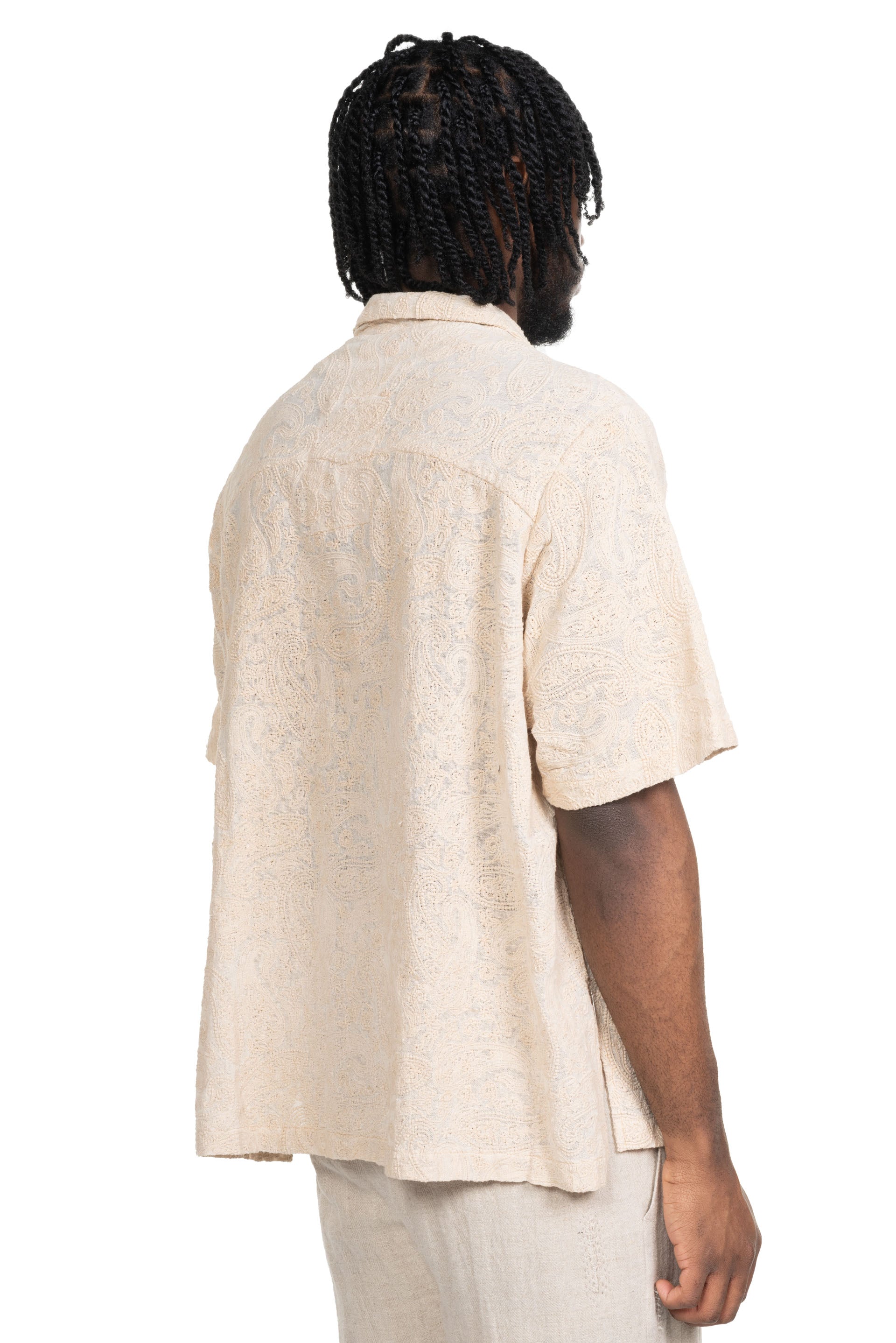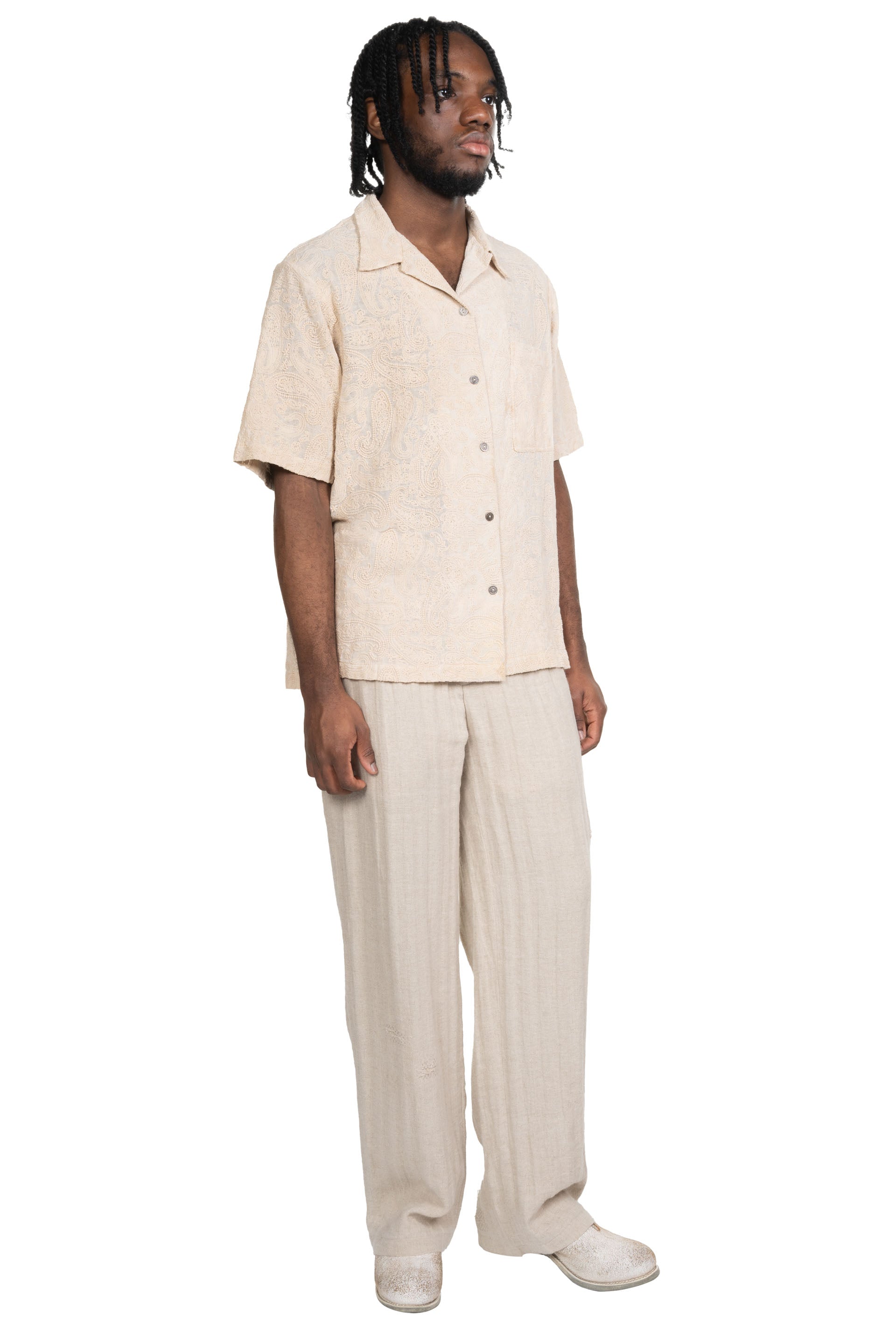 Professor e FM Exclusive Frayed Shirt Beige. Short sleeves. Button closure at front. Boxy cut. Dry feel frayed linen fabric. Hand-dyed.