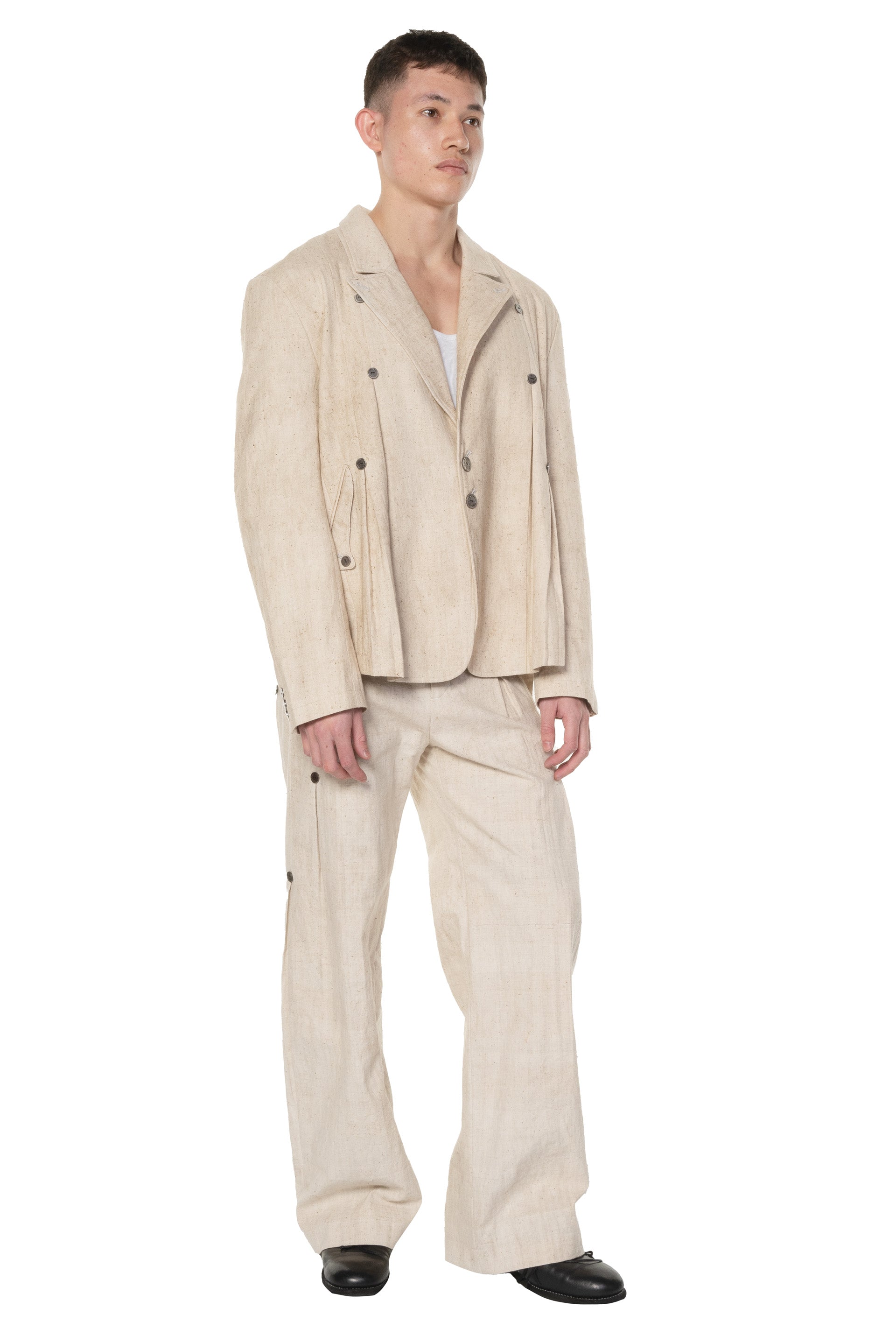 Professor. E Forgotten Materials E Jacket. Linen blazer. Two button closure at front. Forgotten material metallic buttons details throughout. Pleats details at front and back. Two front pockets. Lined with signature lining. Boxy fit.