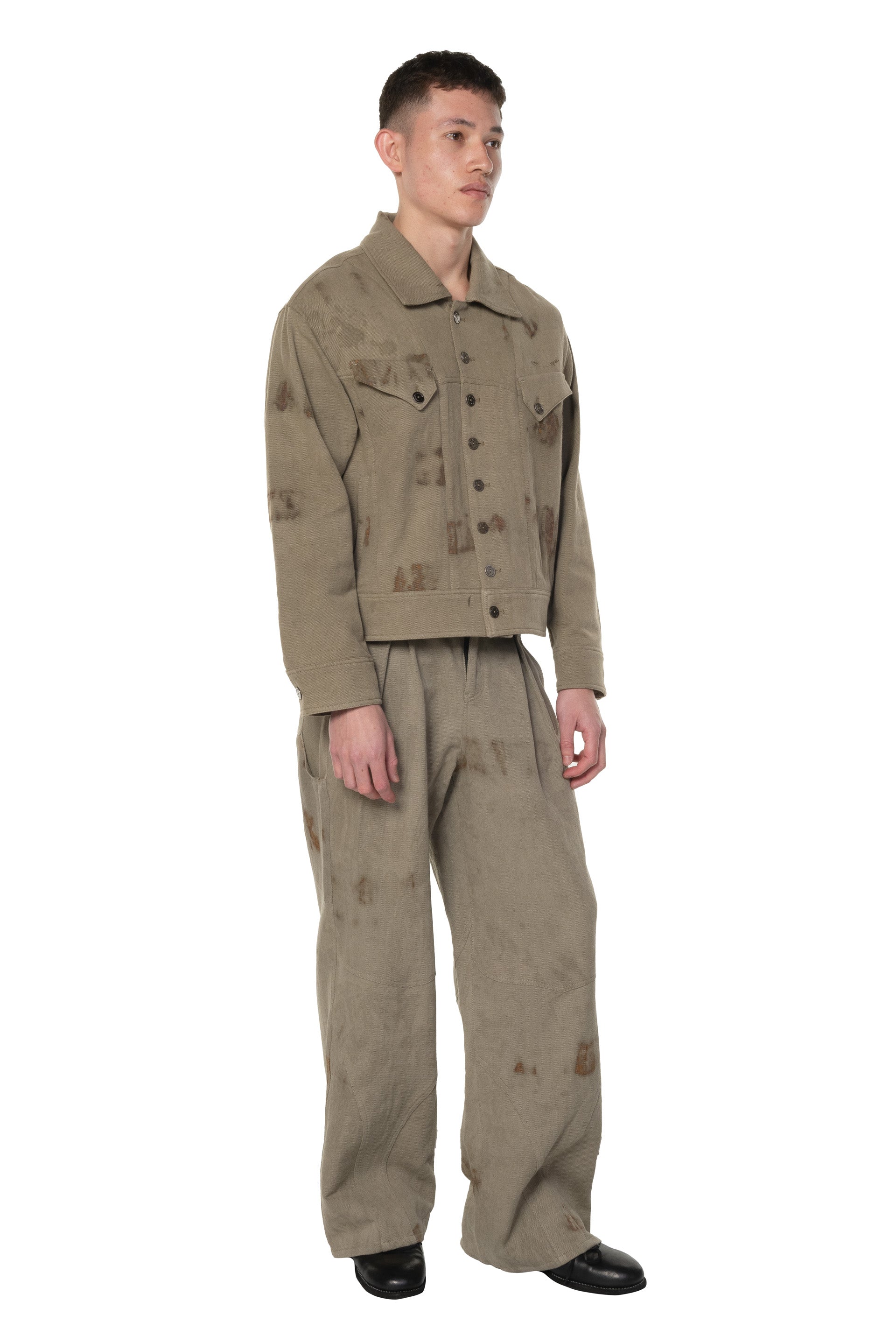 Professor. E Forgotten Materials E Type 03 Jacket. Boxy cut cotton jacket with distressed details throughout. Button closure at front. Long sleeves. Two pockets at chest. Two side pockets. Signature rust dyed details throughout. Forgotten Material metallic buttons throughout. Button at cuffs. Buttons at back.