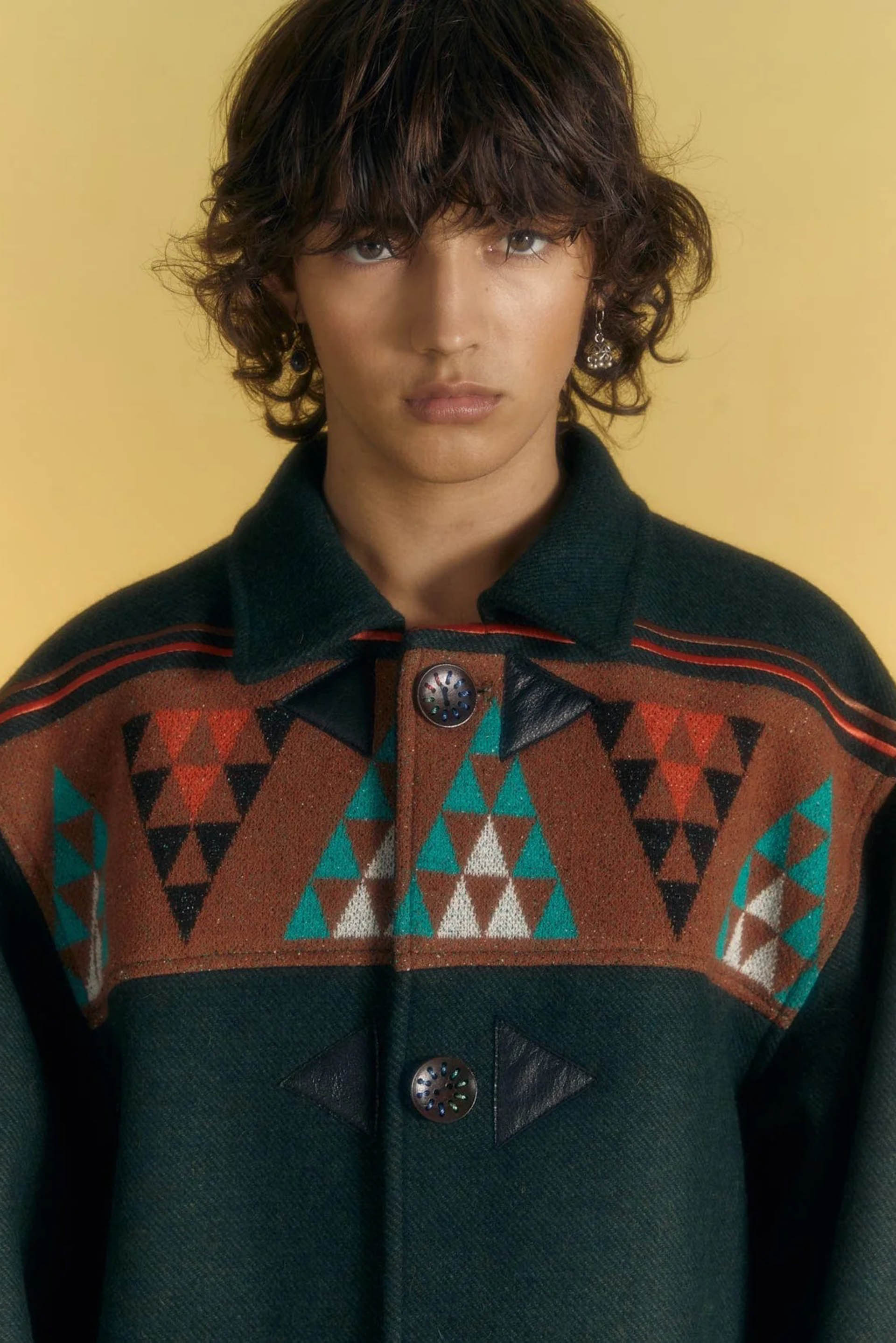 Long Sleeves. Oversized silhouette. Wool blended knitted fabric. Embroidery stripe at front. Knitted fabric. Cow Leather patched. Patch pocket. Embroidery stitch detail button