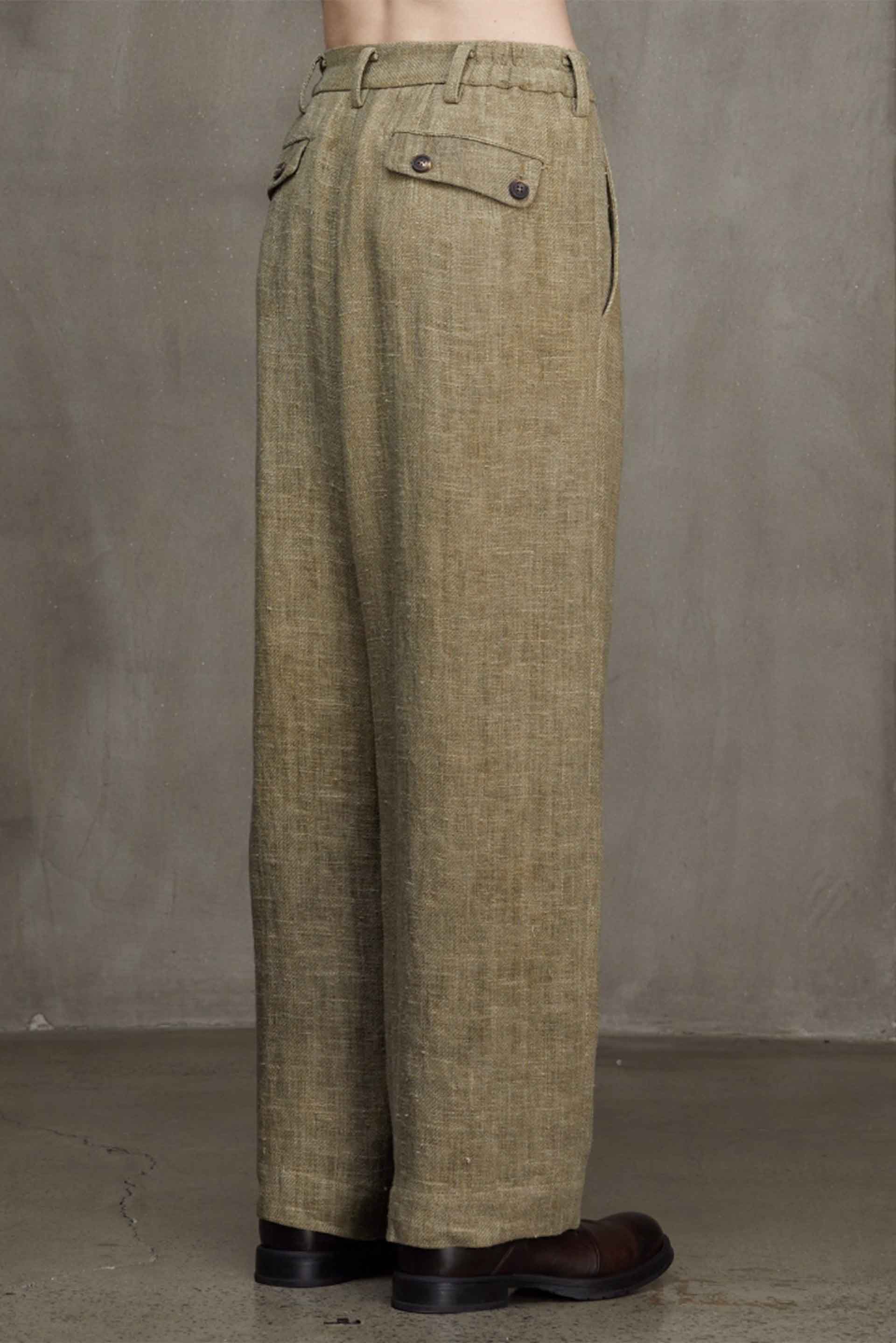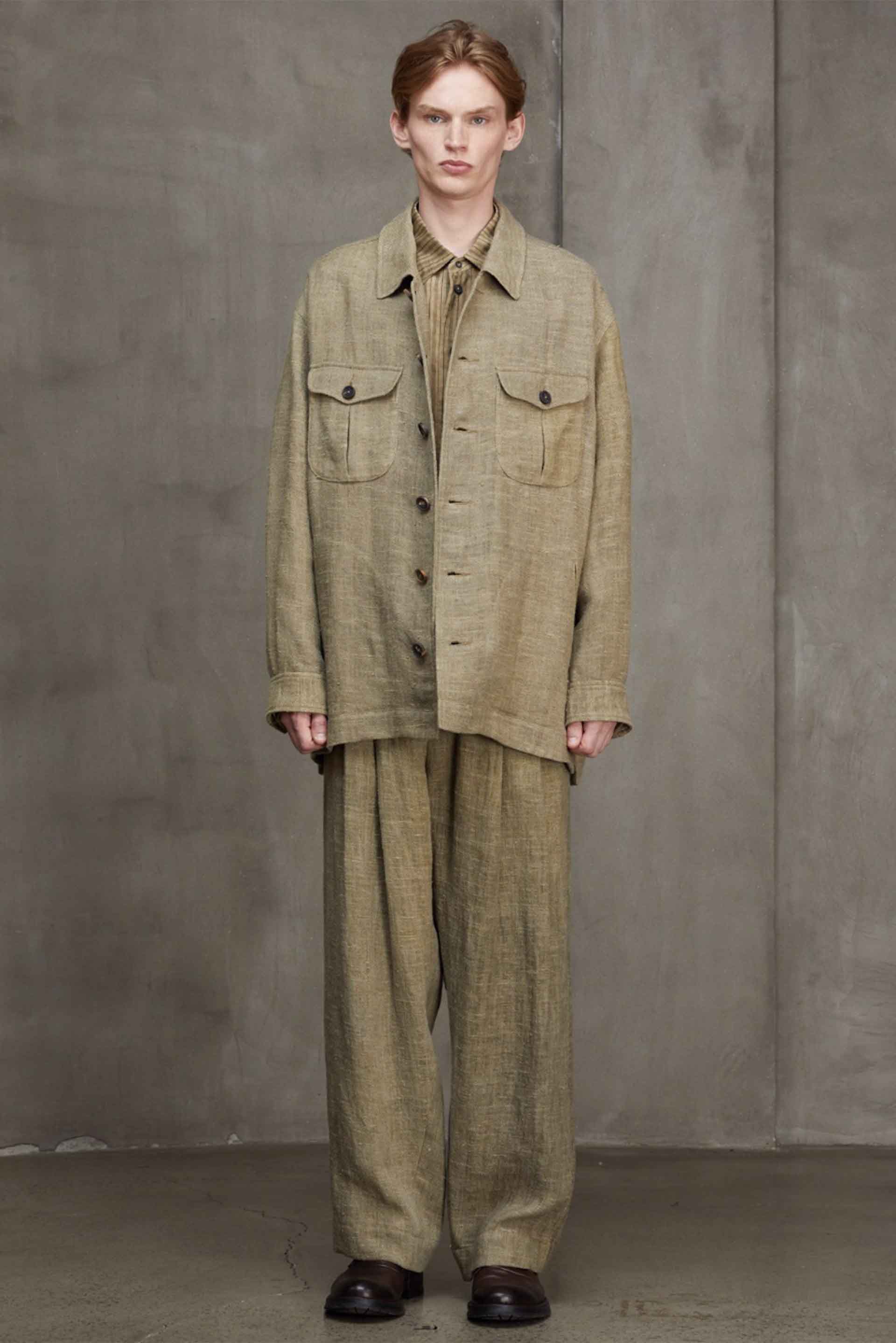 For Ziggy Chen Interlude III collection, Ziggy Chen continues his multifaceted research of fabrics and structures, creating garments that revolve around the concept of life and spontaneity. Old book covers and old pieces of fabric-from his private collection-were cut and reassembled to bring the motif to life. Referencing both century old Chinese and European silhouettes Ziggy Chen is a brand that is carving its own path within the industry as seen with the Front Pleat Trousers Faded Olive.