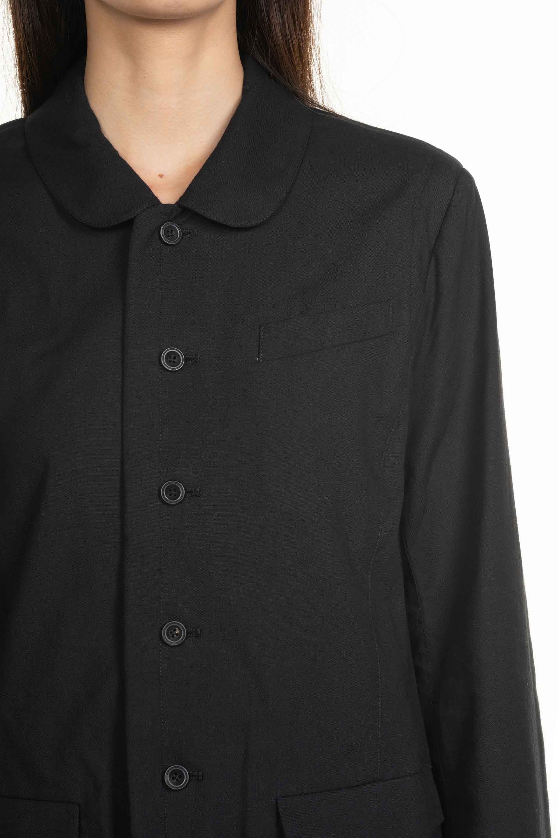 Black Gathered Shirt from Professor e. Long sleeves. Button closure at front. Pleated at front and back. Button at cuffs. Panelled construction. String details at back at front.