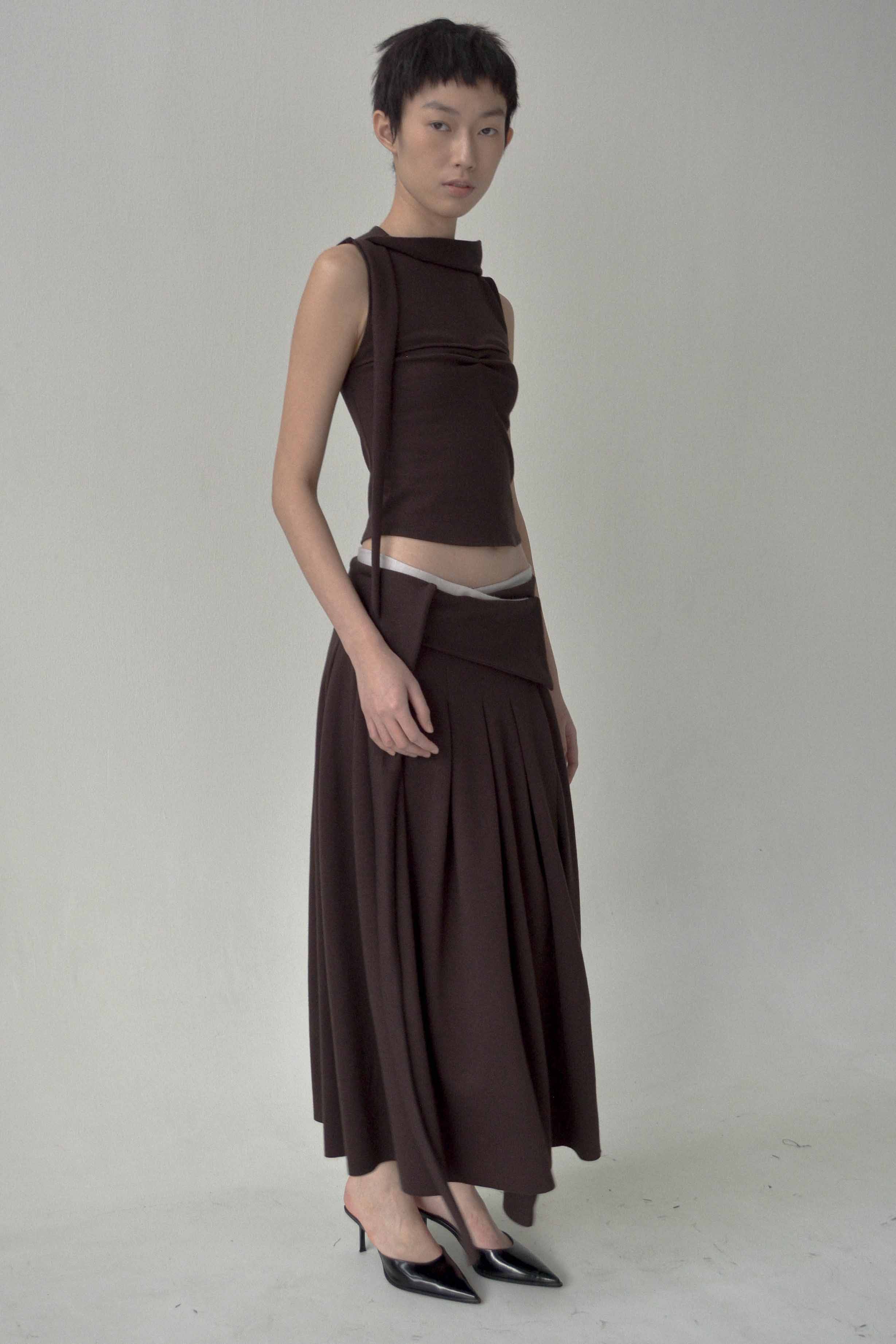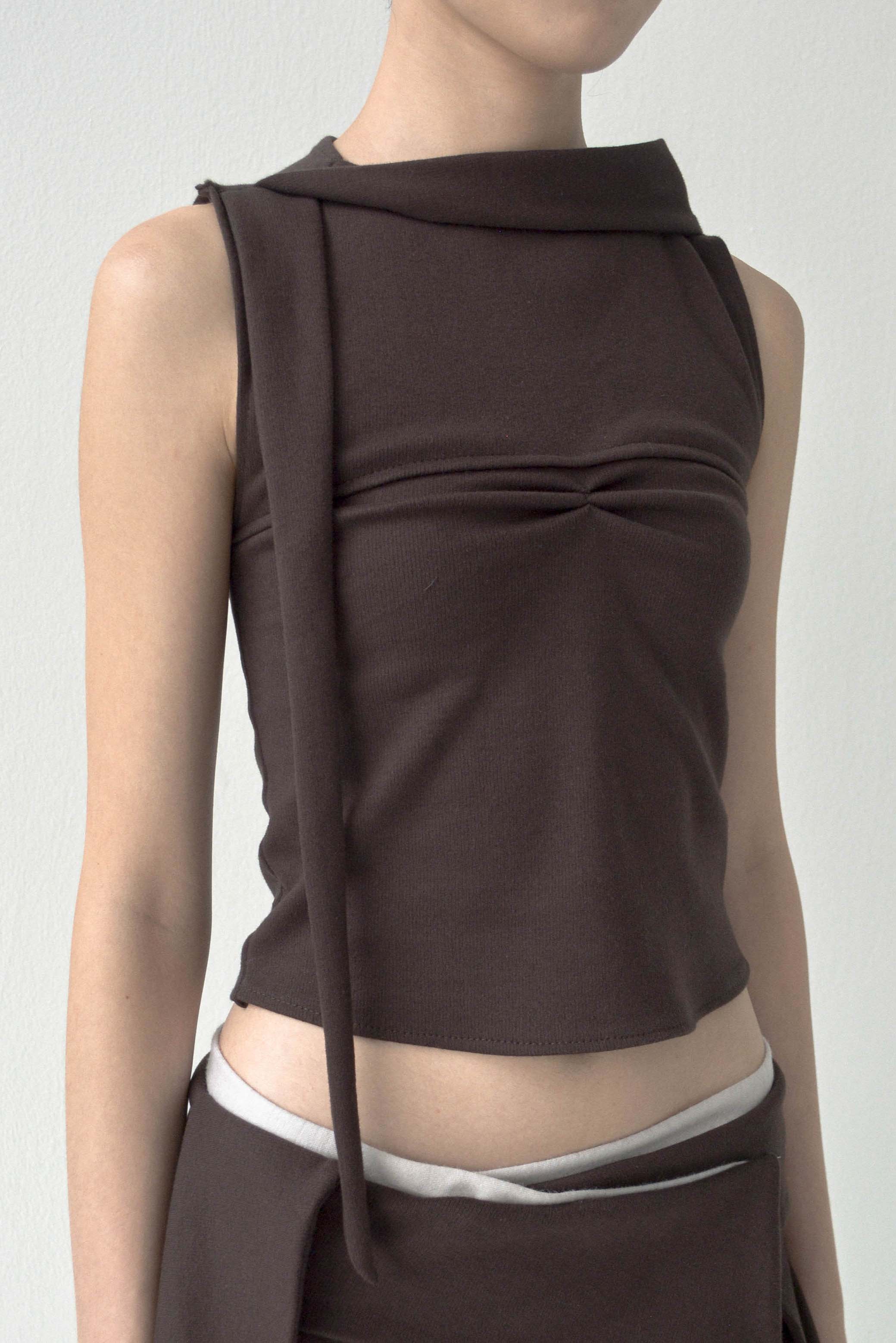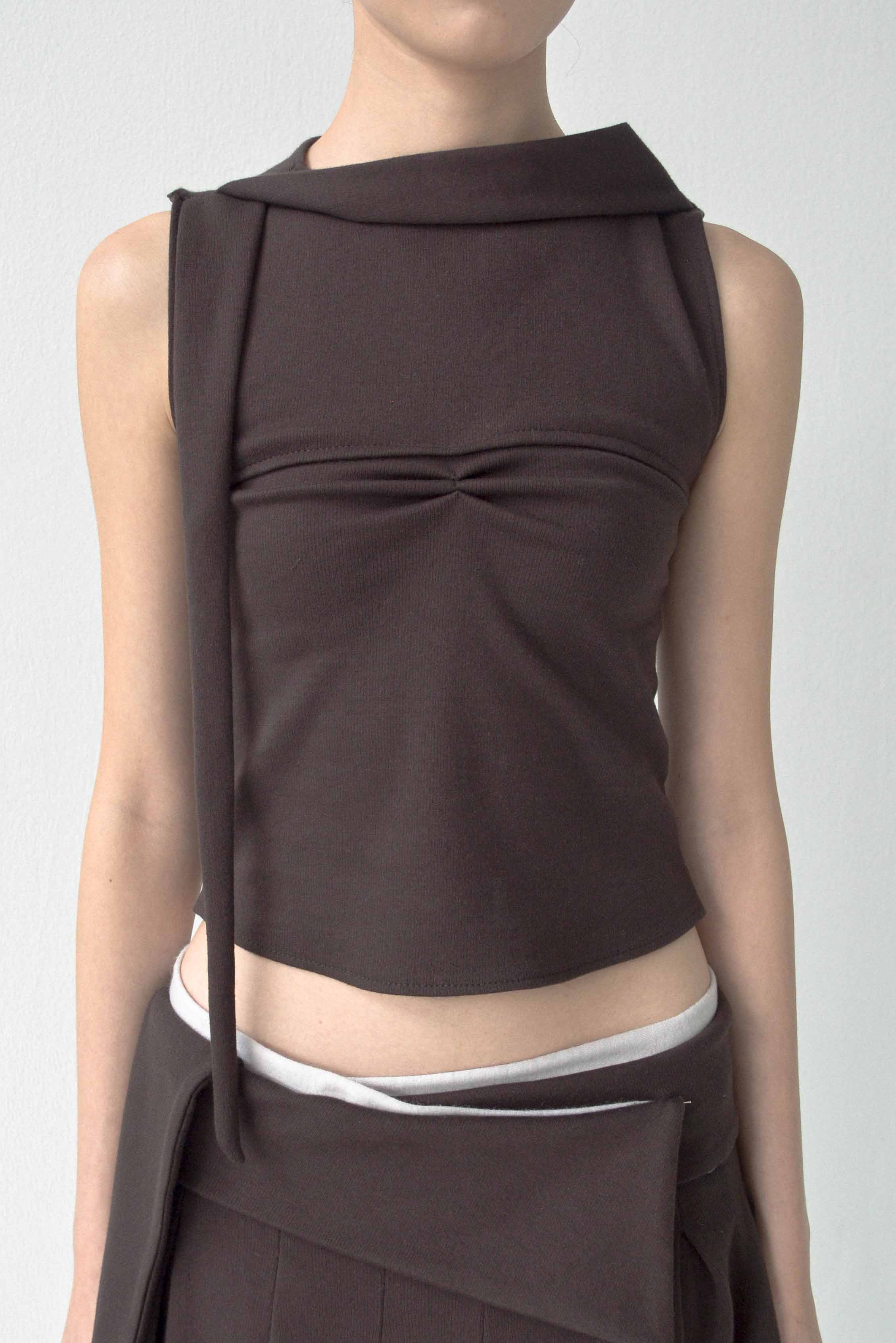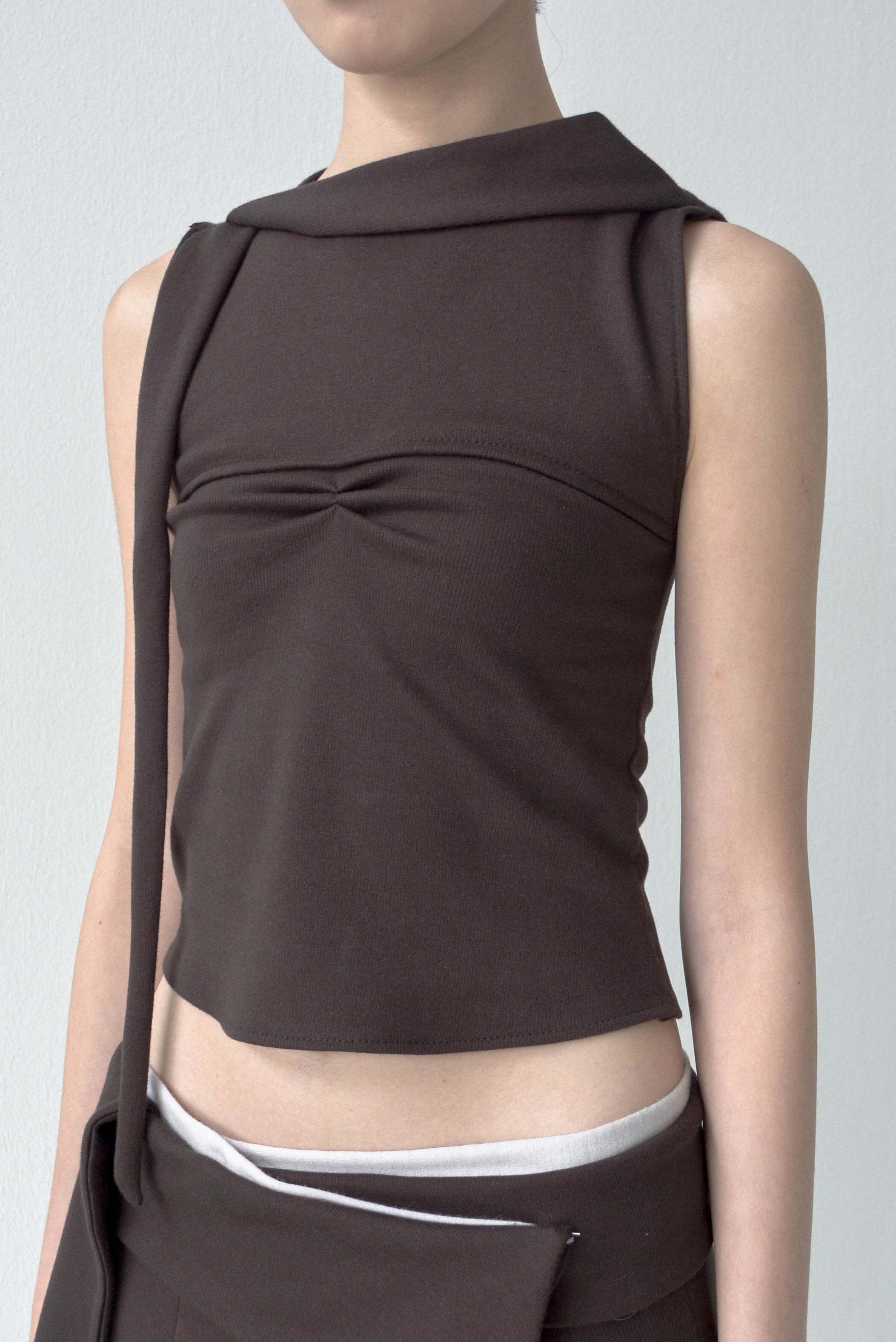 Caro Chia continuously explores intriguing forms that are then brought to life through innovative shapes and pattern cutting techniques. Caro Chia is known for her experimental construction combined with making textiles engineered to form sculptural embellishments in subtle colour ways as seen with the Genheim Top Brown.