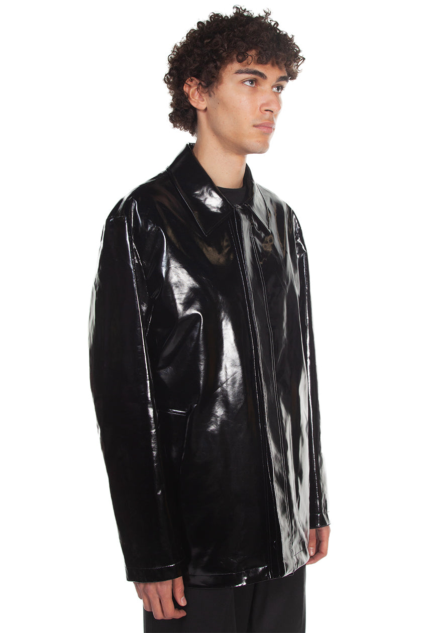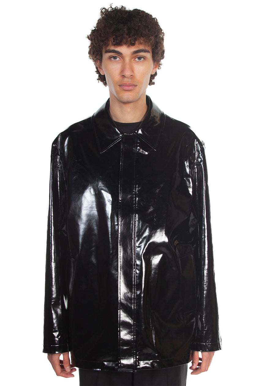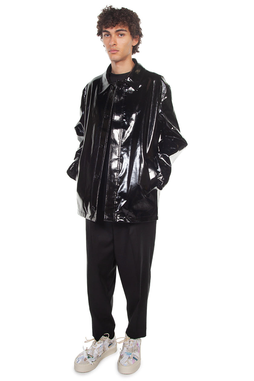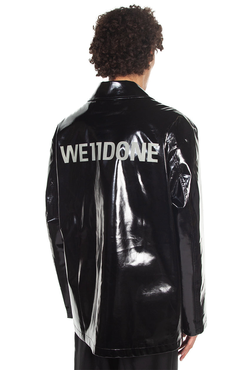 We11done merges late 1990s and early 2000s aesthetics creating a feeling of futurity. Functional, sportive, and sleek, We11done’s versatile designs refine classic elements into contemporary lifestyle pieces as seen with the Faux-leather. Logo print to the rear. Classic collar. Concealed front fastening. Long sleeves. Two side slit pockets. Straight hem. Fluorescent branding at back.