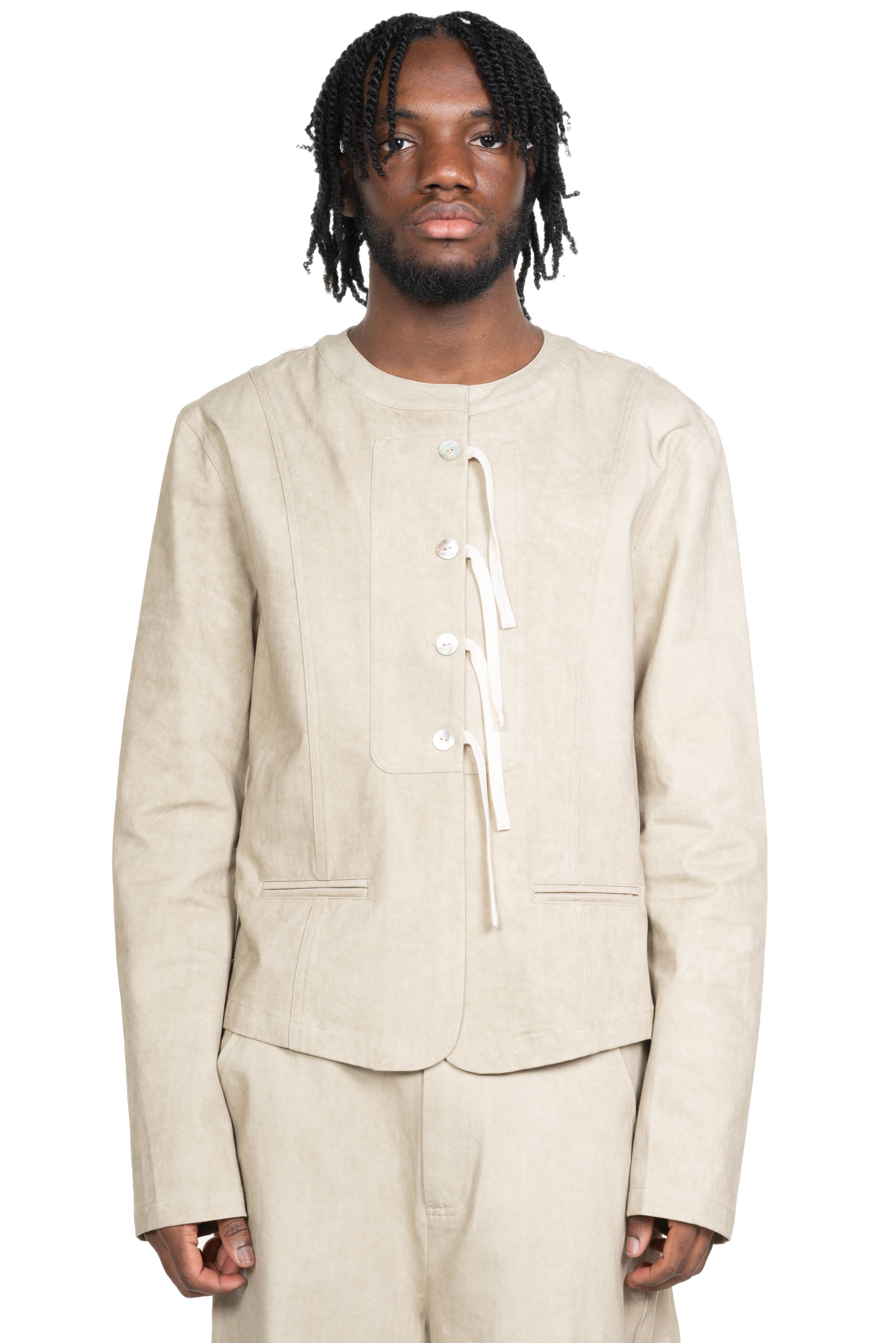 Aenrmous Gone Jacket in Cream. Long sleeves. Round collar. Button closure at front. String detail at front. Two side pocket. Boxy cropped fit.