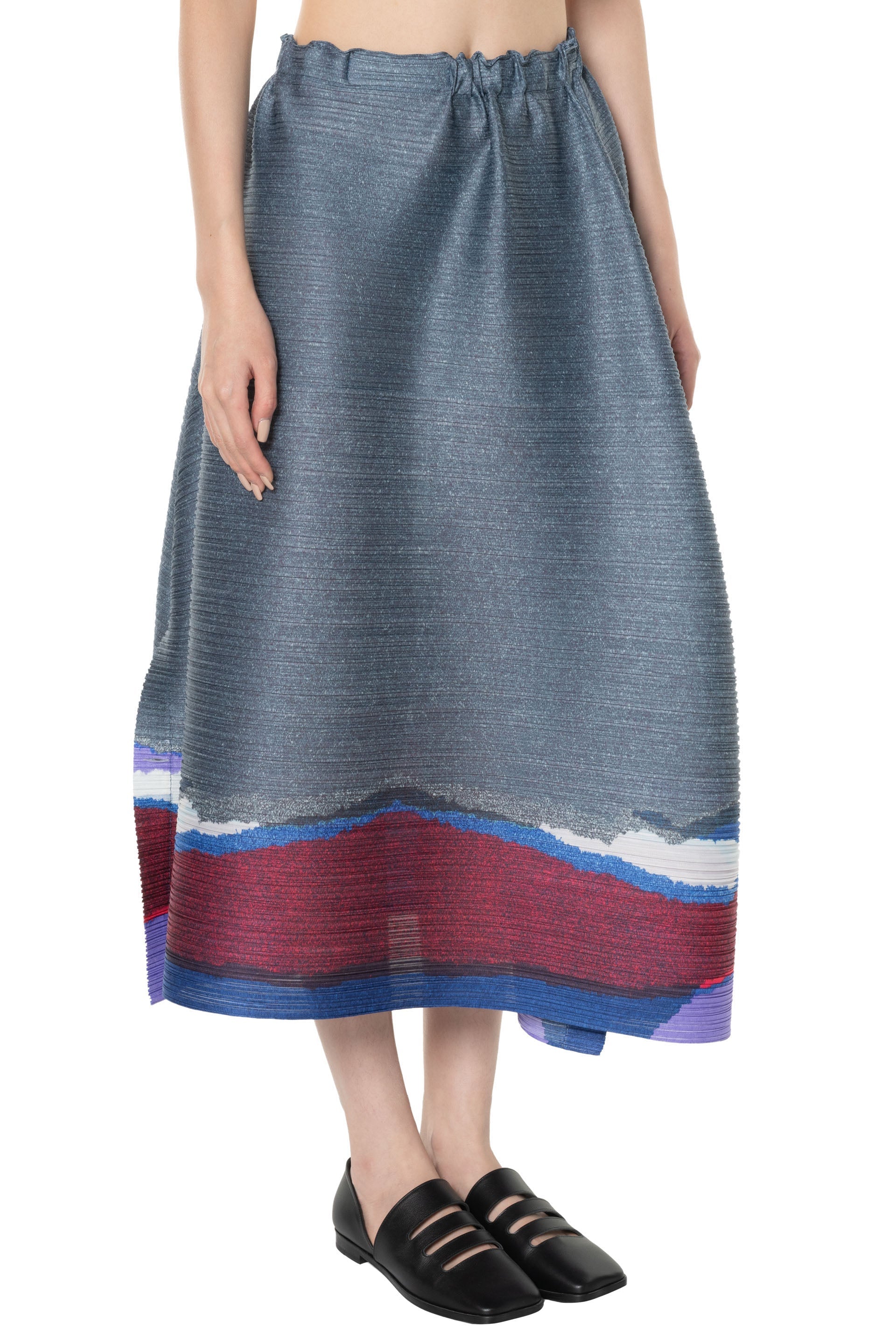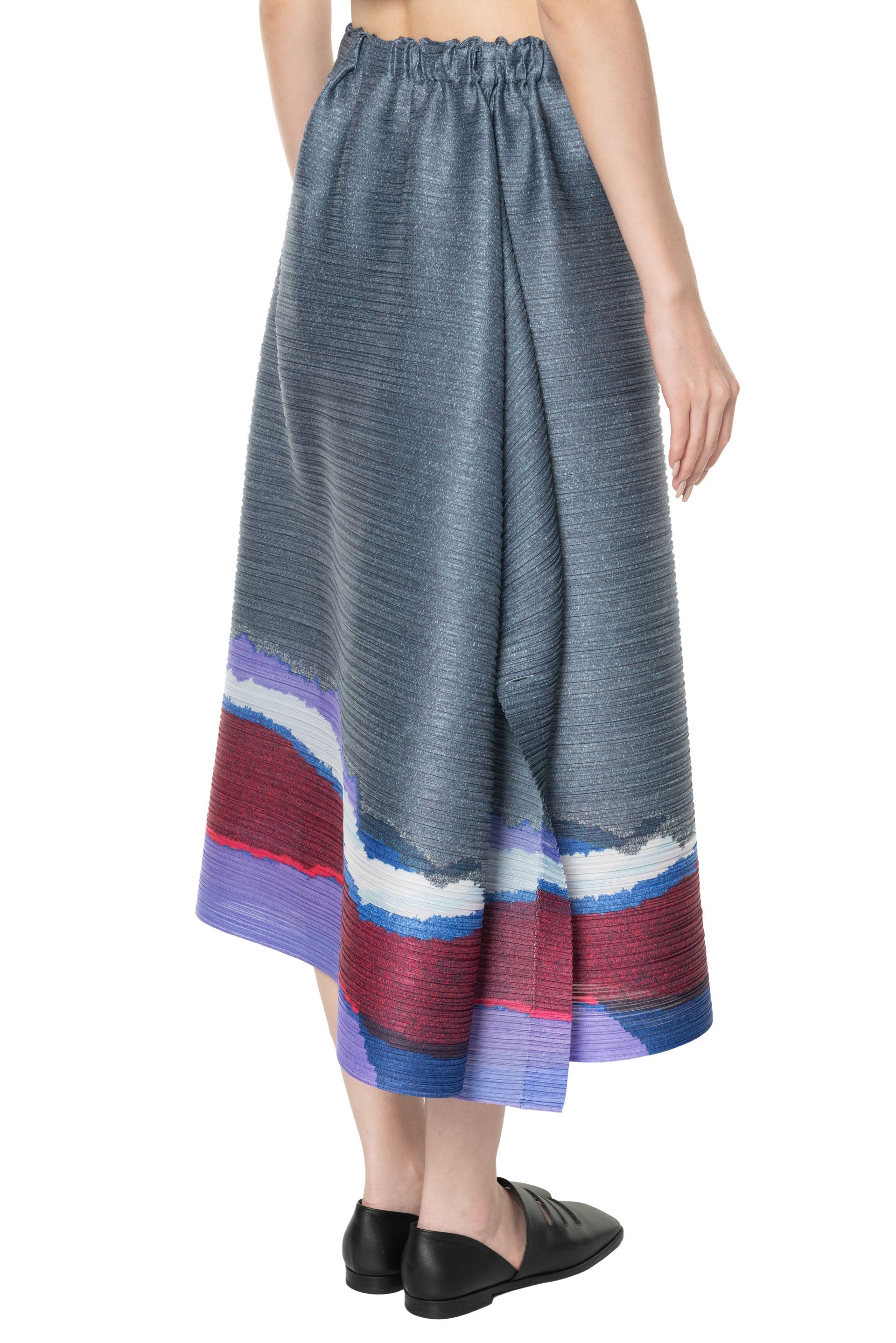 Pleats Please is crafted from a single thread, then creases are added after the clothes have been sewn into shape offering a combination of convenience, comfort and coolness. Pleats Please designs are simple with a strong silhouette as seen with the Grainy Colors Skirt Dark Blue Grey.