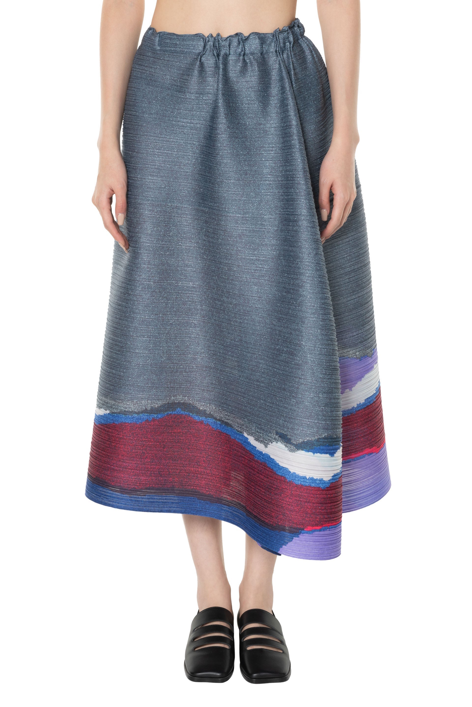 Pleats Please voluminous pleated midi skirt in dark blue grey has an elasticated waistband and high slits with a two-button closure.