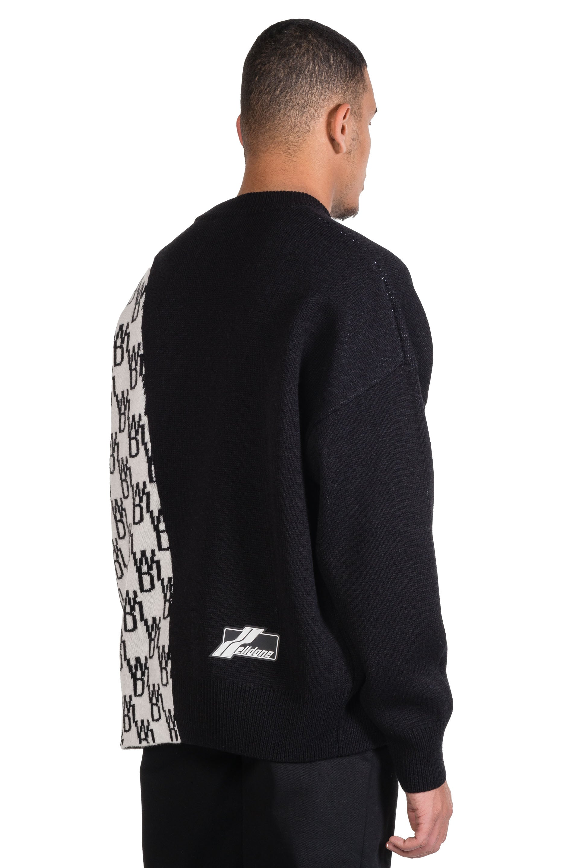 Paneled knit acrylic and wool-blend sweater. Rib knit crewneck, cuffs, and hem. Dropped shoulders. Rubberized logo patch at back hem. Jacquard knit logo throughout.