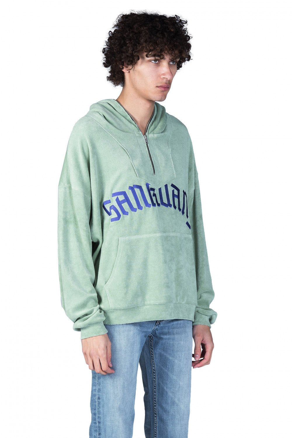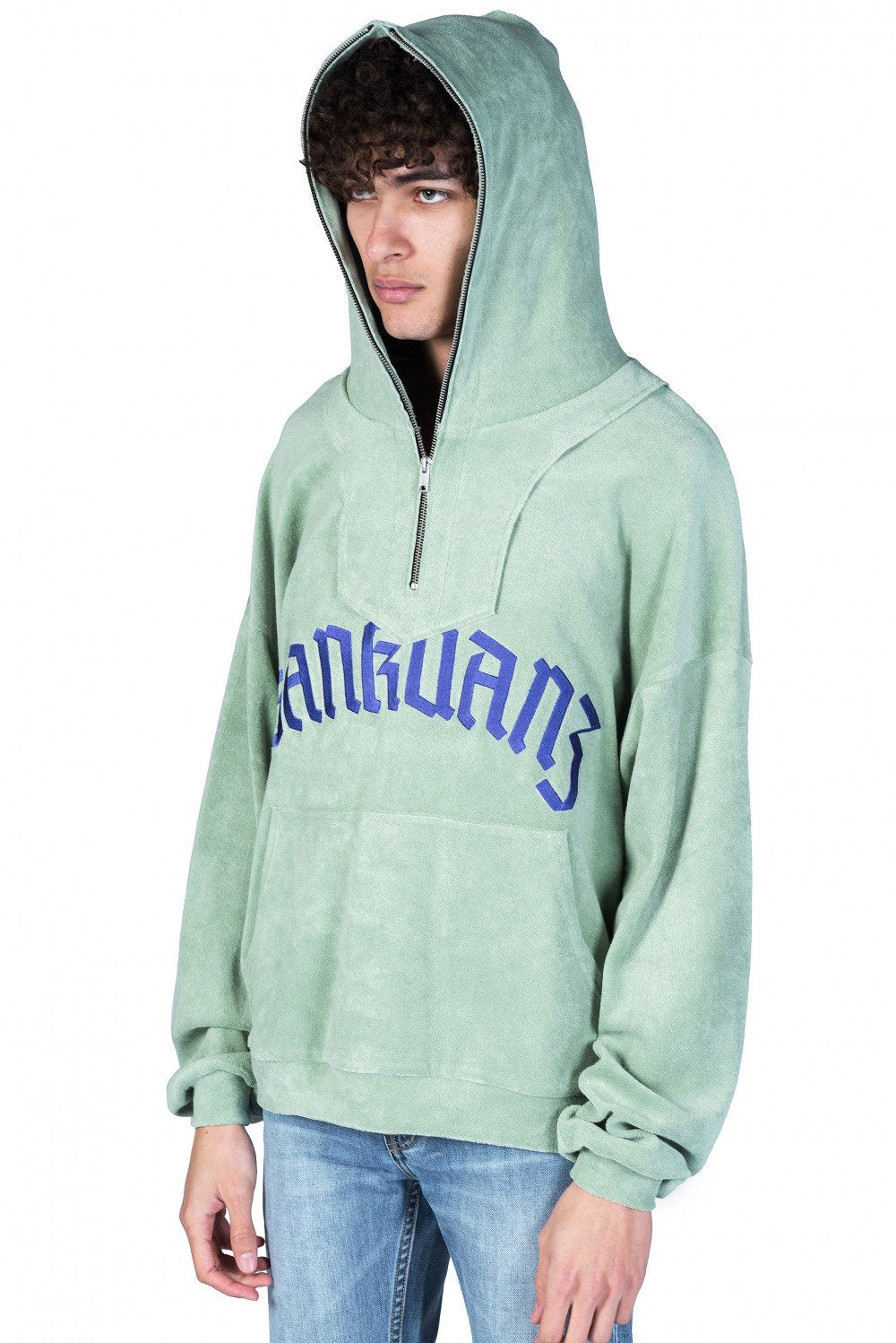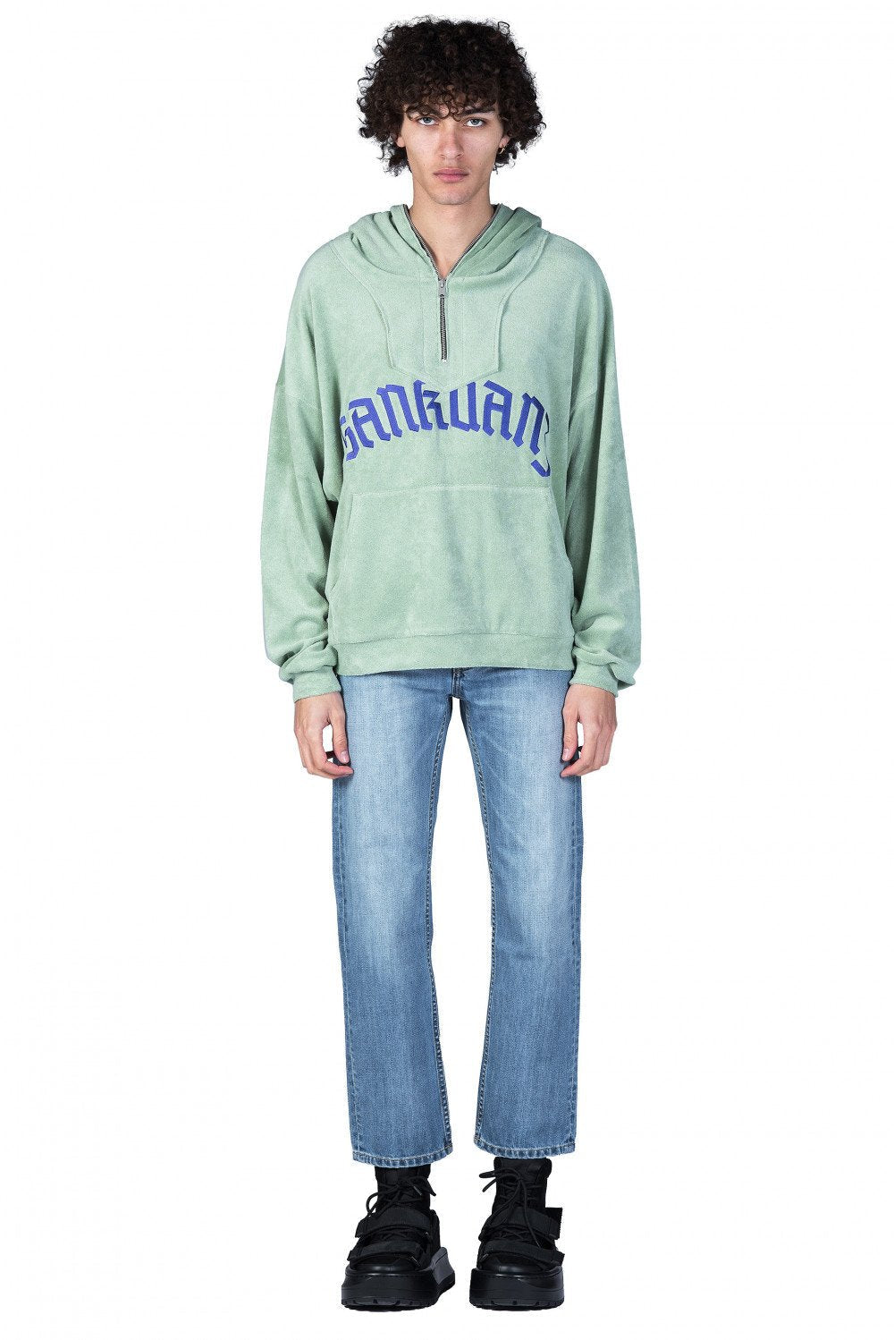 Innovative designs take centre stage in the Sankuanz collection at UJNG. Experimental shapes and offbeat graphics create a flamboyant, boundary-pushing look. Find a vibrant colour palette and bold use of textures. Architectural pieces with unexpected embellishments enhance the eye-catching nature of this edit, as seen in the Green Logo Hoodie.