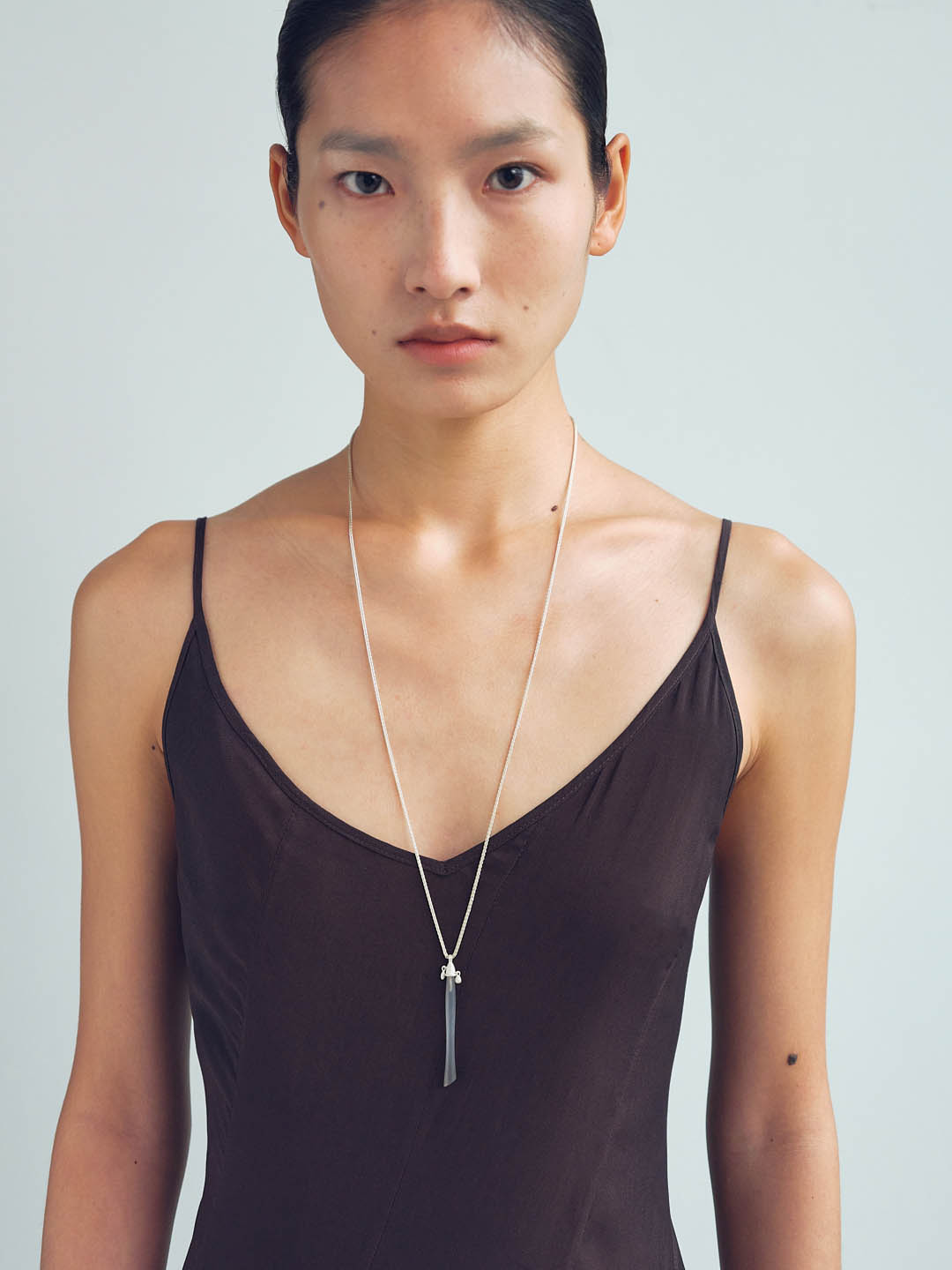 OLIO E ACETO is raw and authentic. It is about the companionship between people, and objects like the matte white surface becoming a blank canvas to be filled by the wearer as seen with the Grey agate Pillar Long Necklace.