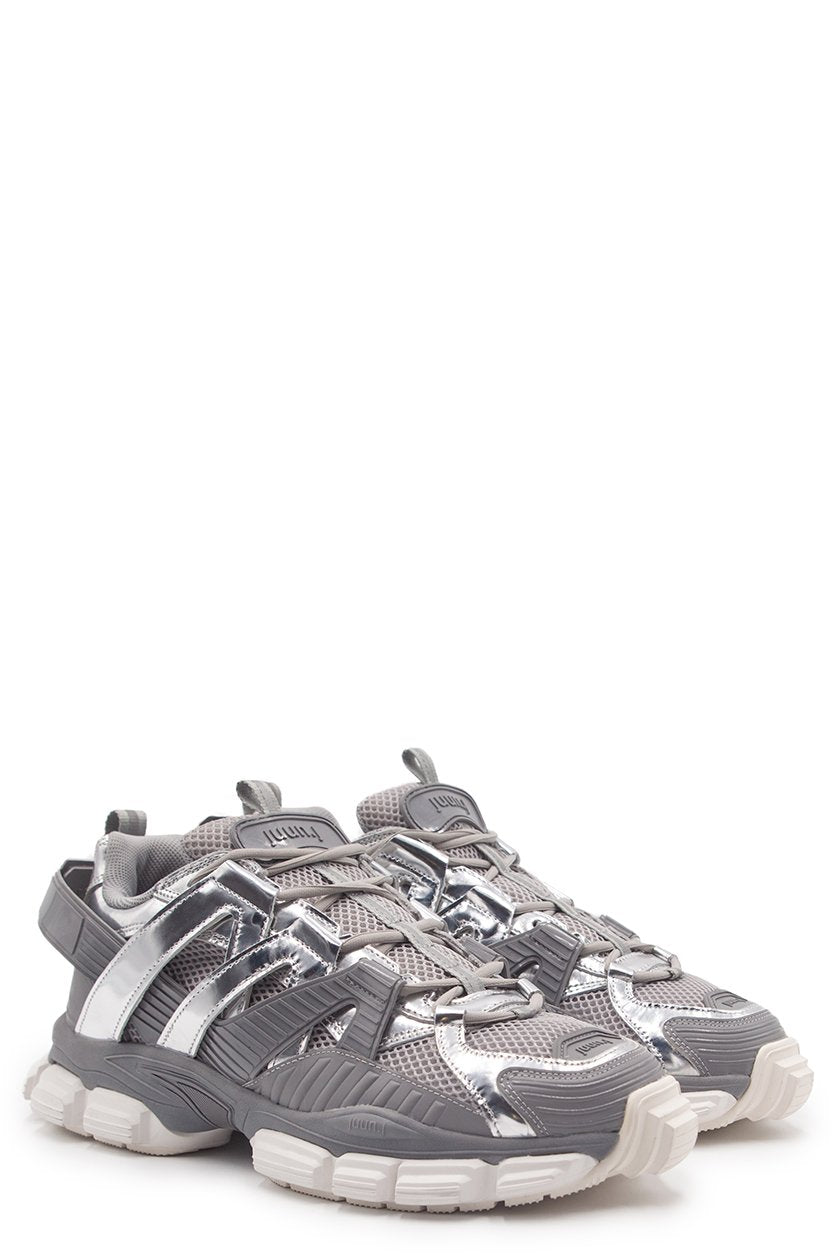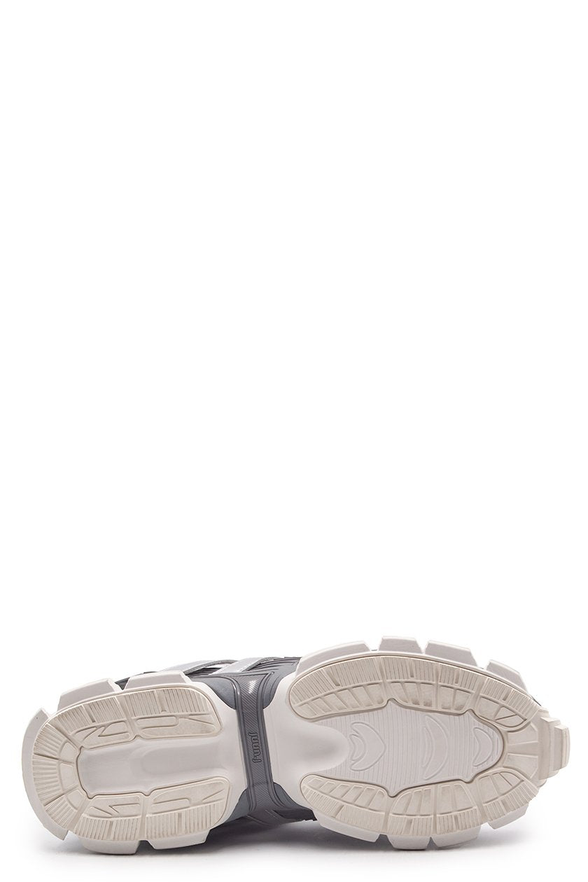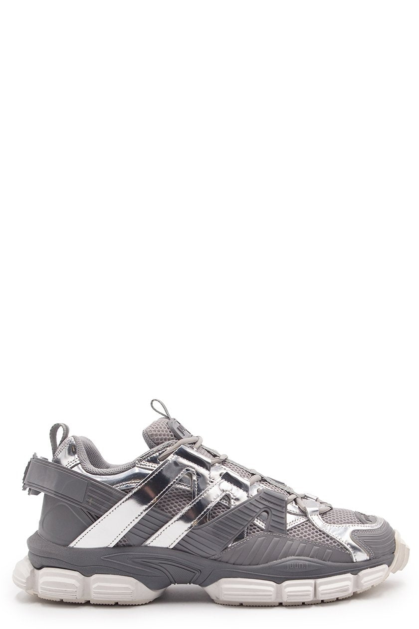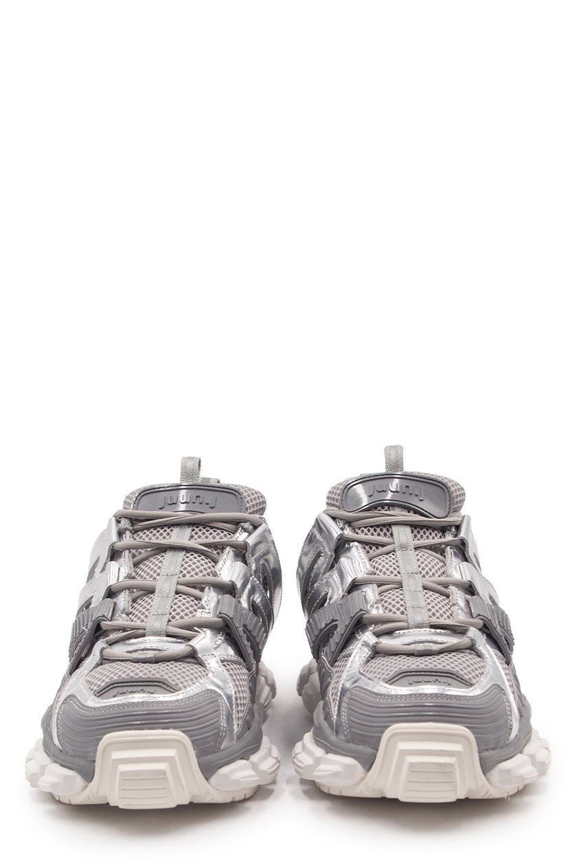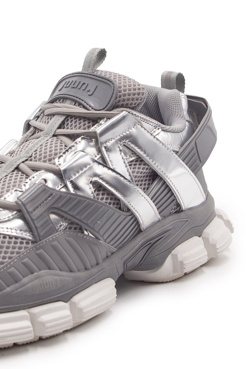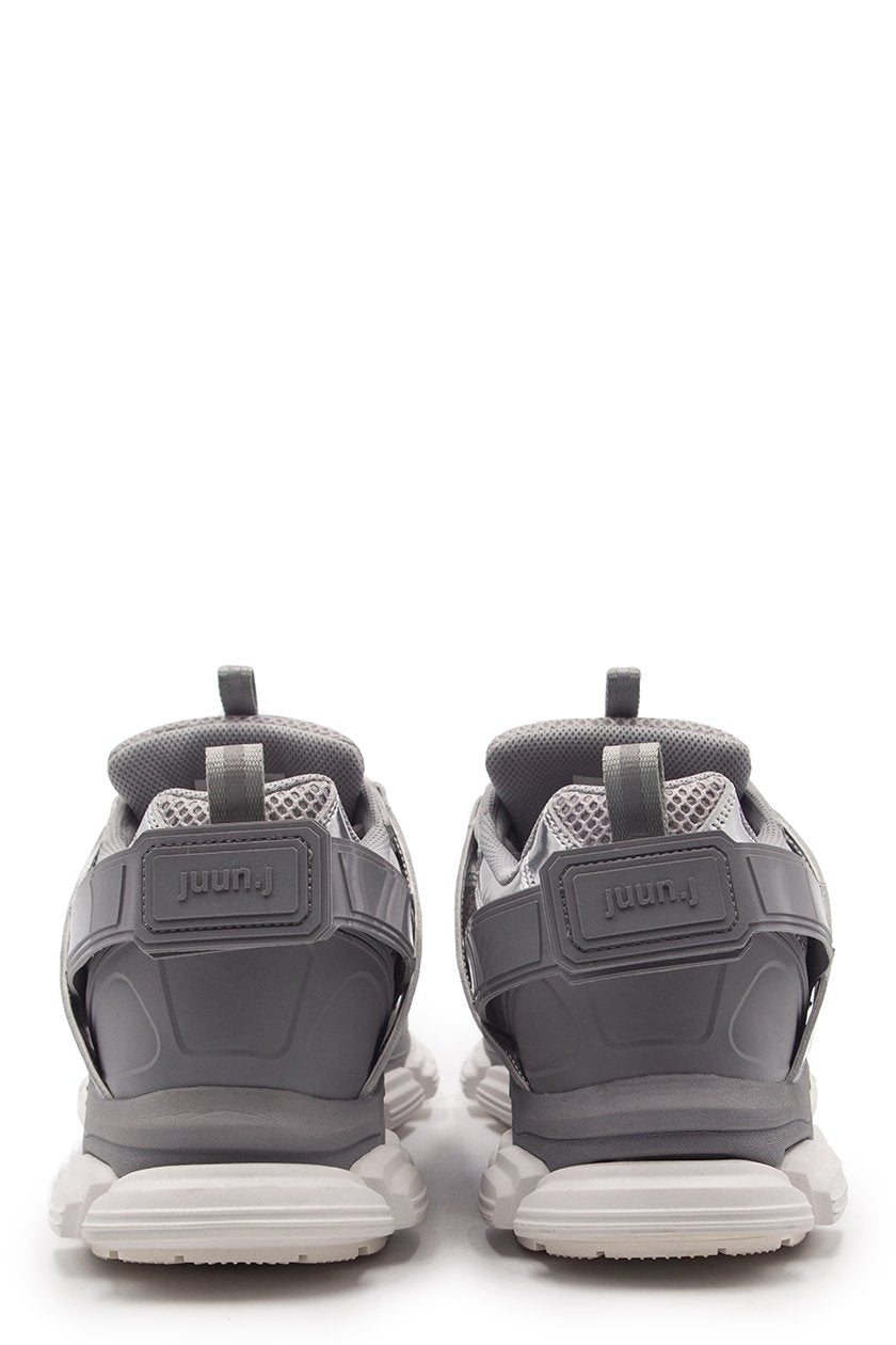 Grey panelled chunky sneakers from JUUN.J. Panelled design. Logo print to the rear. Logo-print tongue. Almond toe. Front lace-up fastening. Pull-tab at the heel. Branded insole. Chunky rubber sole.
