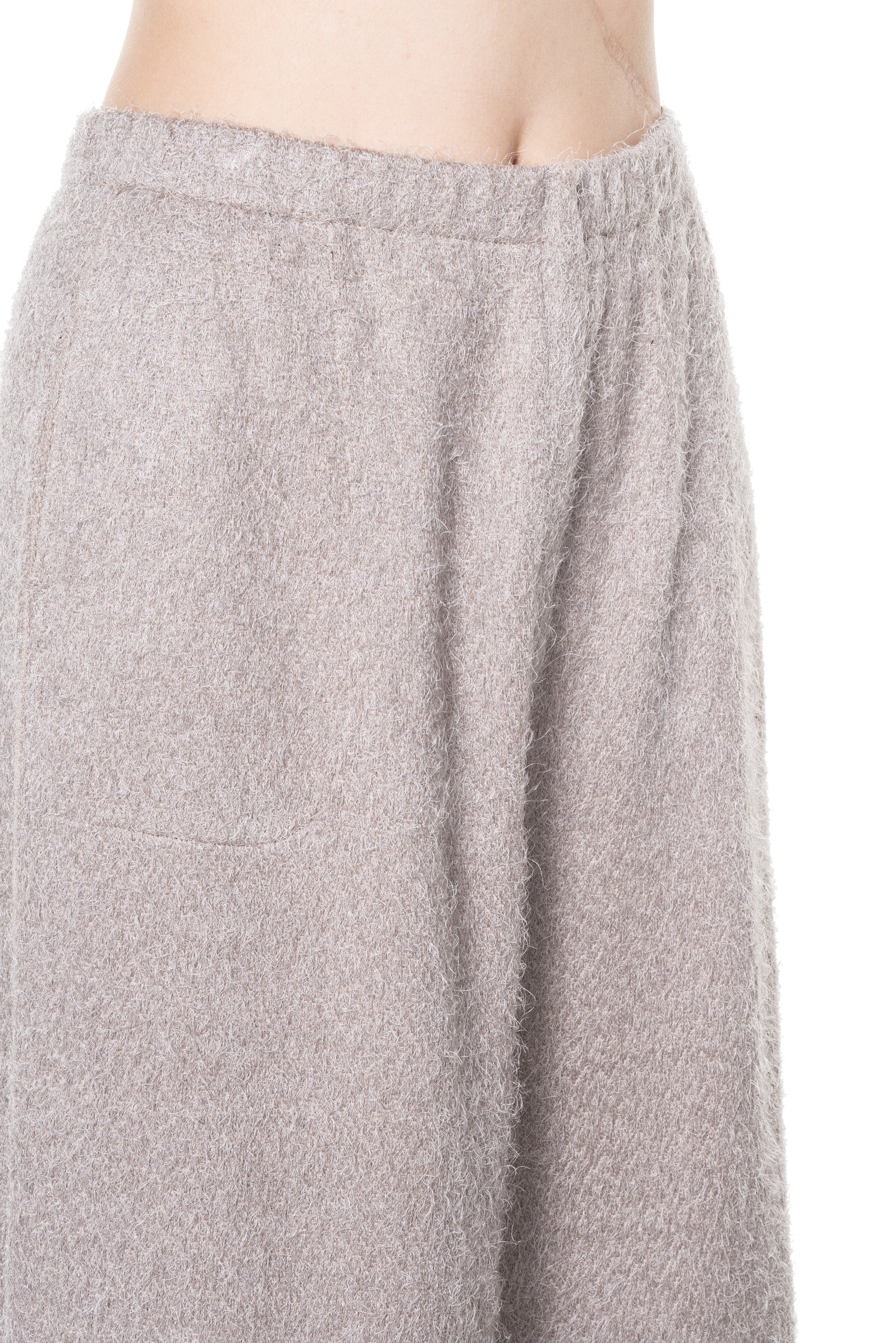 Boboutic consider knits an ideal medium, since its versatility allows conceiving unique surfaces and unexpected shapes. The approach to knitwear is unpredictable, aiming at creating a product where materials and structures compensate each other as seen with the Grey Pink Skirt Pants.