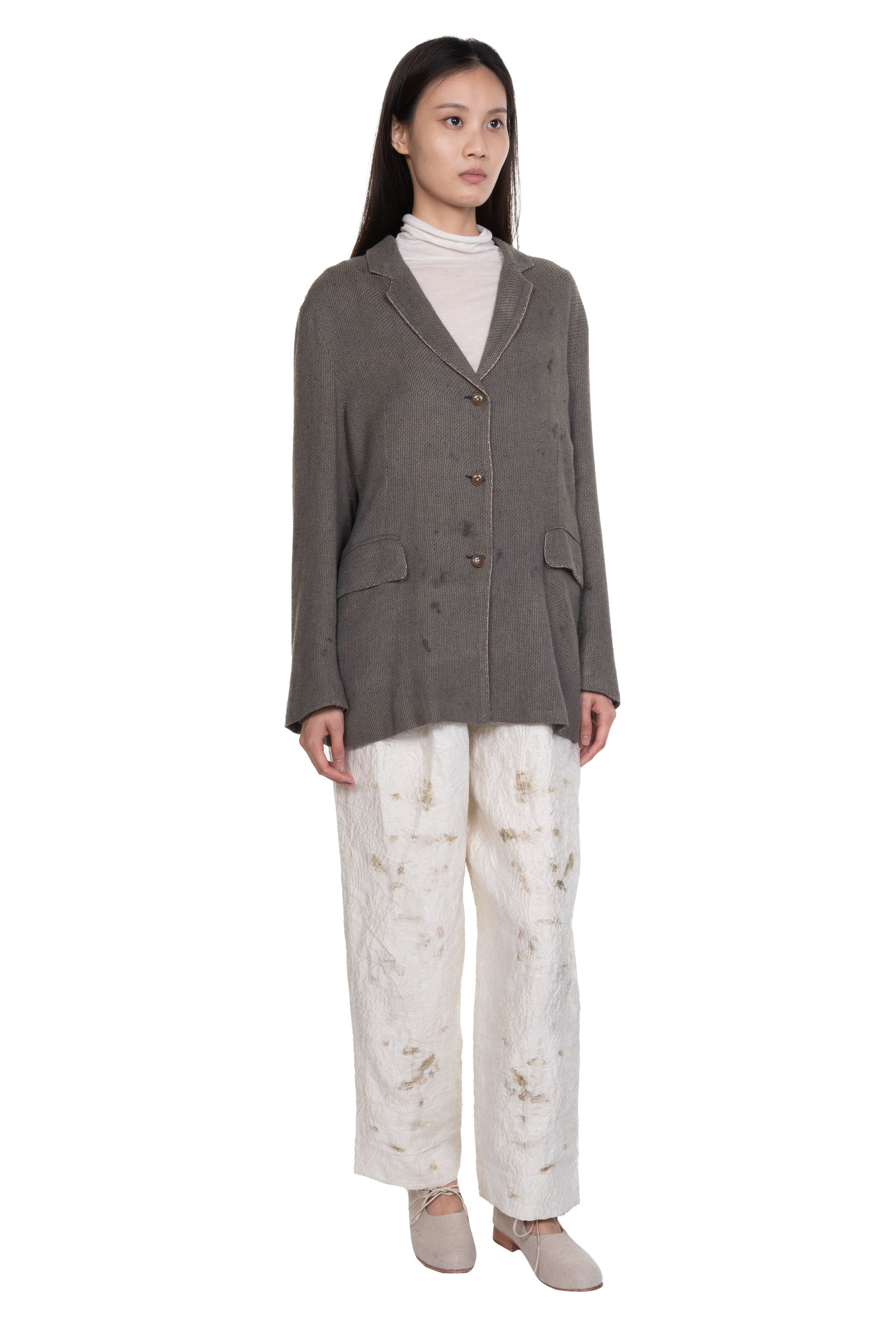 Yu Qun believes that everyone's character is multi-faceted and expressing spiritual independence. Fine hand-stitched threads, old mottled colours and patterns, and unconventional cuts are what Mute Dance has been exploring. The leaves and stems of fresh plants and berries, dried medicinal materials, old metals and so on are combined with the ancient and traditional dyeing technology to dye fabrics and paper as seen with the Grey Silk Jacket.